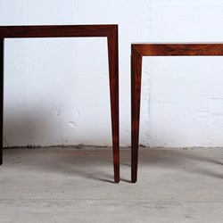 Gorgeous pair of nesting tables in rosewood with beautiful grains. True to most of Hansen's pieces, this design features his hallmark triangular joints which are so flawlessly executed. The legs and solid rosewood. This piece would be a unique addition to any modern environment.