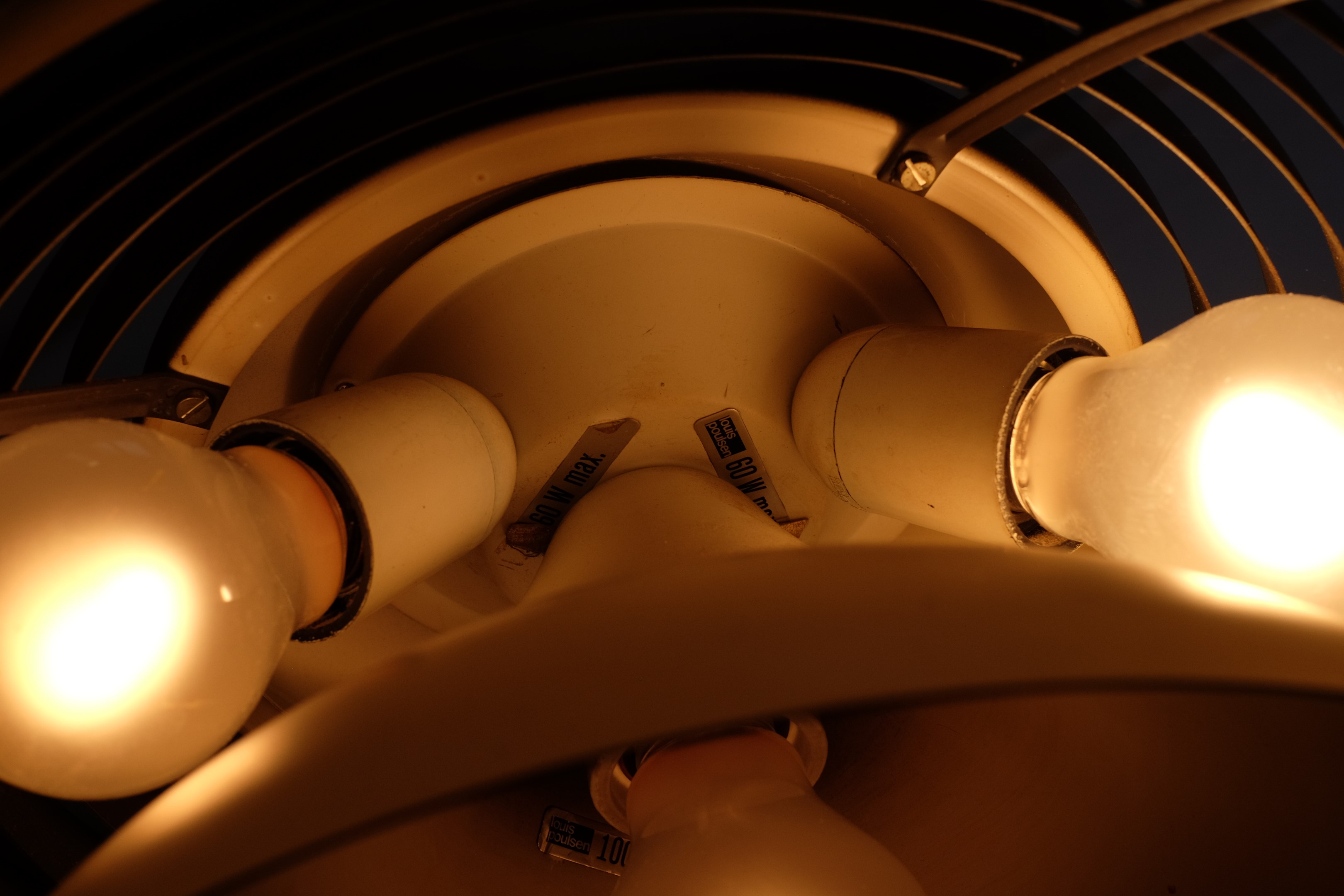 Grey lacquered metal shade with a white lacquered inner shade that diffuses the light and makes it very suitable above a dining table. It provides a great light.