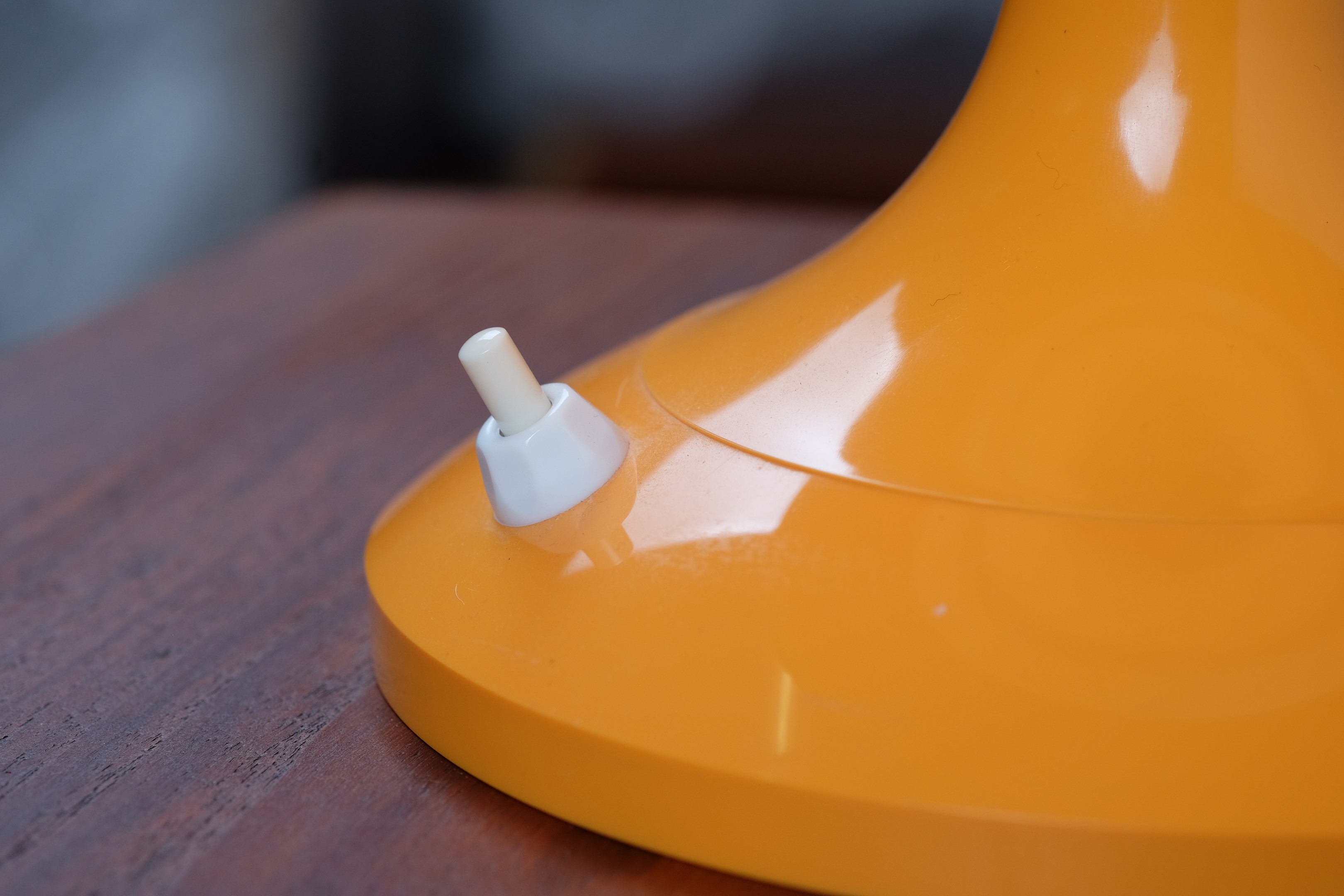 Just look at this beauty! One of Bent Karlby's spaceage lamps that has hit the timeless design and almost fits in everywhere. With its fungus-shaped shape and round screen, it sheds a comfortable and cozy light. The beautiful orange color appears when the bulb is on and you can see the light through the screen. Fantastic lamp of a fantastic designer! Diameter 25cm