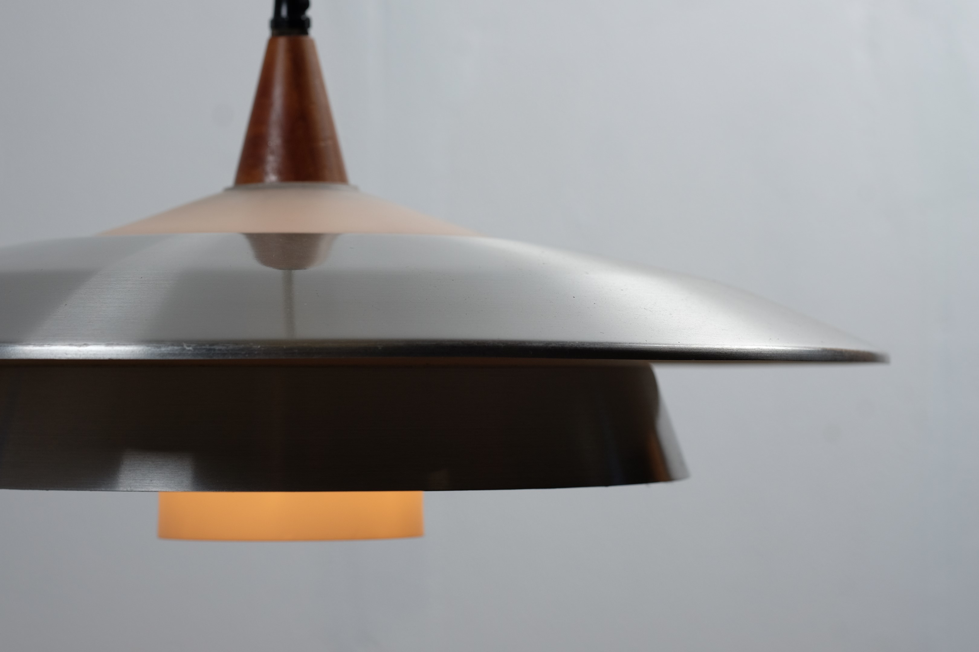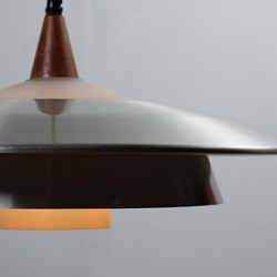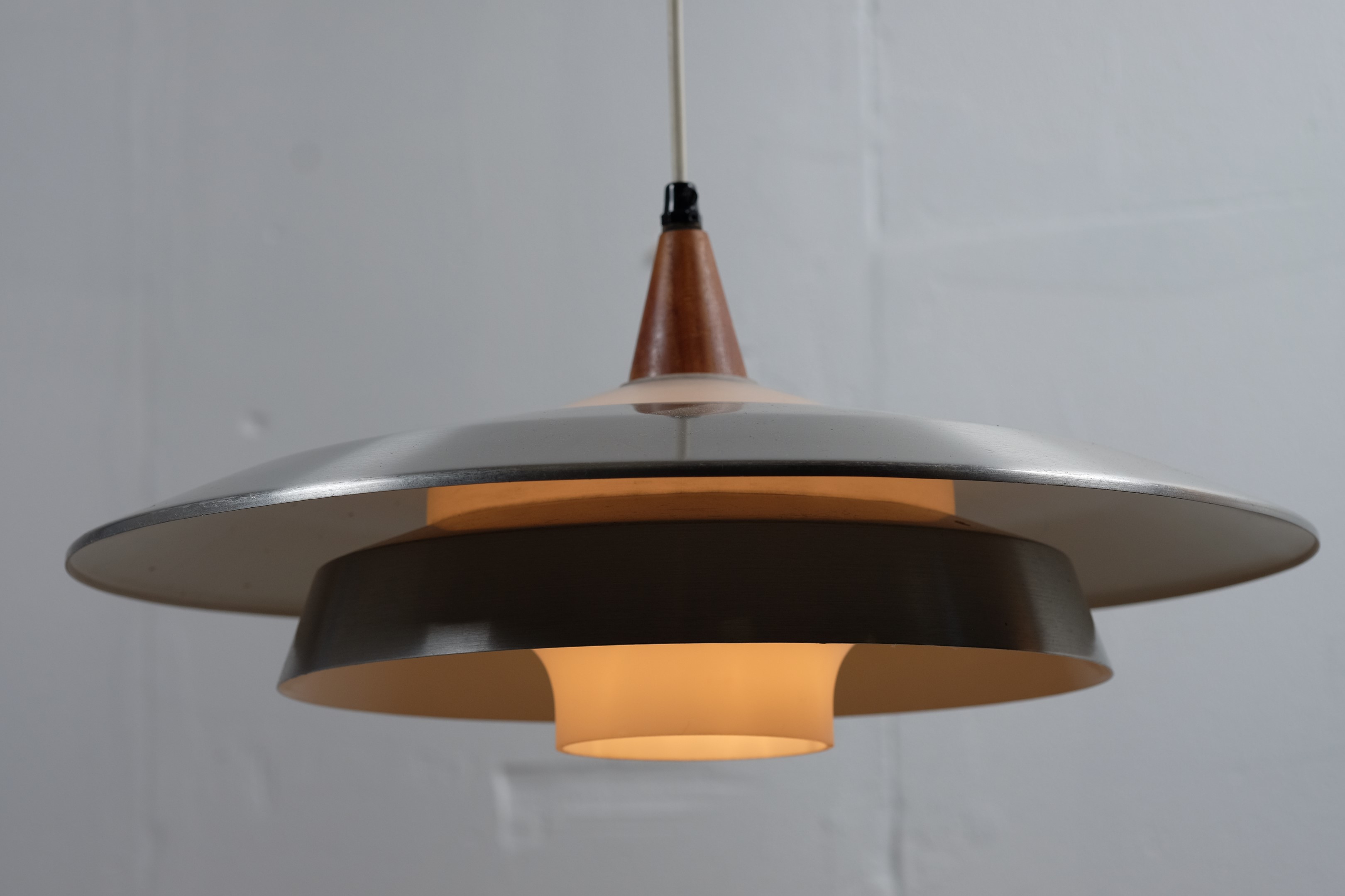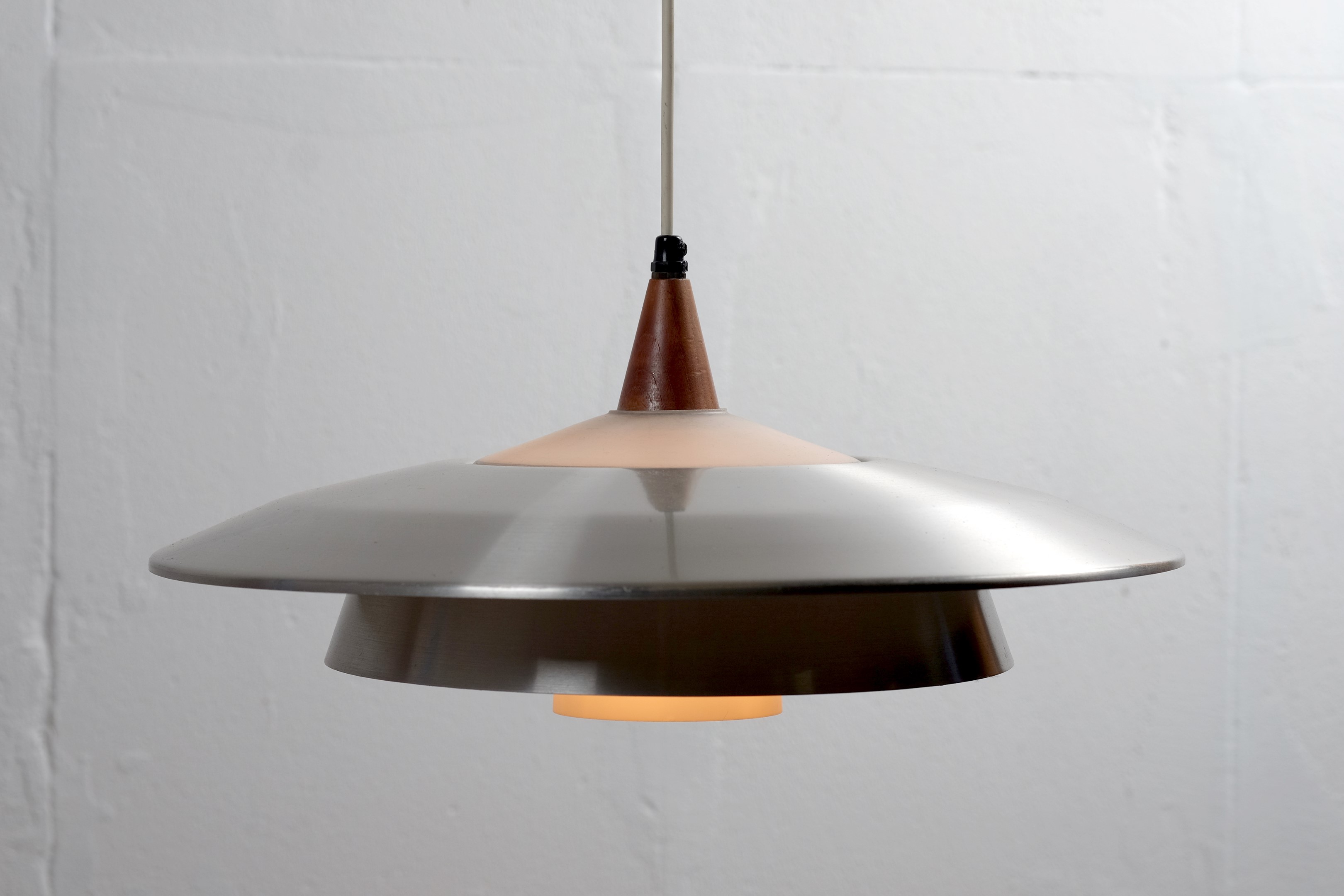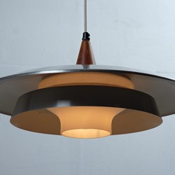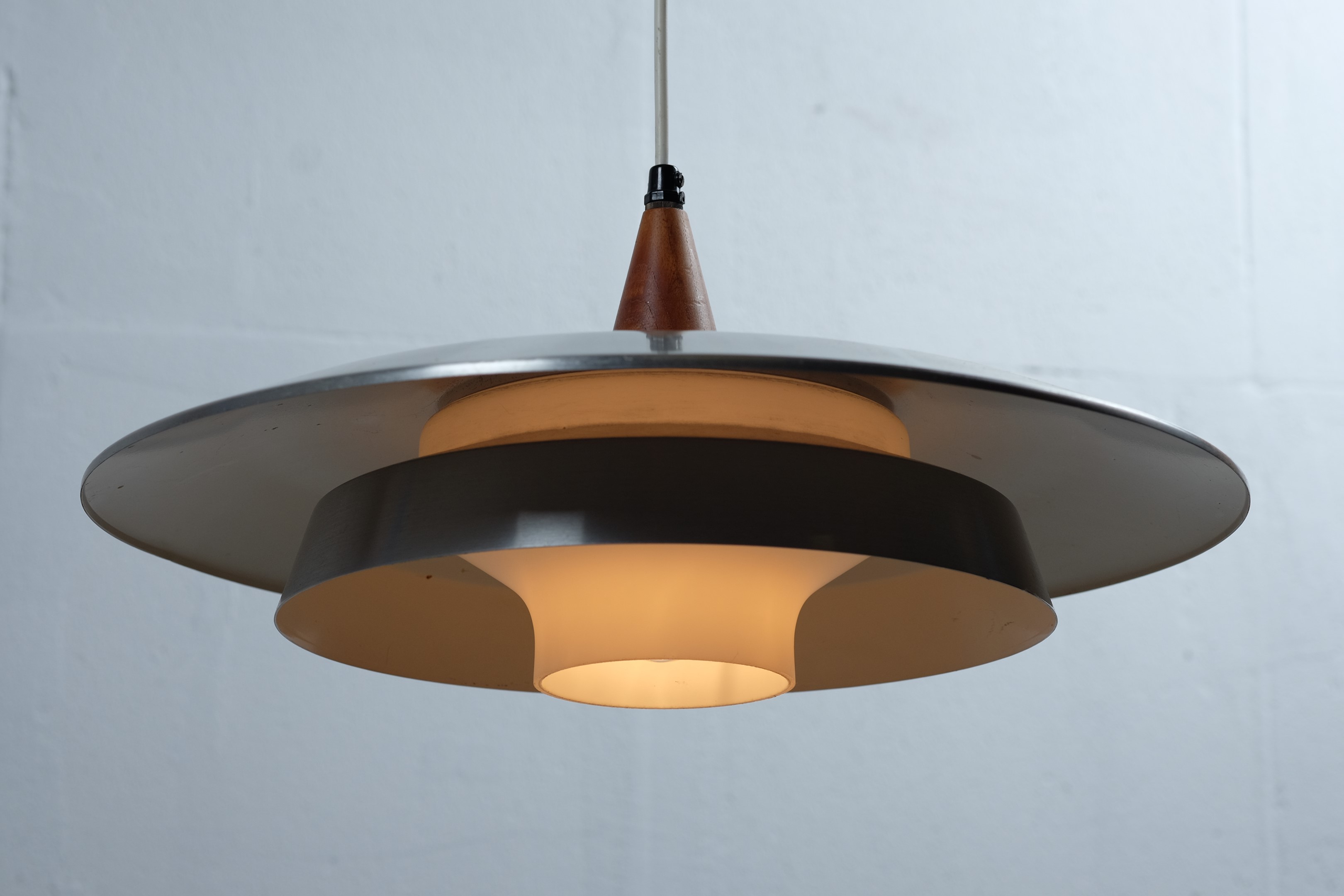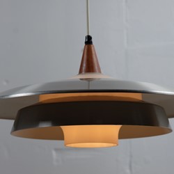 Two shades, one in metal and one black laquered with a top in teak and white opal glass which provides a great light.