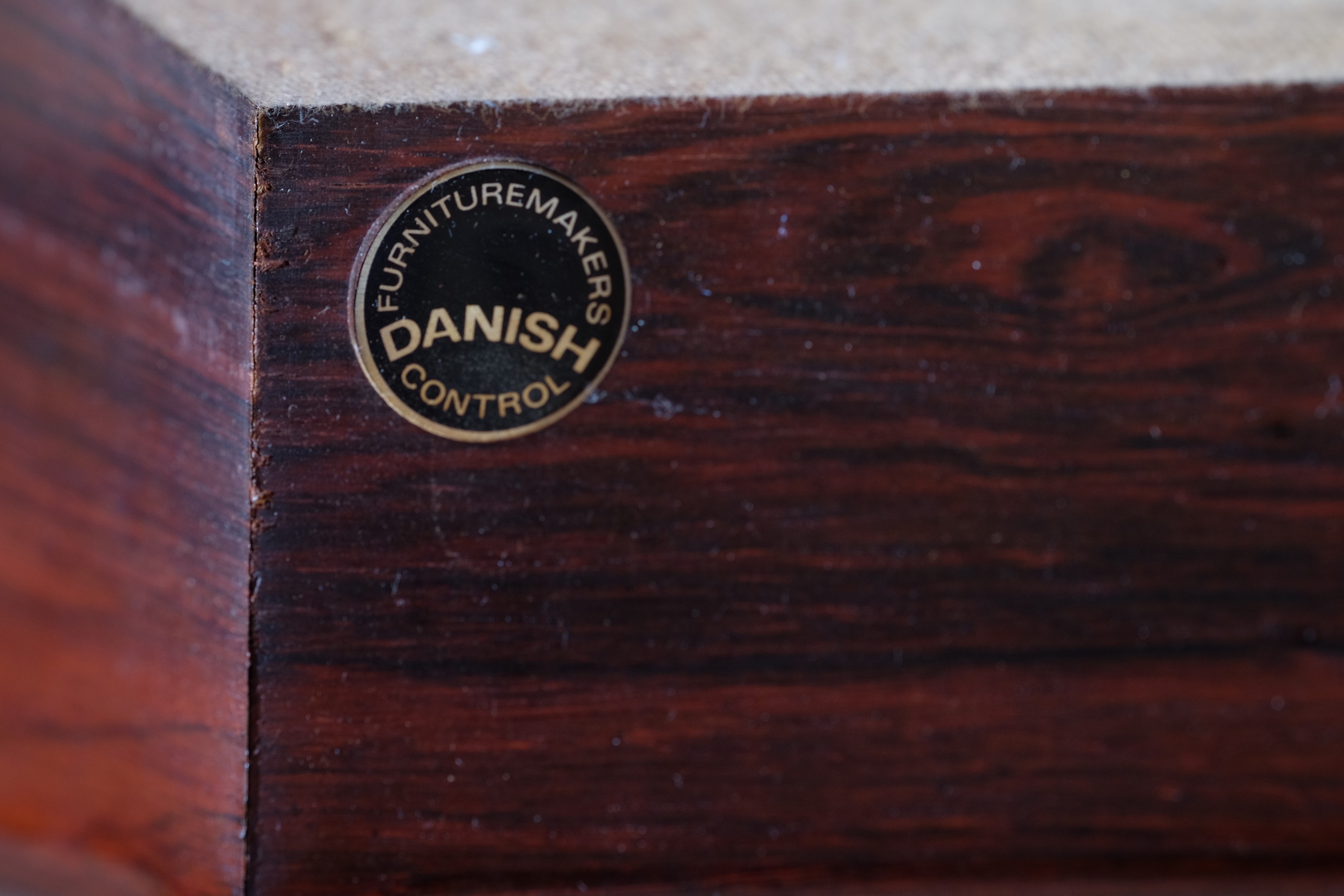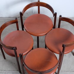 Stunning and rare set of four Hugo Frandsen armchairs in rosewood. Look at the woodwork and details! One of the Danish mid-century classics. This rare round back chair was designed by Dane Hugo Frandsen in 1964 and manufactured by Børge M. Søndergaard in the mid-1960s. It is stamped with the Danish Furniture Makers Control stamp beneath the seat.