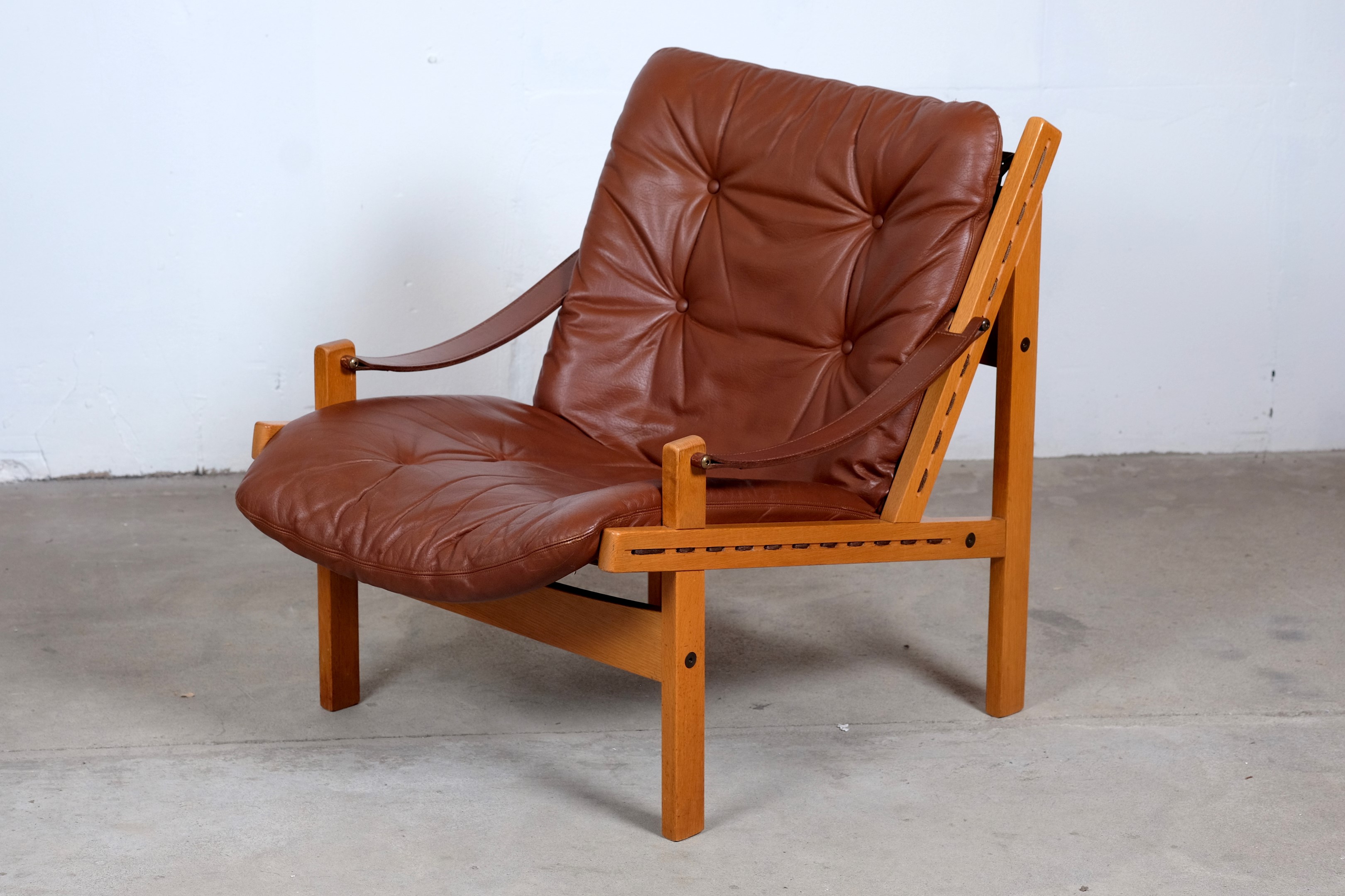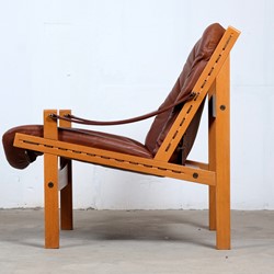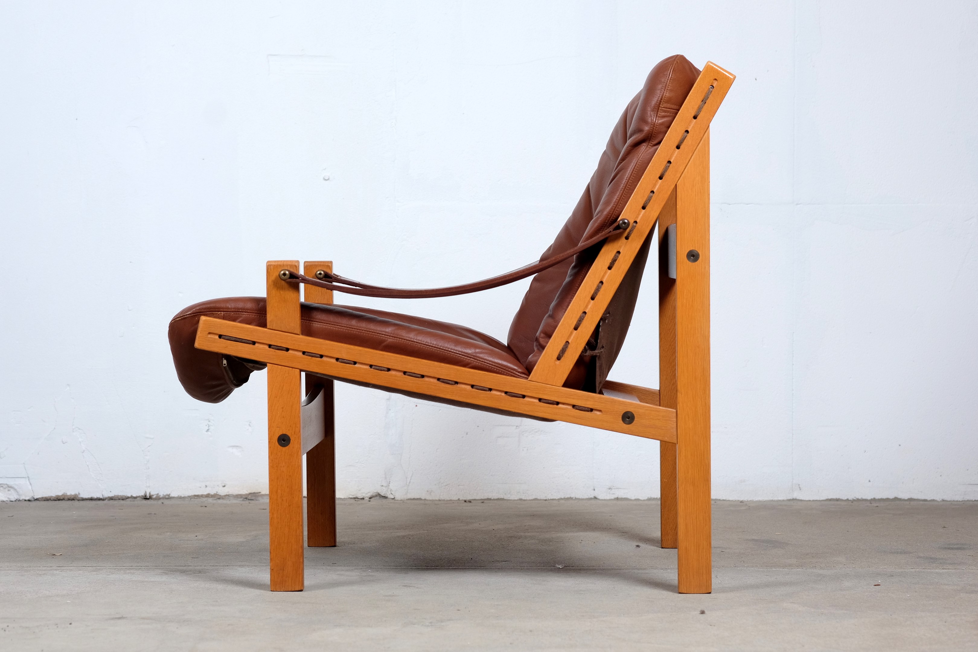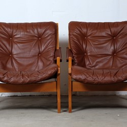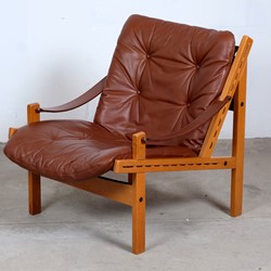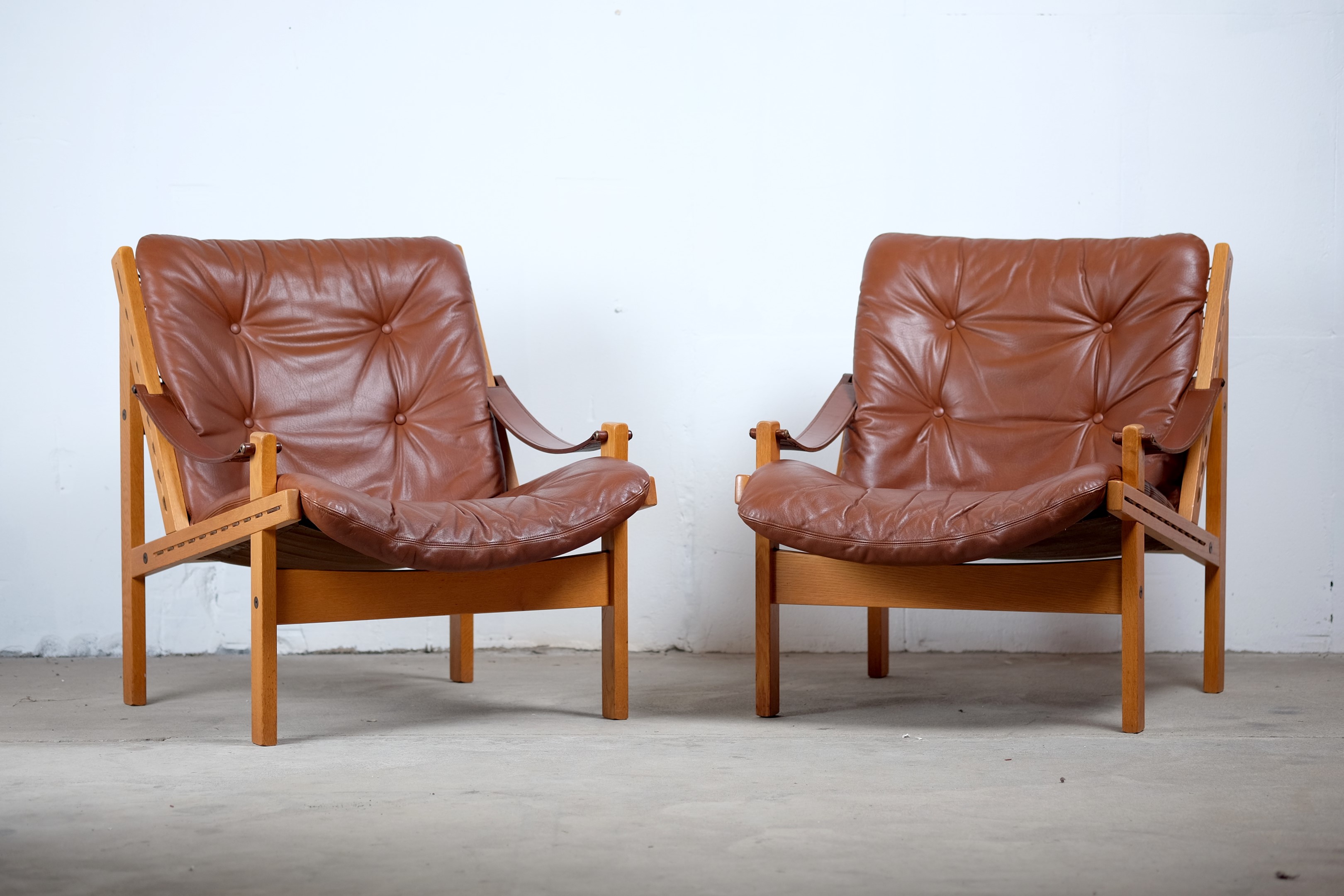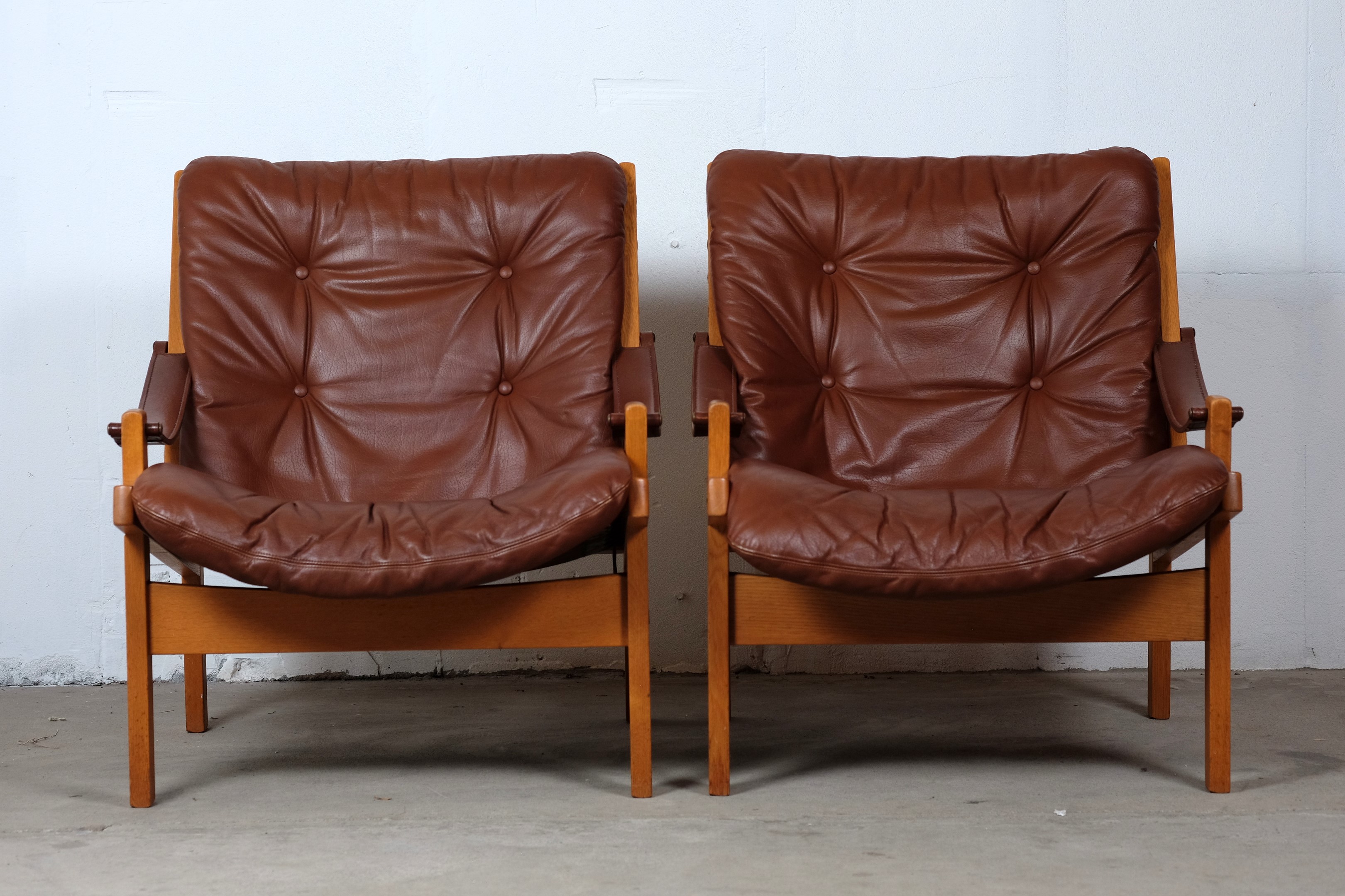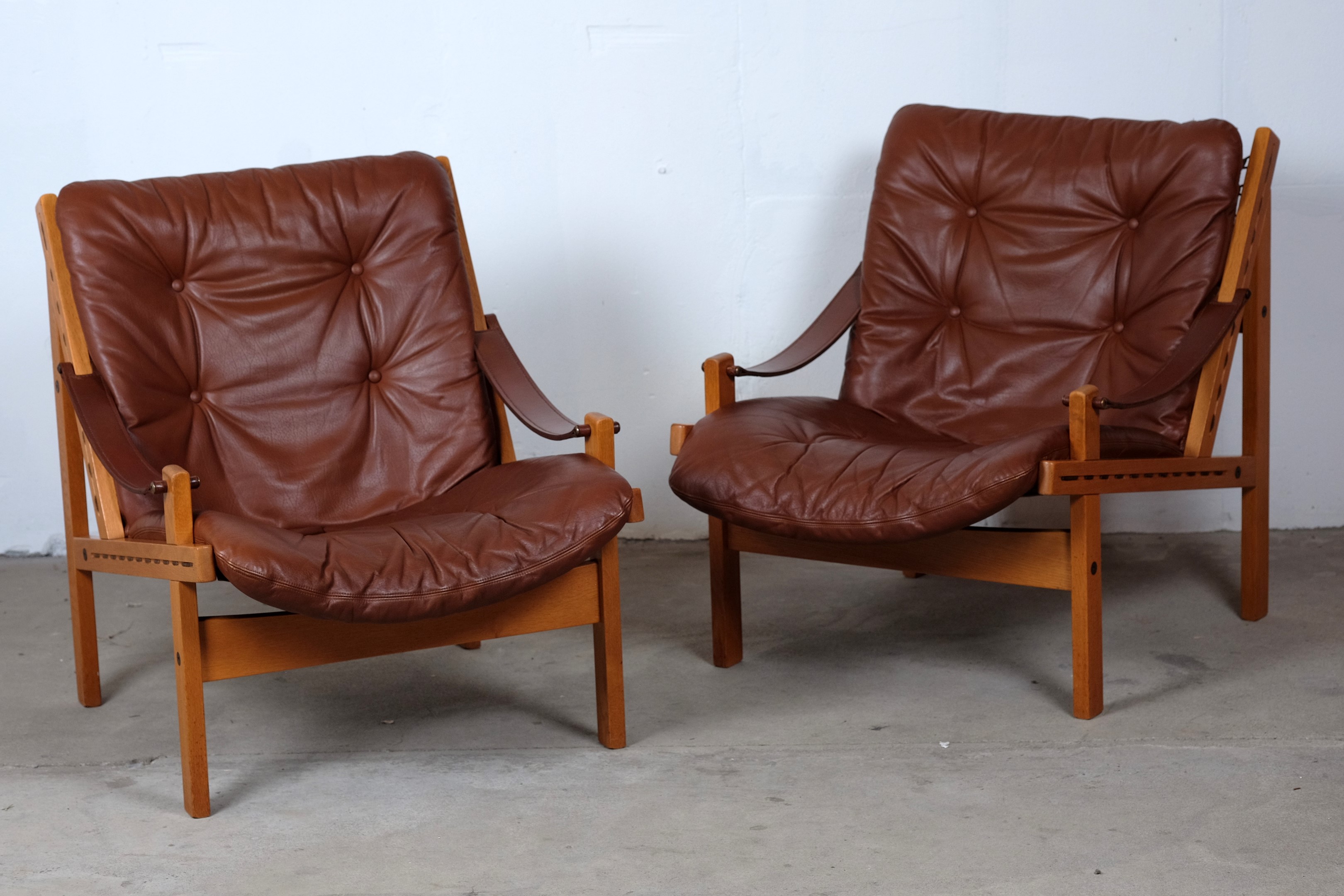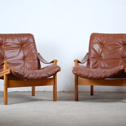 This amazing set of Hunter Safari Chairs by Torbjörn Afdal was designed for Bruksbo Norwegen, in the 1960s. The chair are made of beautiful oak and teak seats are covered with leather. Considering its age both of the chairs is in very good vintage condition. These chairs are a stunning set and is very comfortable to sit in.