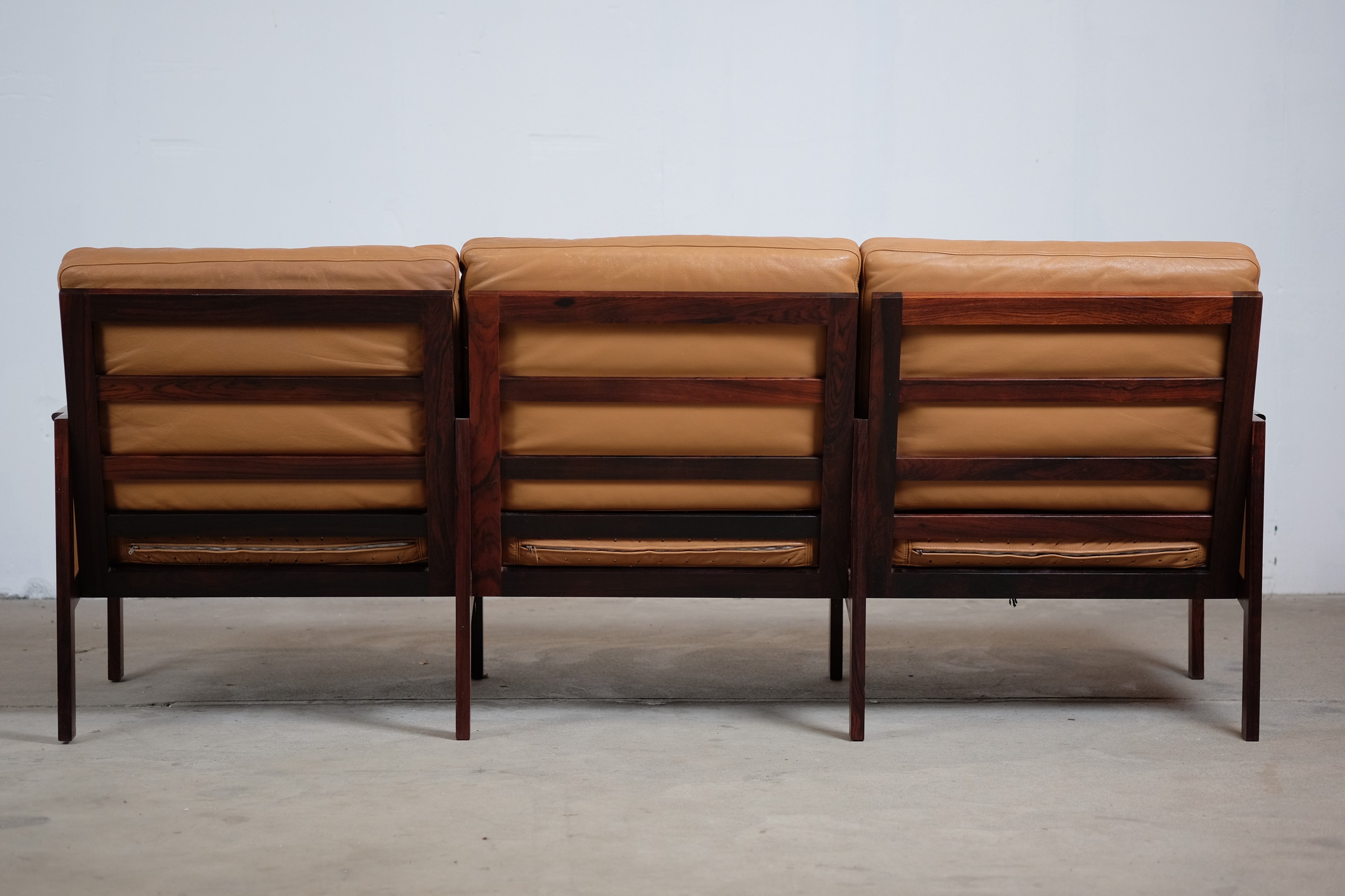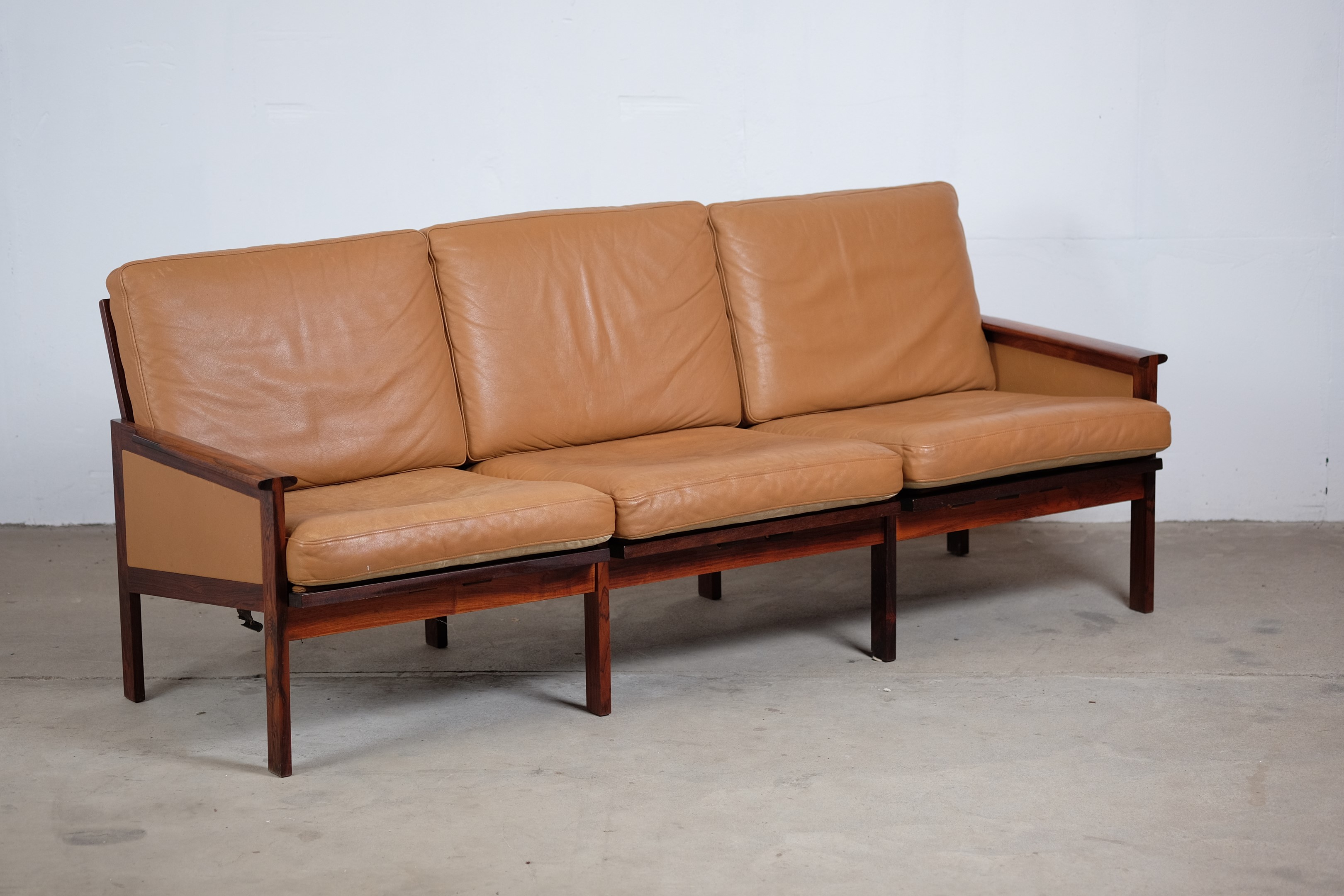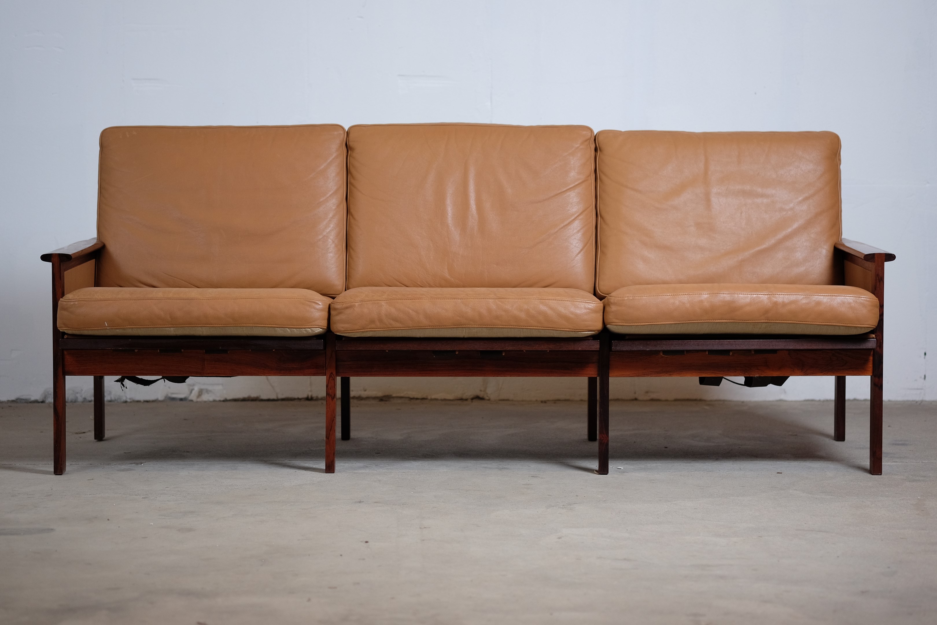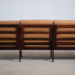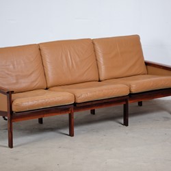 This beautiful rosewood sofa was designed by Illum Wikkelsø and manufactured by N. Eilersen. This sofa also comes in a two-seater and there has also been made a easy chair in that series. The leather cushions are in good vintage condition with a great comfort. Their cognac colour is a great pairing to the contrasting amber and black grain of the rosewood. We also have a pair of matching easy chairs in stock which would make the perfect suite, however, both have to be reupholstered.