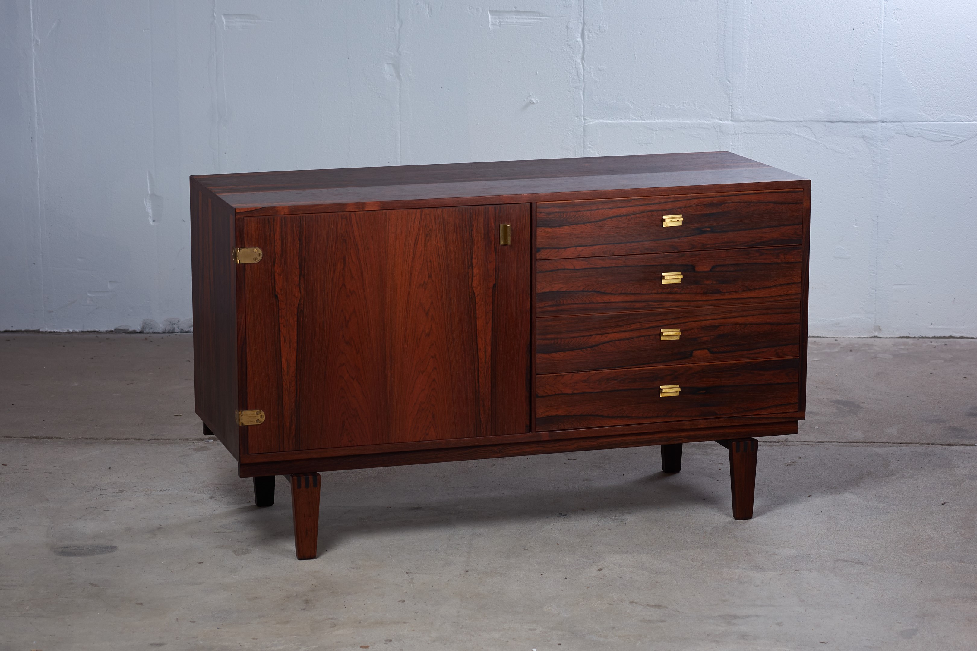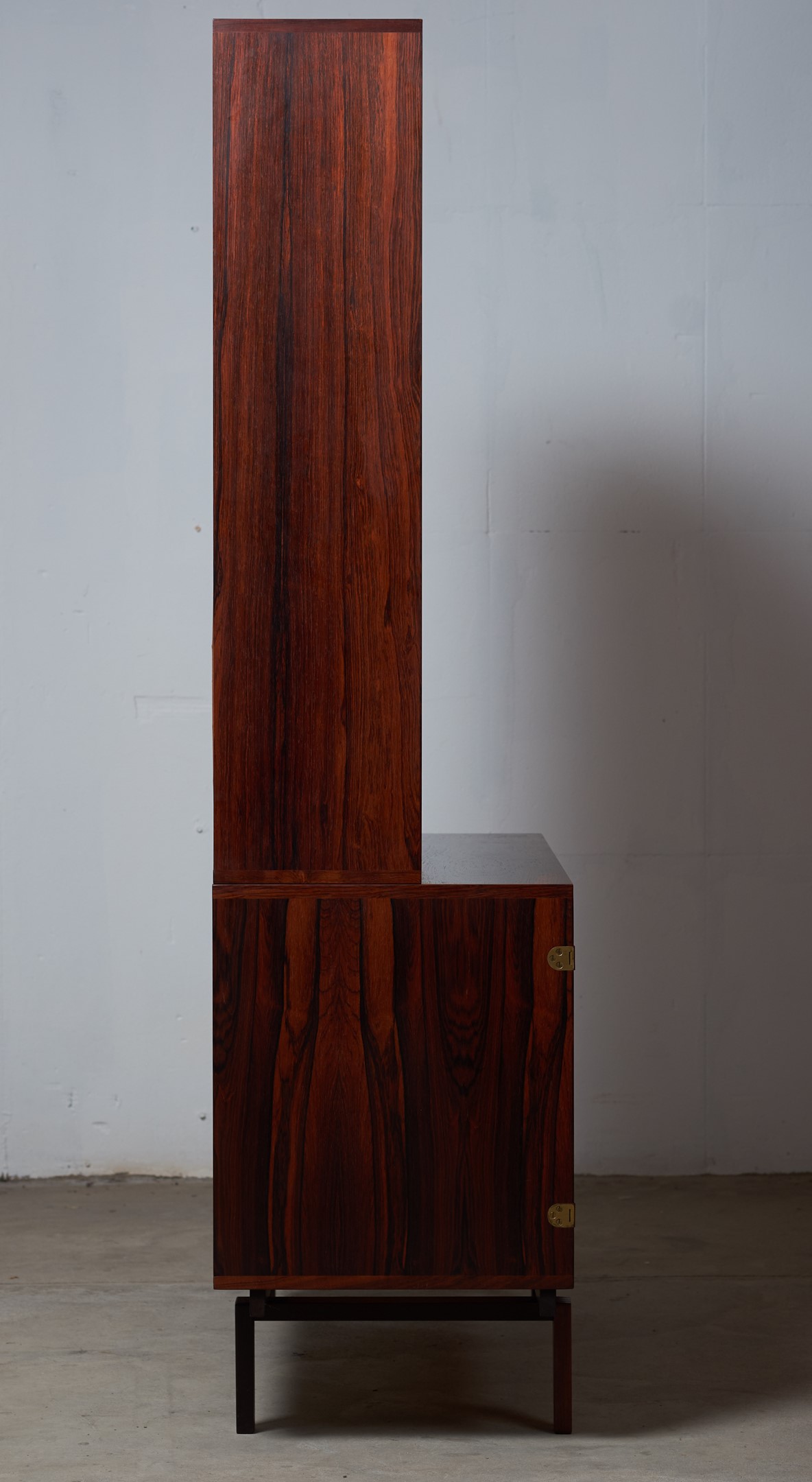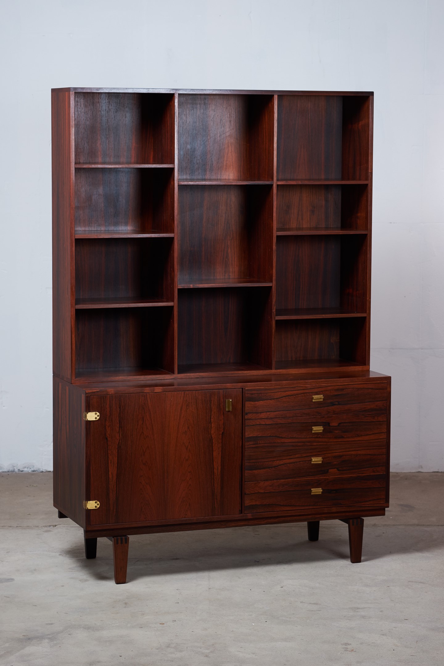 Beautiful rosewood sideboard/ bookcase by Peter Løvig Nielsen offers a simple sleek design with beautifully patinated original brass handles. The tall bookcase hutch features adjustable shelves. The sideboard offers two large doors with adjustable shelving. Case stands on solid rosewood, fingered joined legs. In very good original condition with typical wear for its vintage.