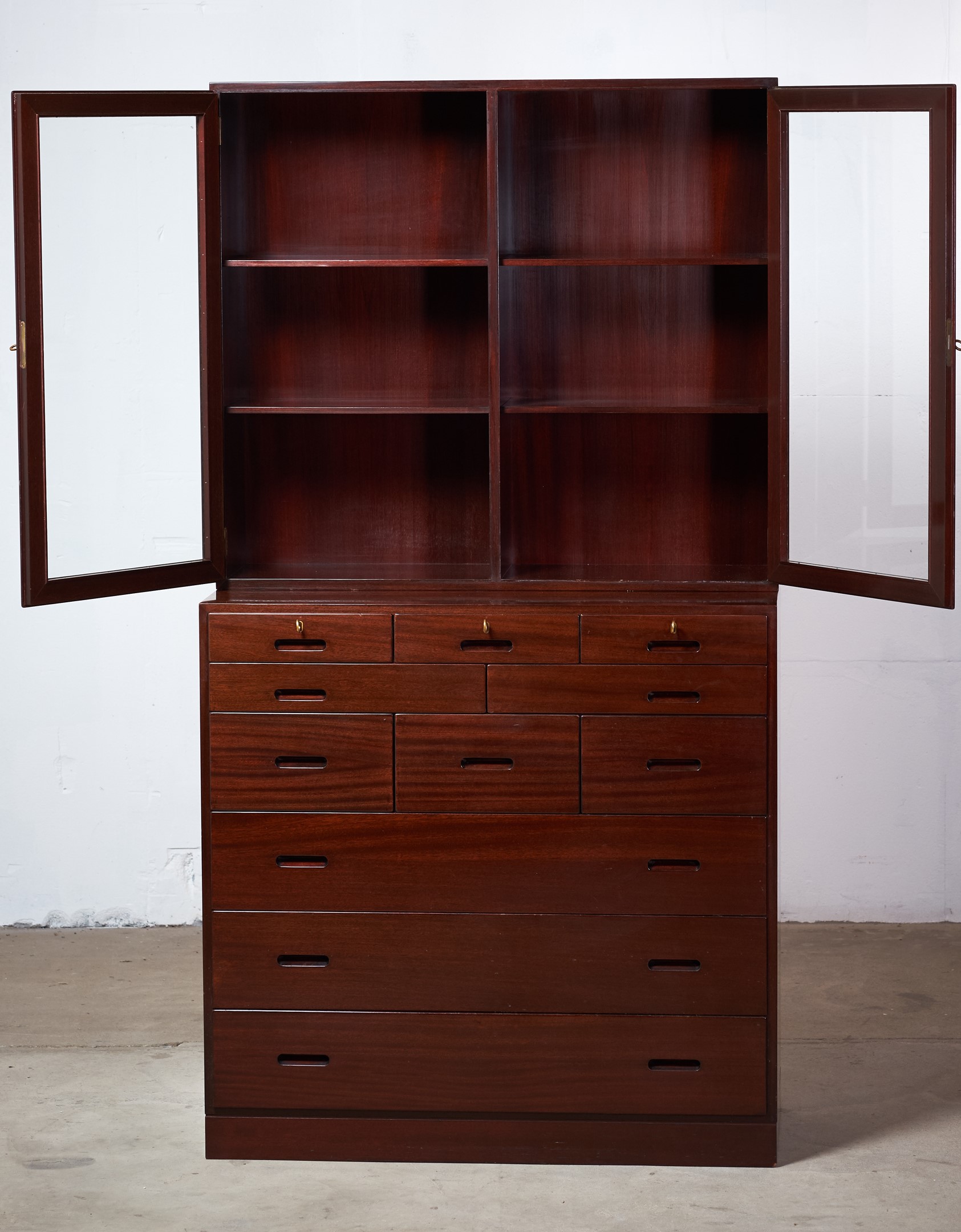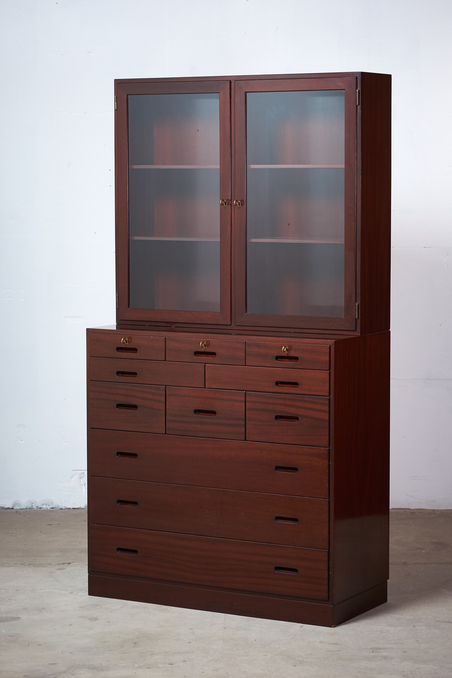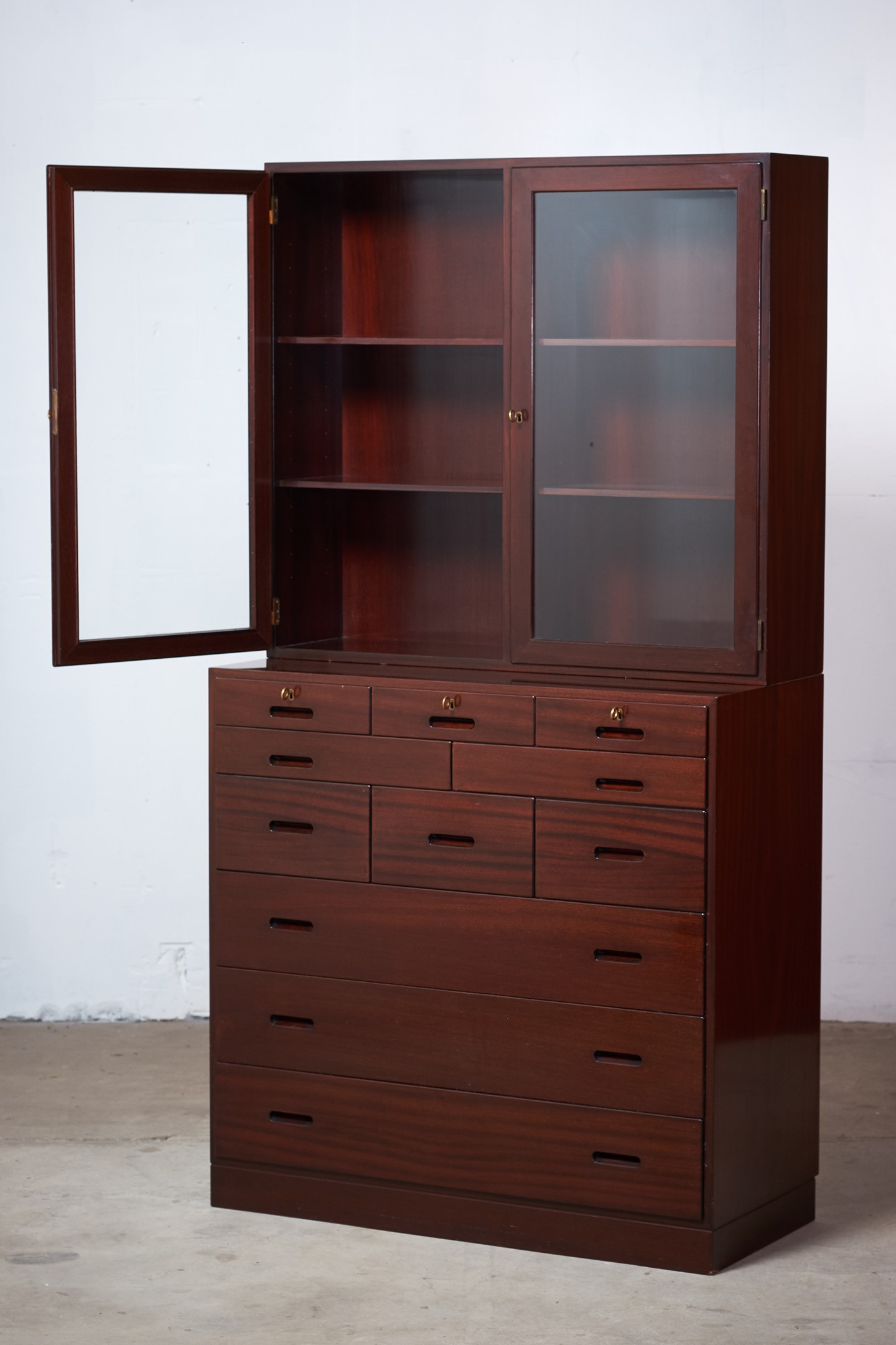 This absolutely stunning chest of drawers was designed by the Danish designer Kaj Winding and produced by P. Jeppesen in Denmark in the 1960s. Features, beautiful glass cabinet top, front with three larger and eight smaller drawers which is made of mahogany, carved handles and brass key holes. 5 keys included. It is in good vintage condition with few signs of age-related wear.
