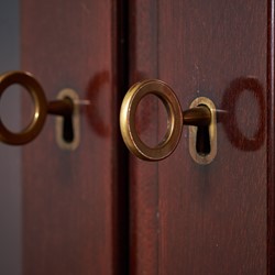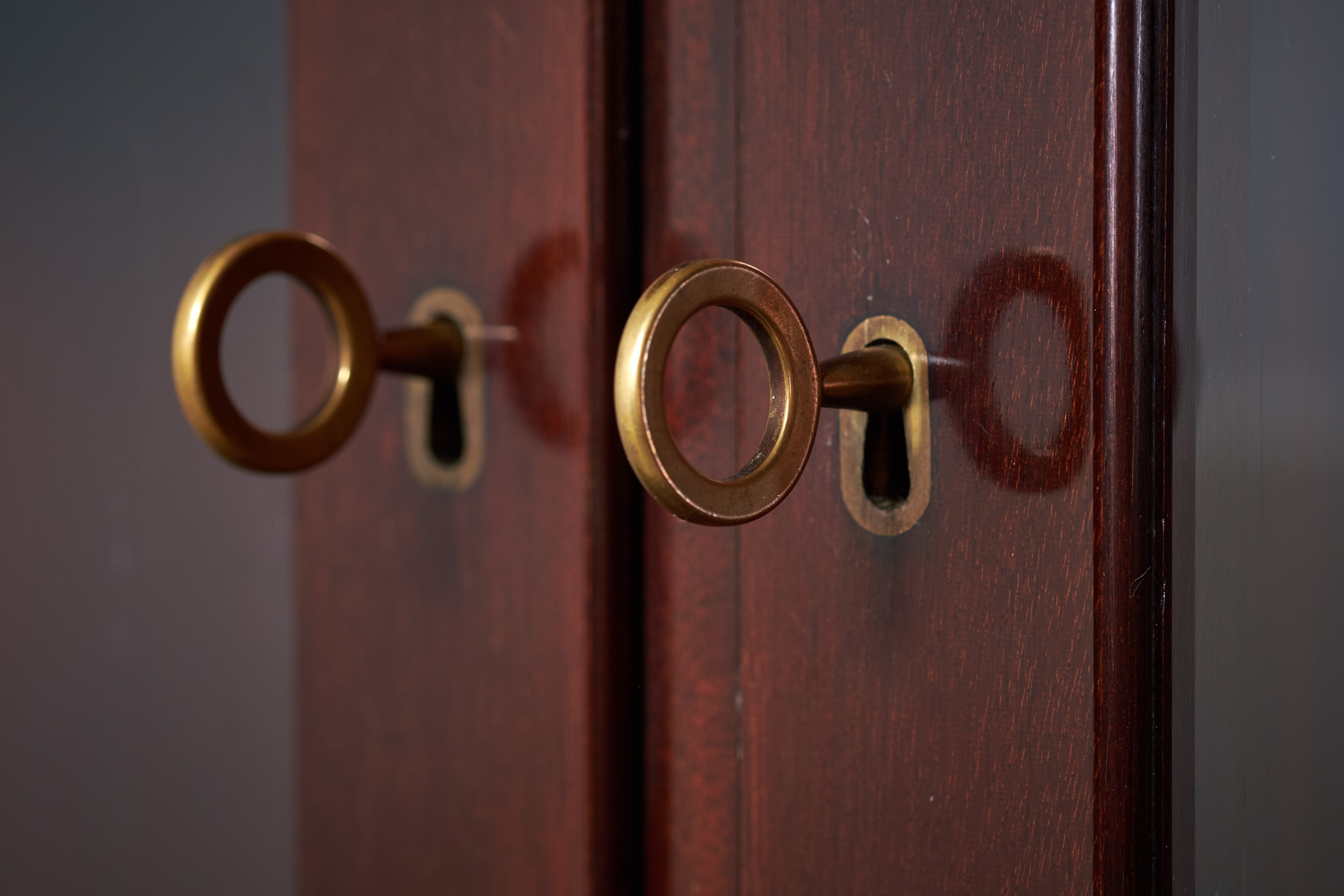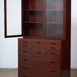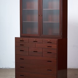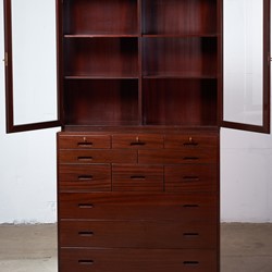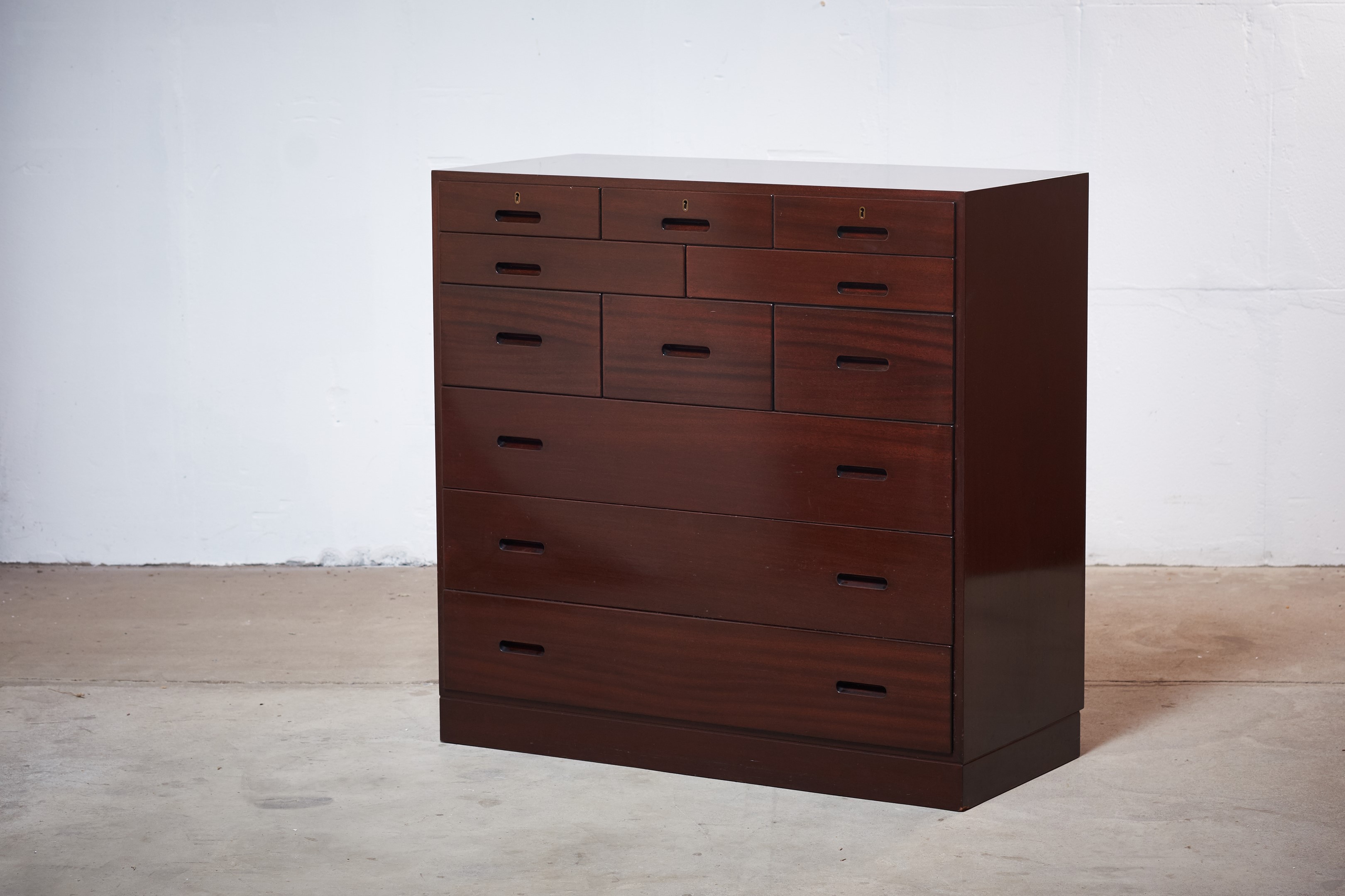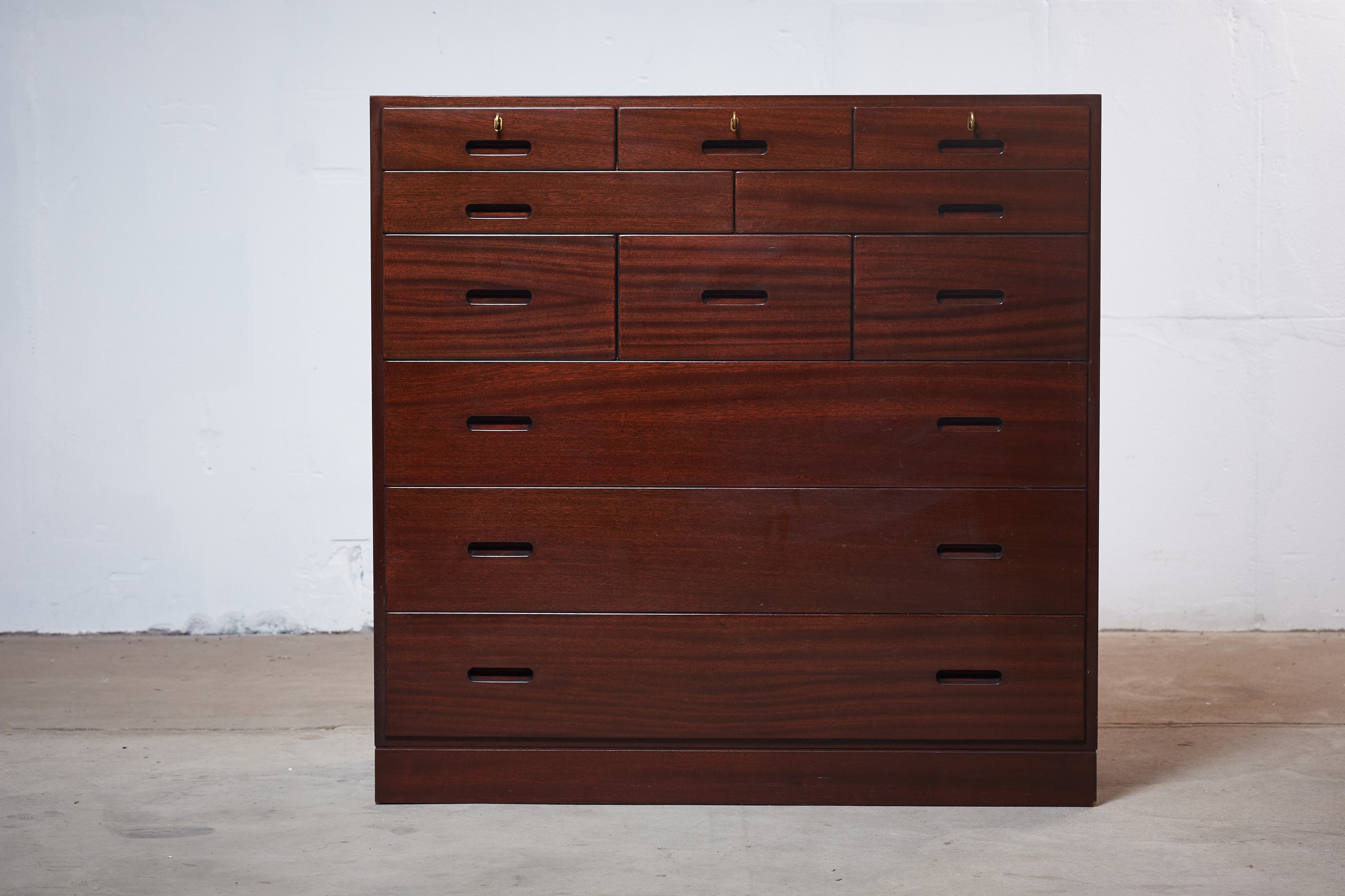 This absolutely stunning chest of drawers was designed by the Danish designer Kaj Winding and produced by P. Jeppesen in Denmark in the 1960s. Features, beautiful glass cabinet top, front with three larger and eight smaller drawers which is made of mahogany, carved handles and brass key holes. 5 keys included. It is in good vintage condition with few signs of age-related wear.