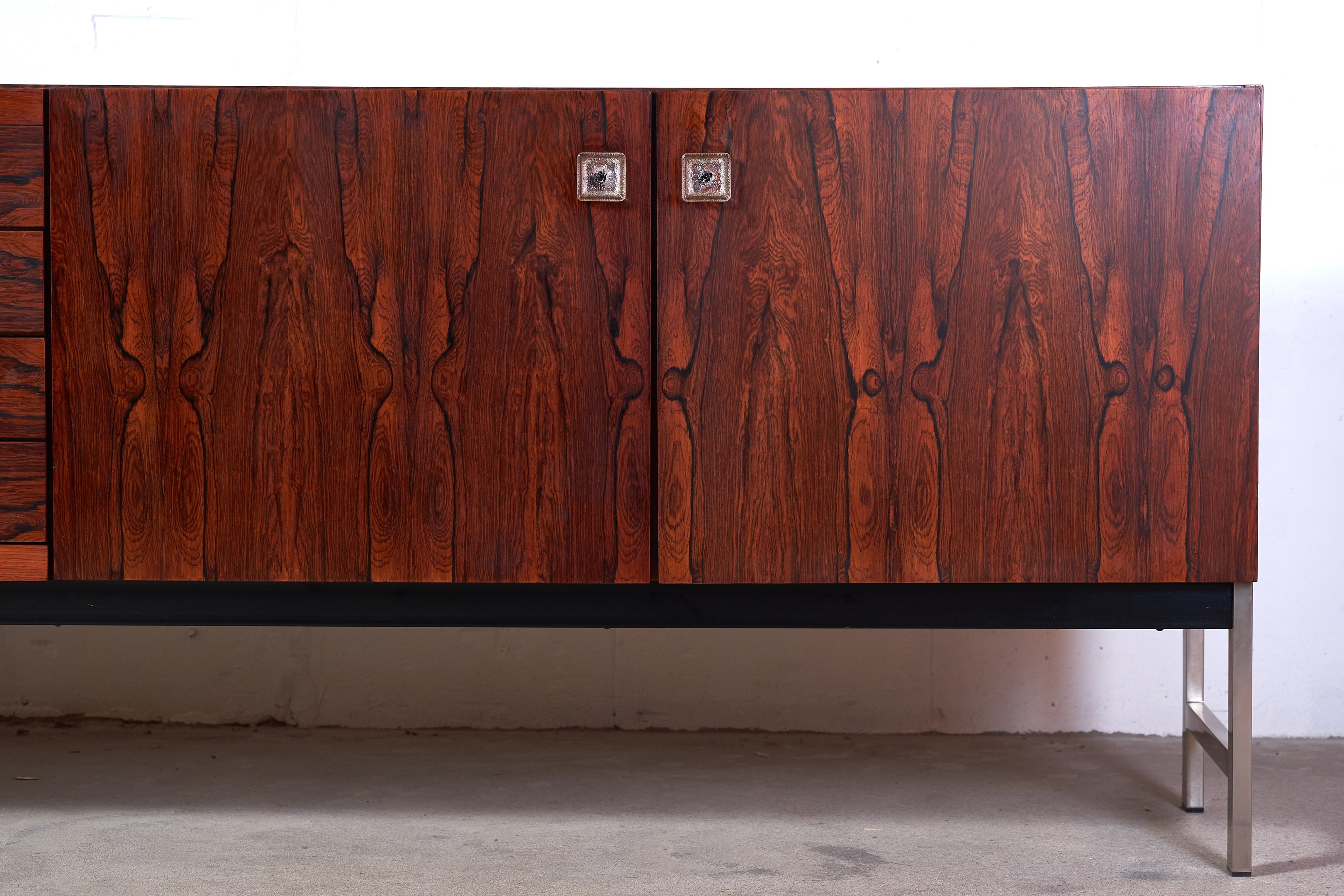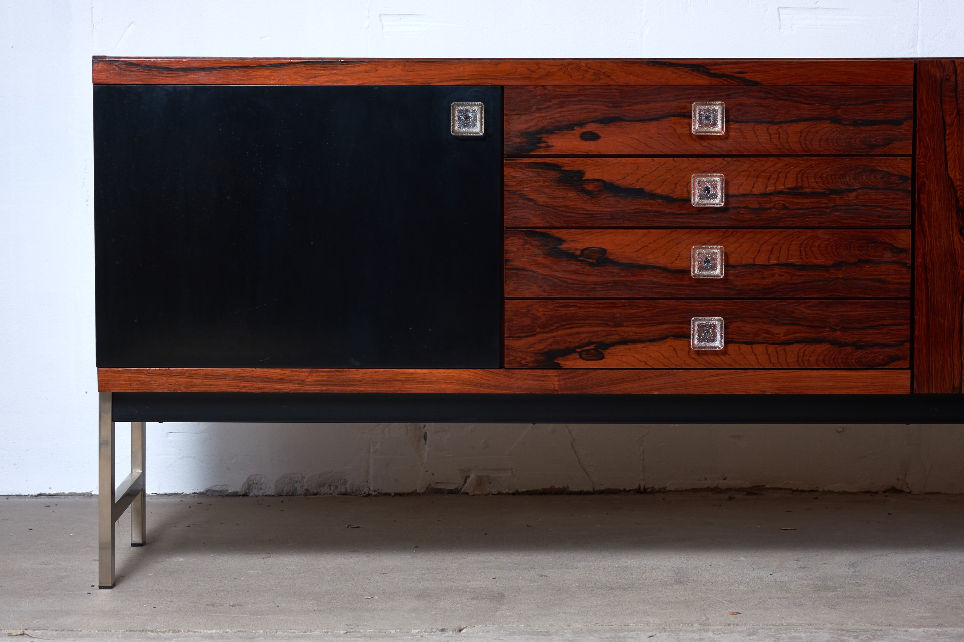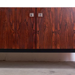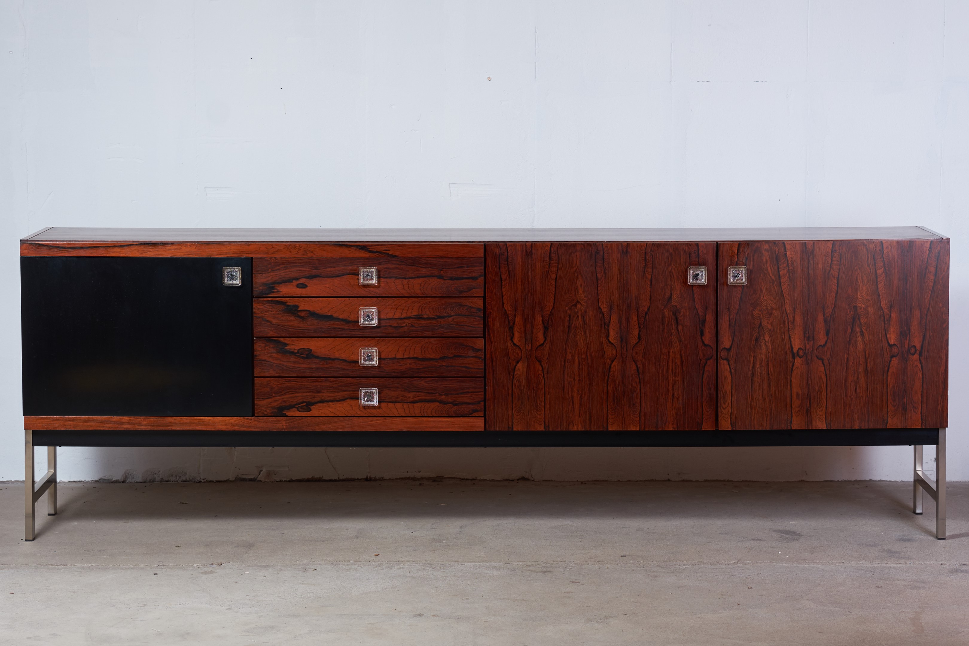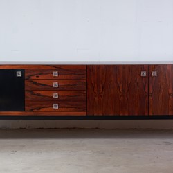 This stunning rosewood sideboard with chrome plated metal frame, features, three doors with great storage room, four drawers, all with glass handles. One of the doors are black lacquered. The sideboard has a lot of great details and this is sure one of Fristho Franekers best designs when it comes to sideboards.