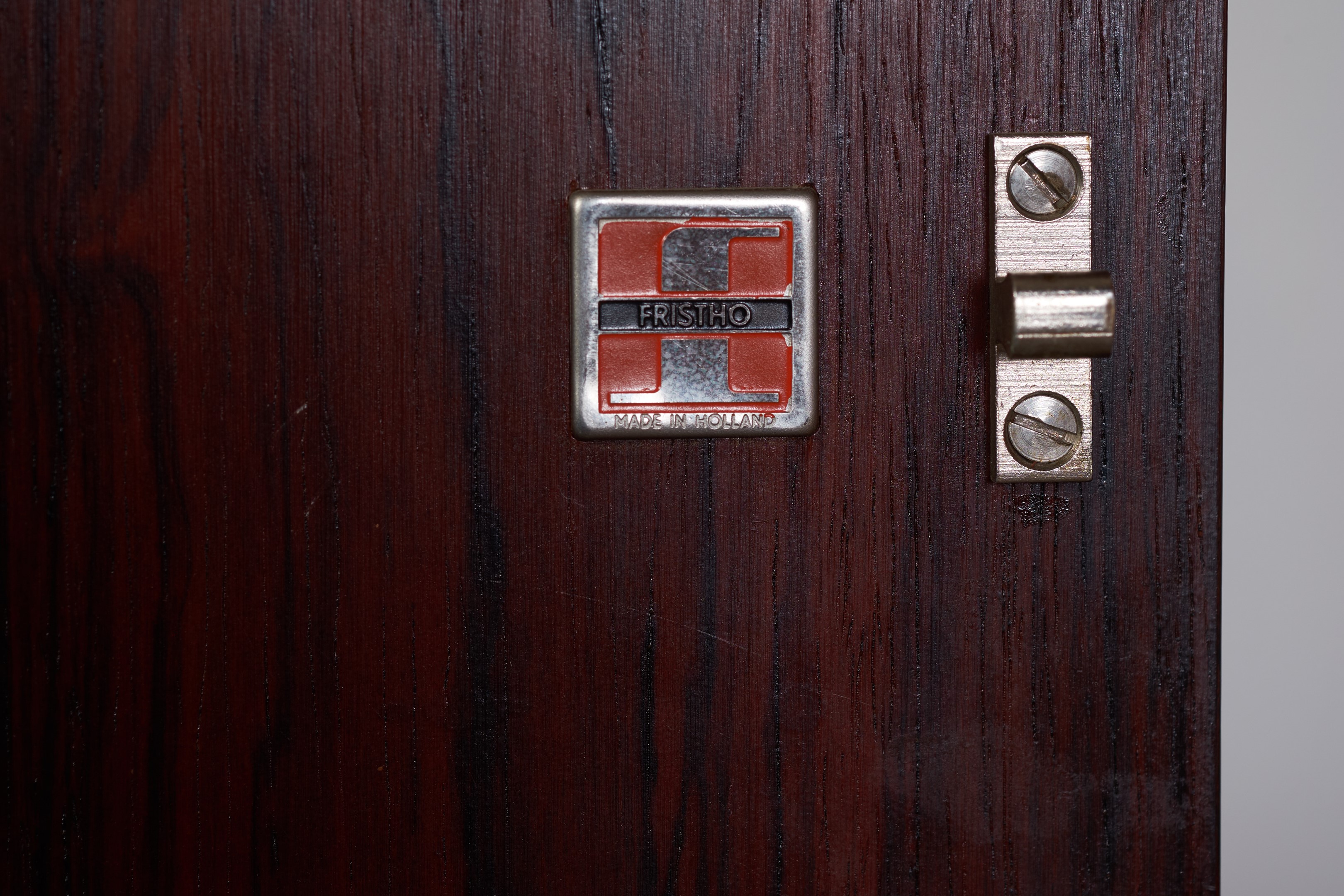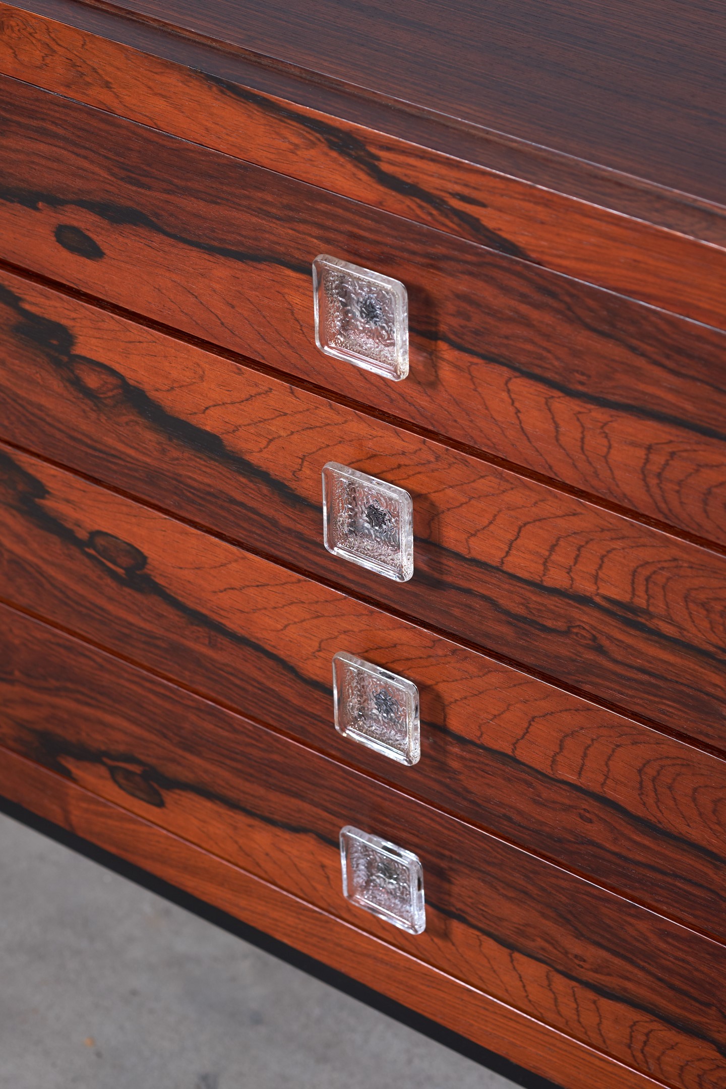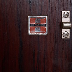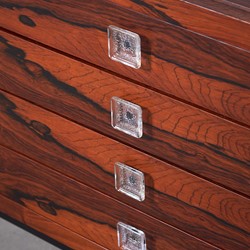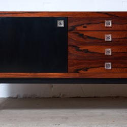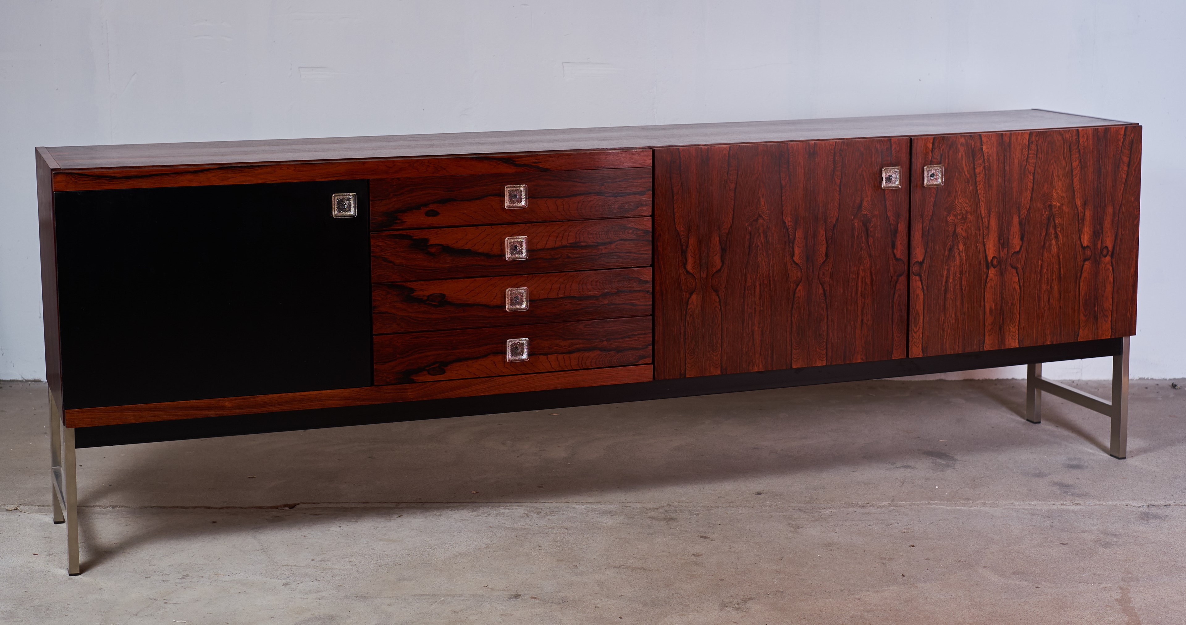This stunning rosewood sideboard with chrome plated metal frame, features, three doors with great storage room, four drawers, all with glass handles. One of the doors are black lacquered. The sideboard has a lot of great details and this is sure one of Fristho Franekers best designs when it comes to sideboards.