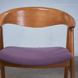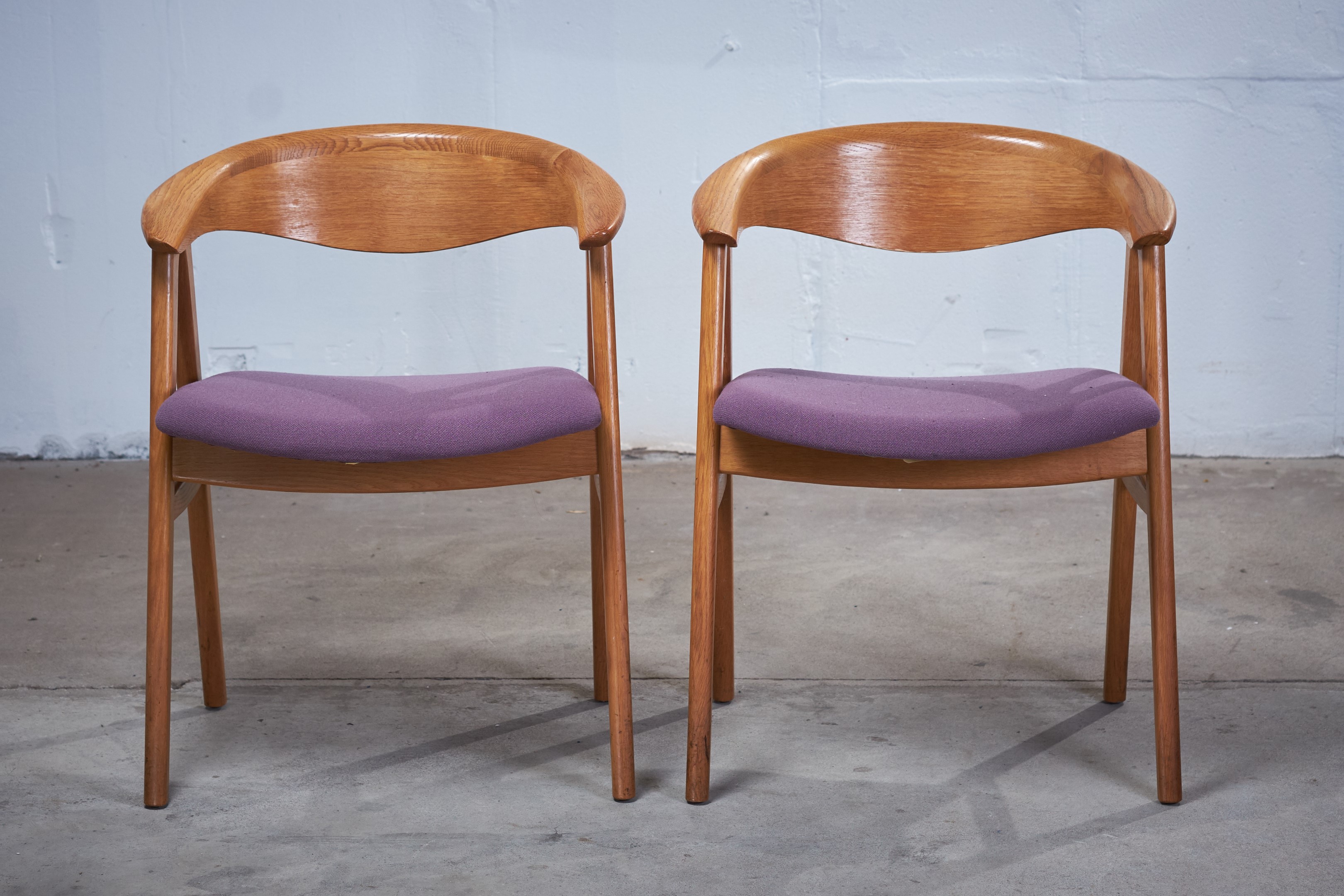 This pair of Erik Kirkegaard armchairs in oak was designed in 1952, 'Model 52' for Høng Stolefabrik. The chairs has a generous, curved backrest with a wide lip and a seat with good quality wool, supported between two A-frame legs of solid oak. The seat falls backwards, which gives a great comfort when sitting in the chair.