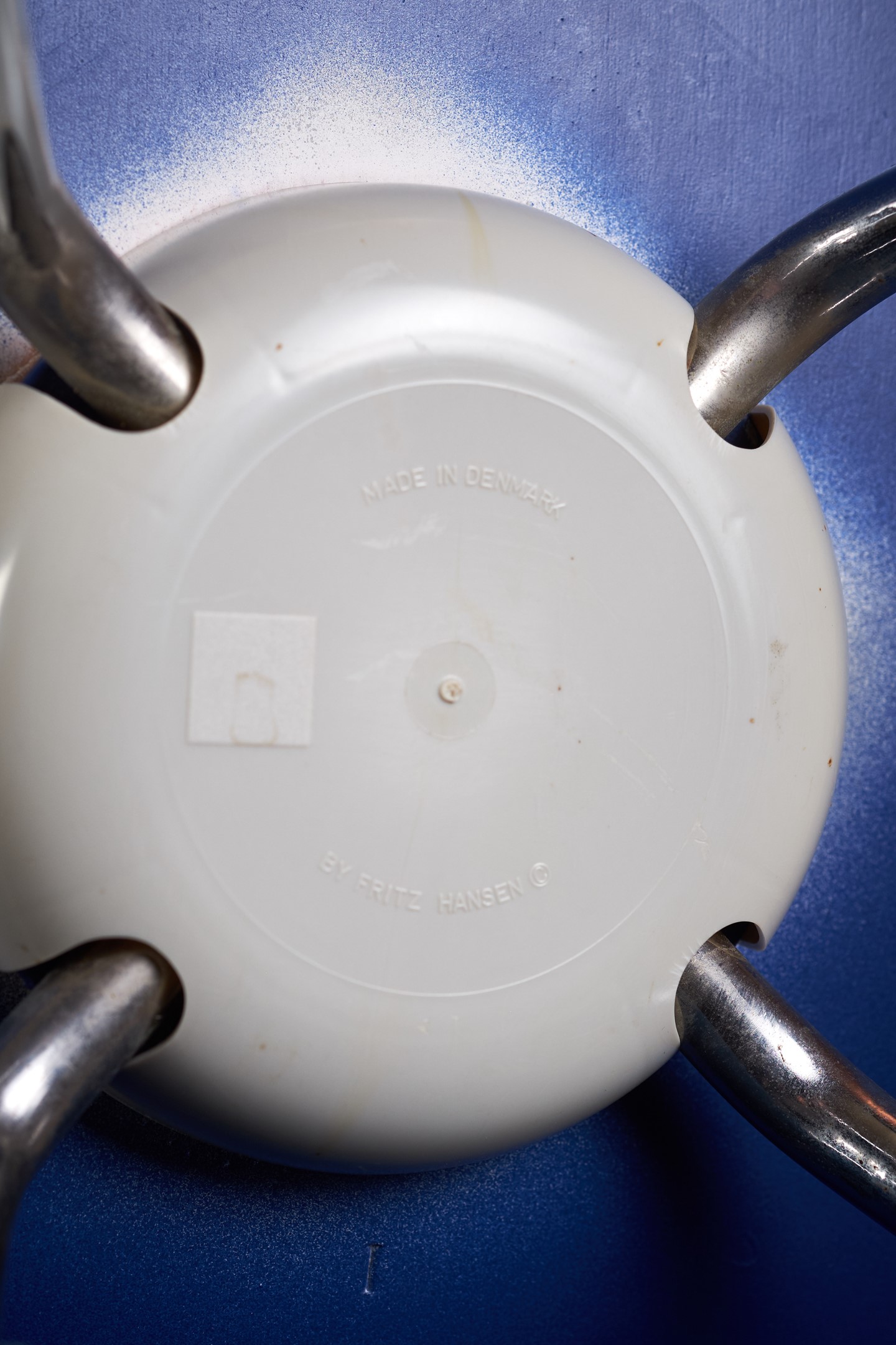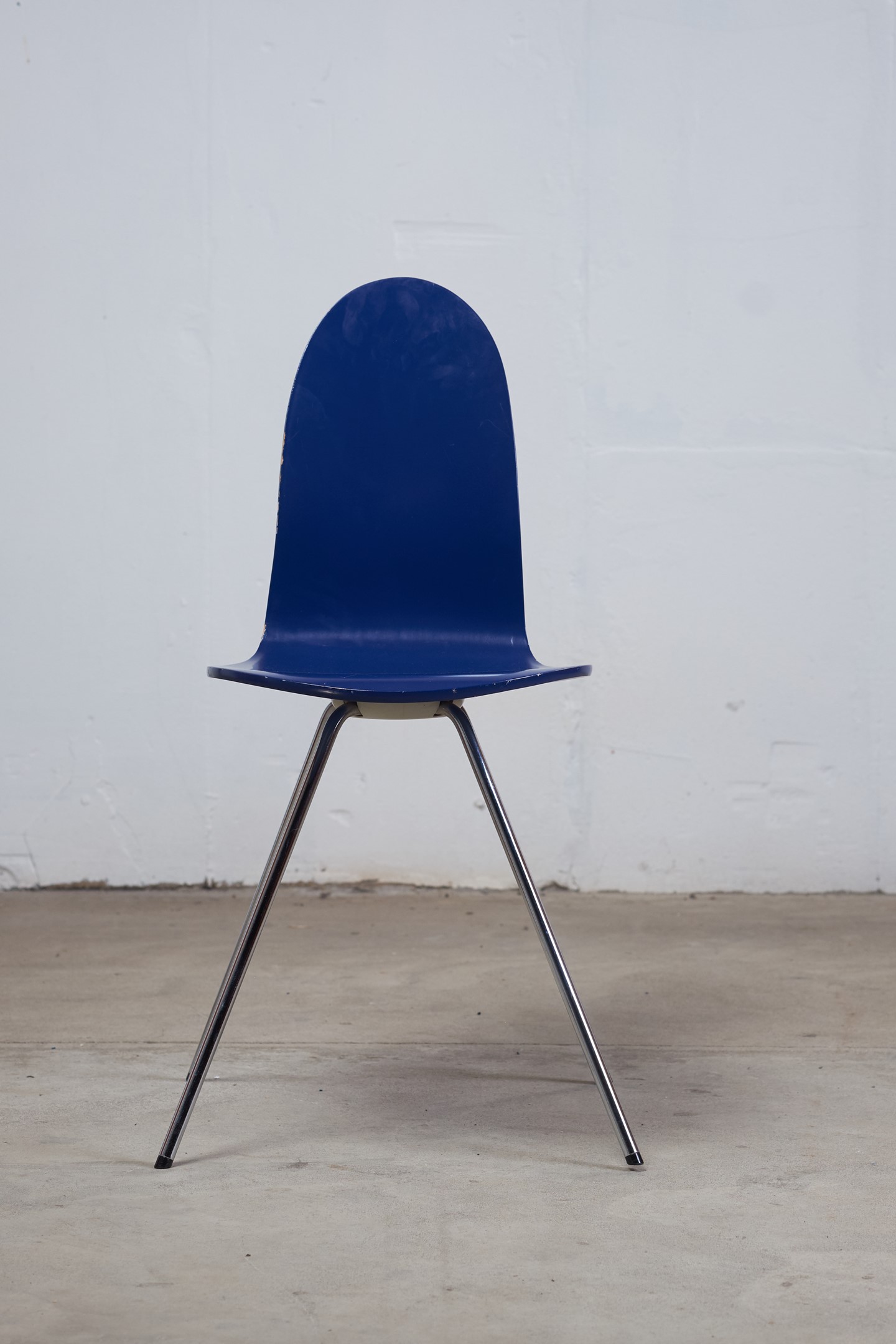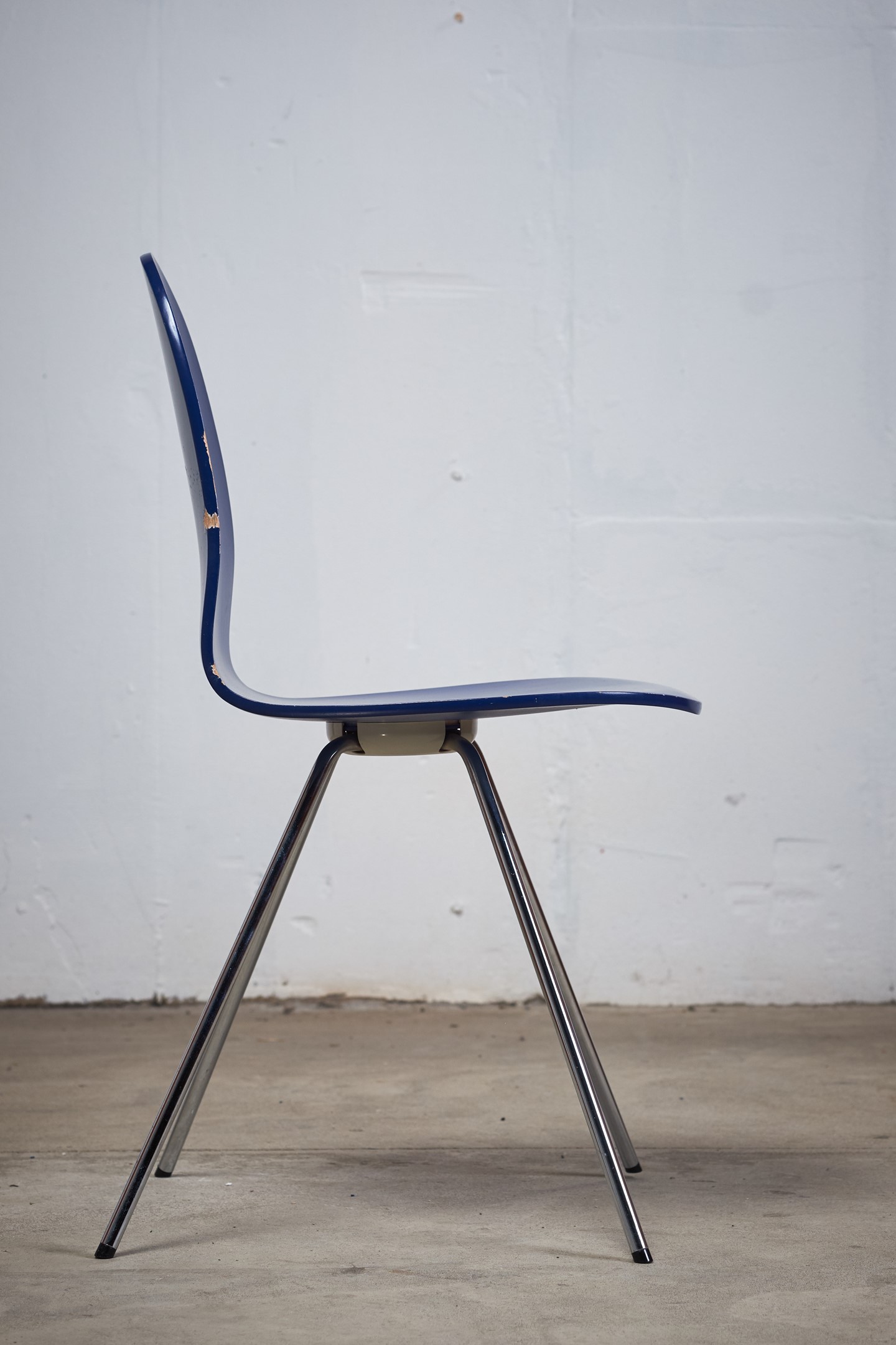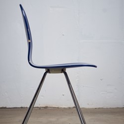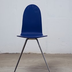 'Tonque' chair by designer, Arne Jacobsen for Fritz Hansen.his chair has been designed in 1955 a danish school called 'Munkegard school' in Denmark. It has only been produced a short time in the 1980s till 1985. There are not many of these chairs produced by Fritz Hansen. The color is in a very beautiful dark blue. The legs are chrome-plated.