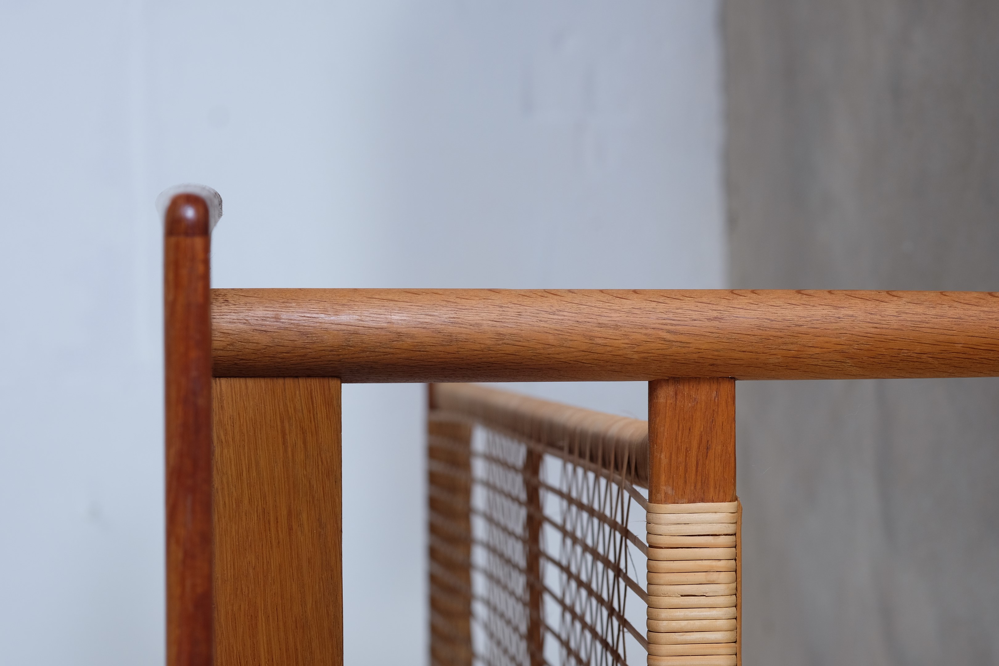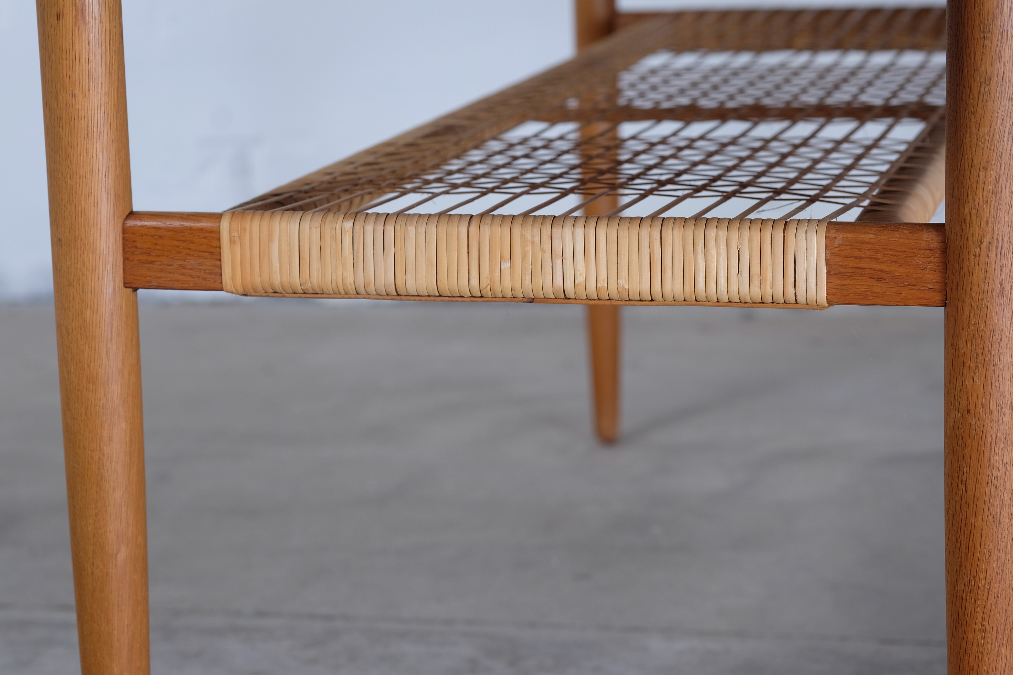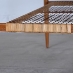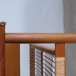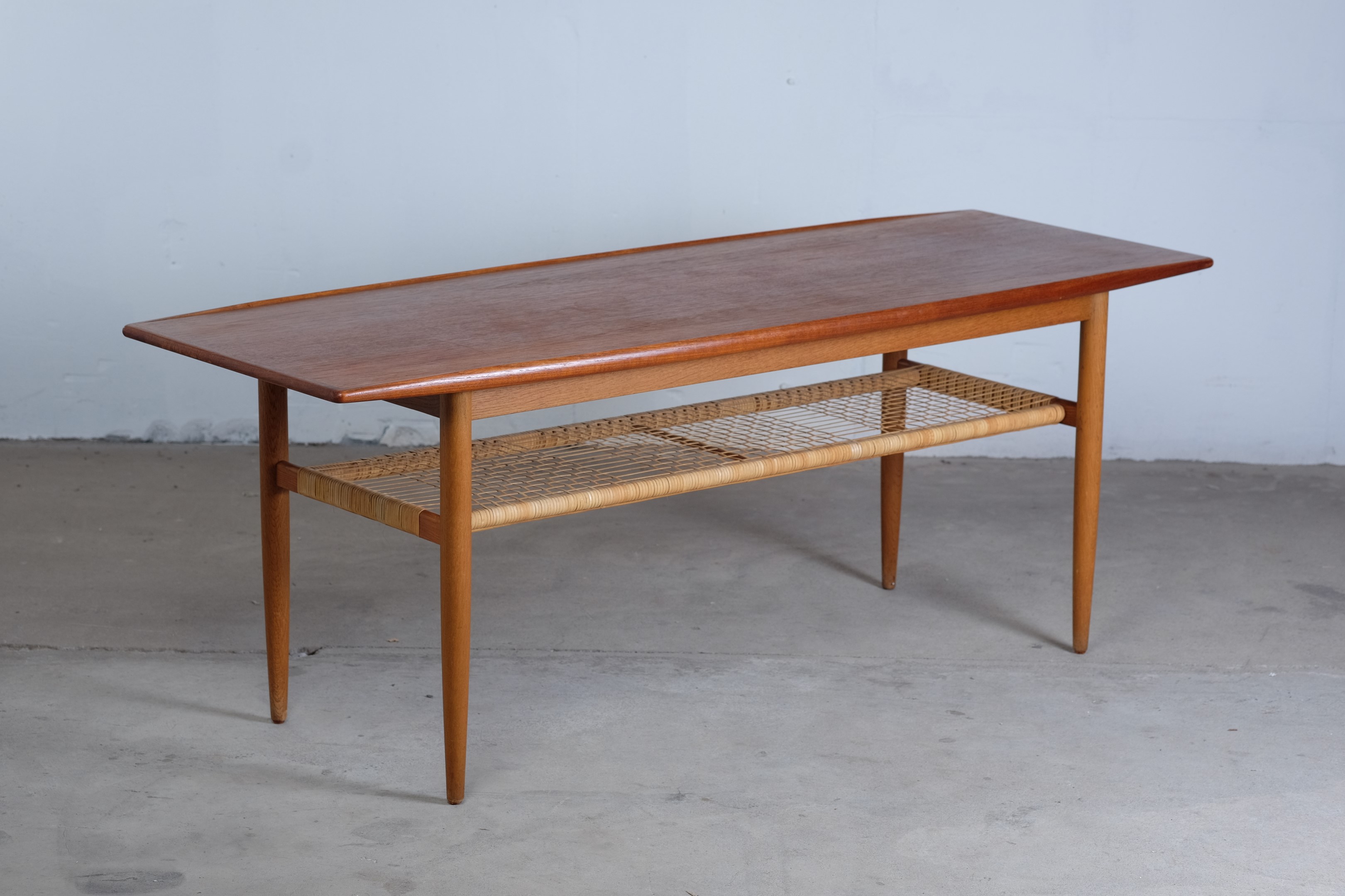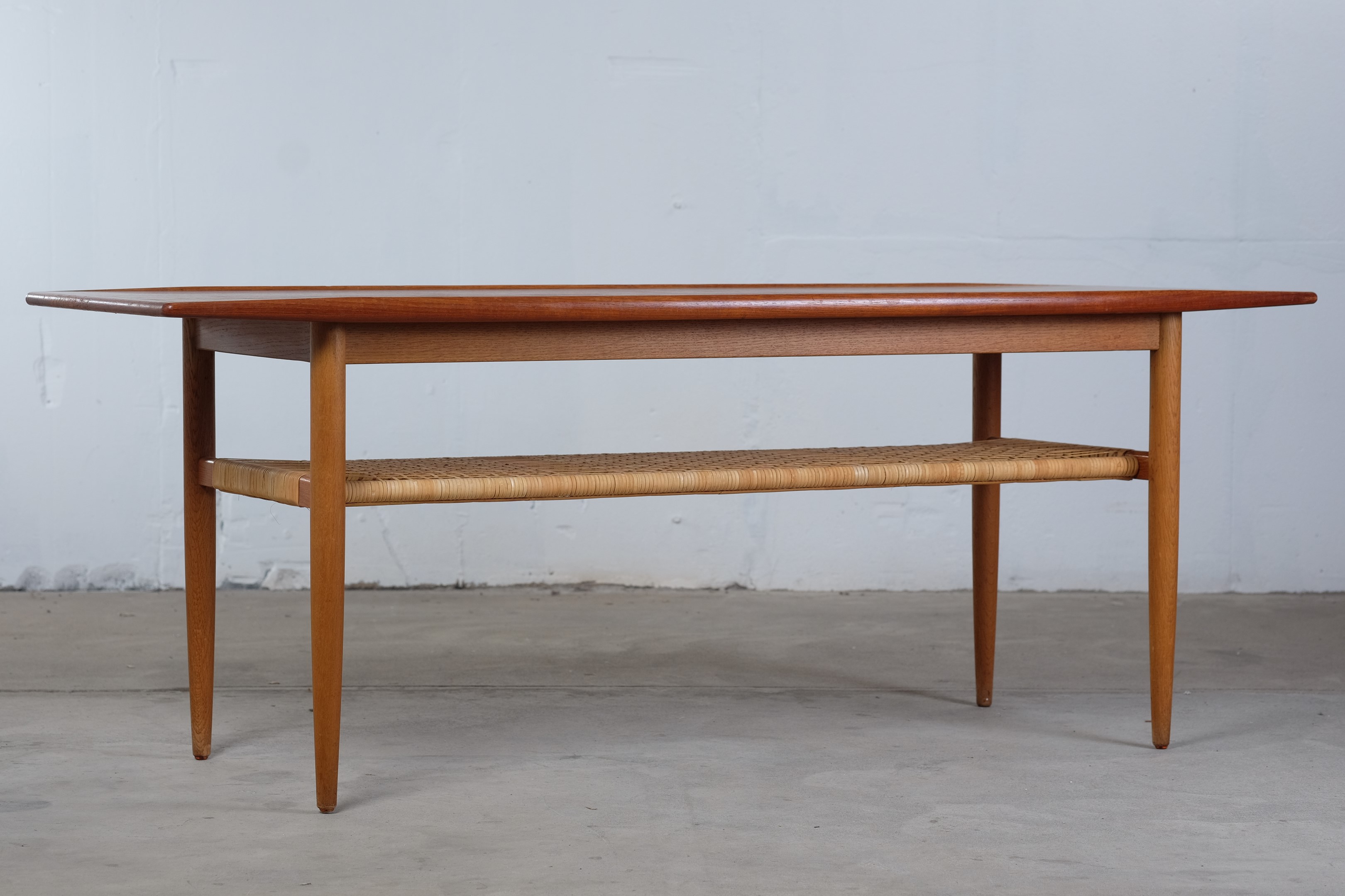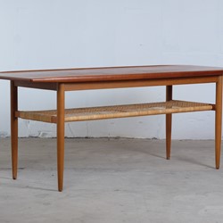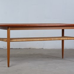 Beautiful table in teak with frame in solid oak. The table features a raised edge on both sides and a underneath shelf with woven cane which are in good condition. Stunning table there would suit virtually any modern living environment.