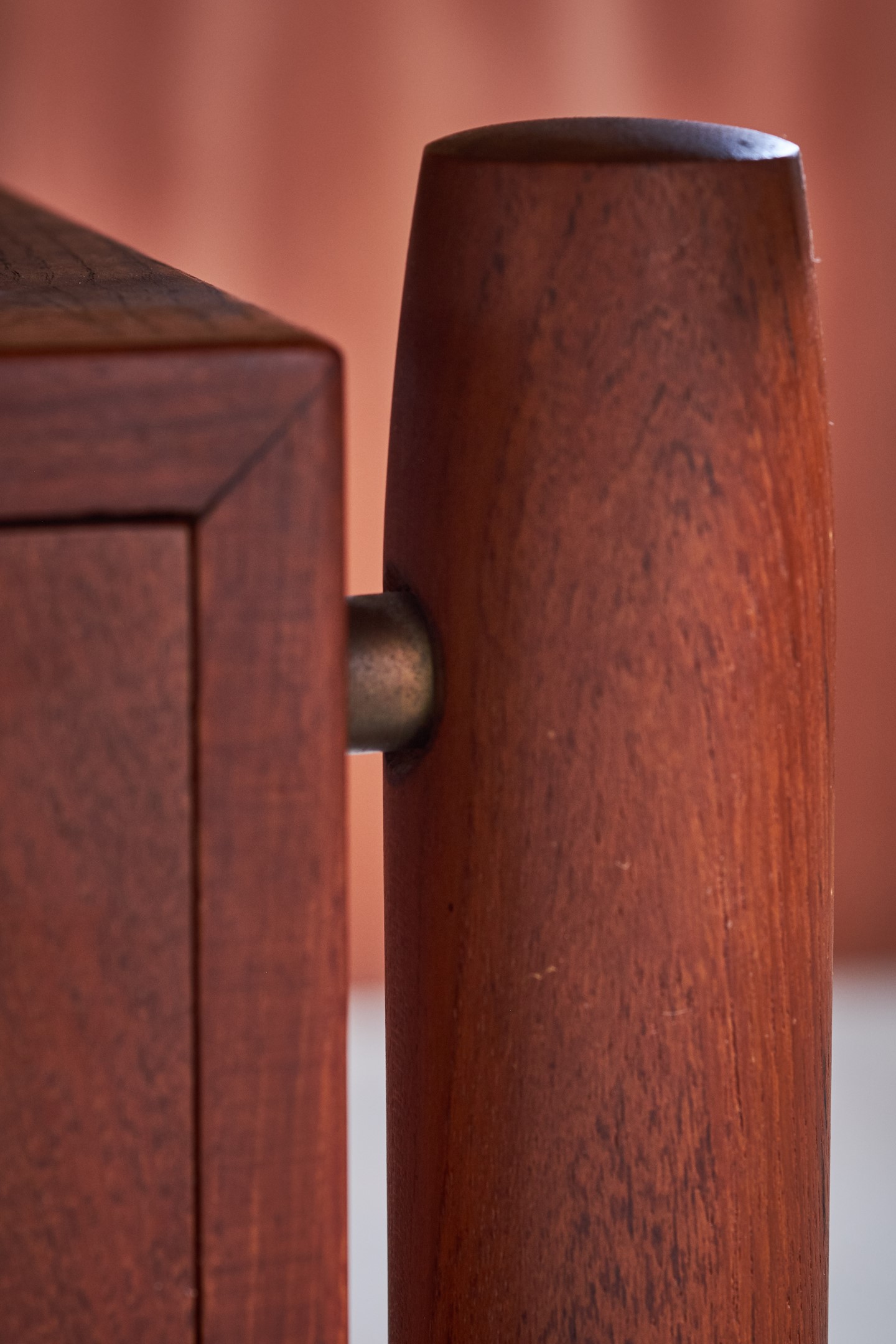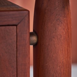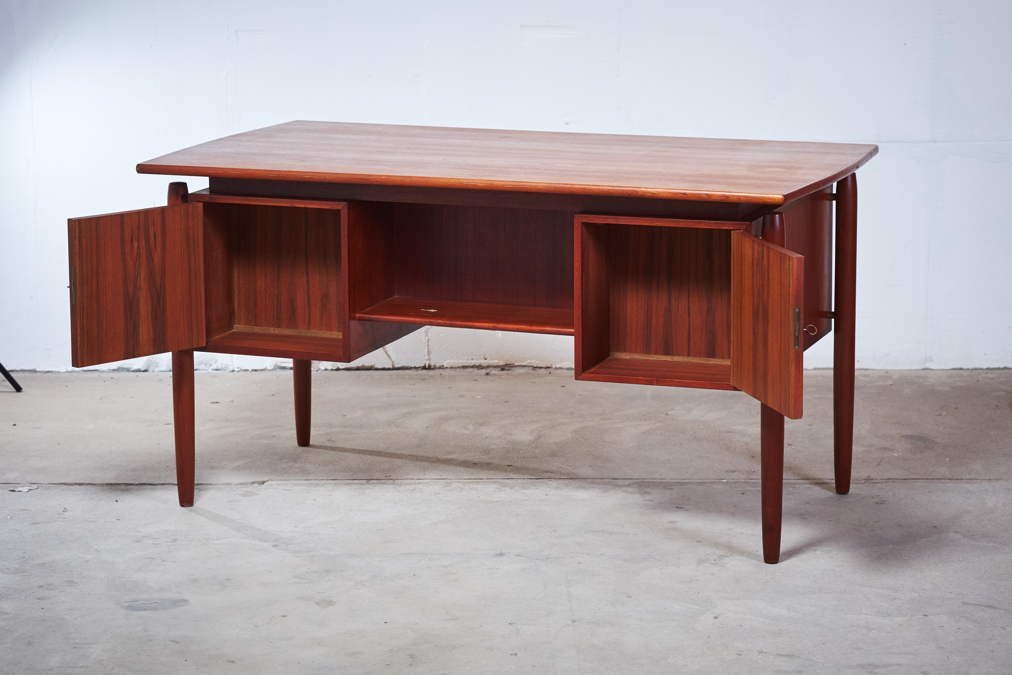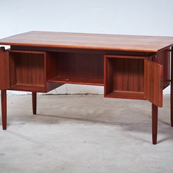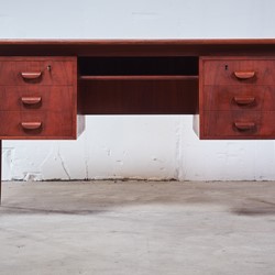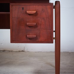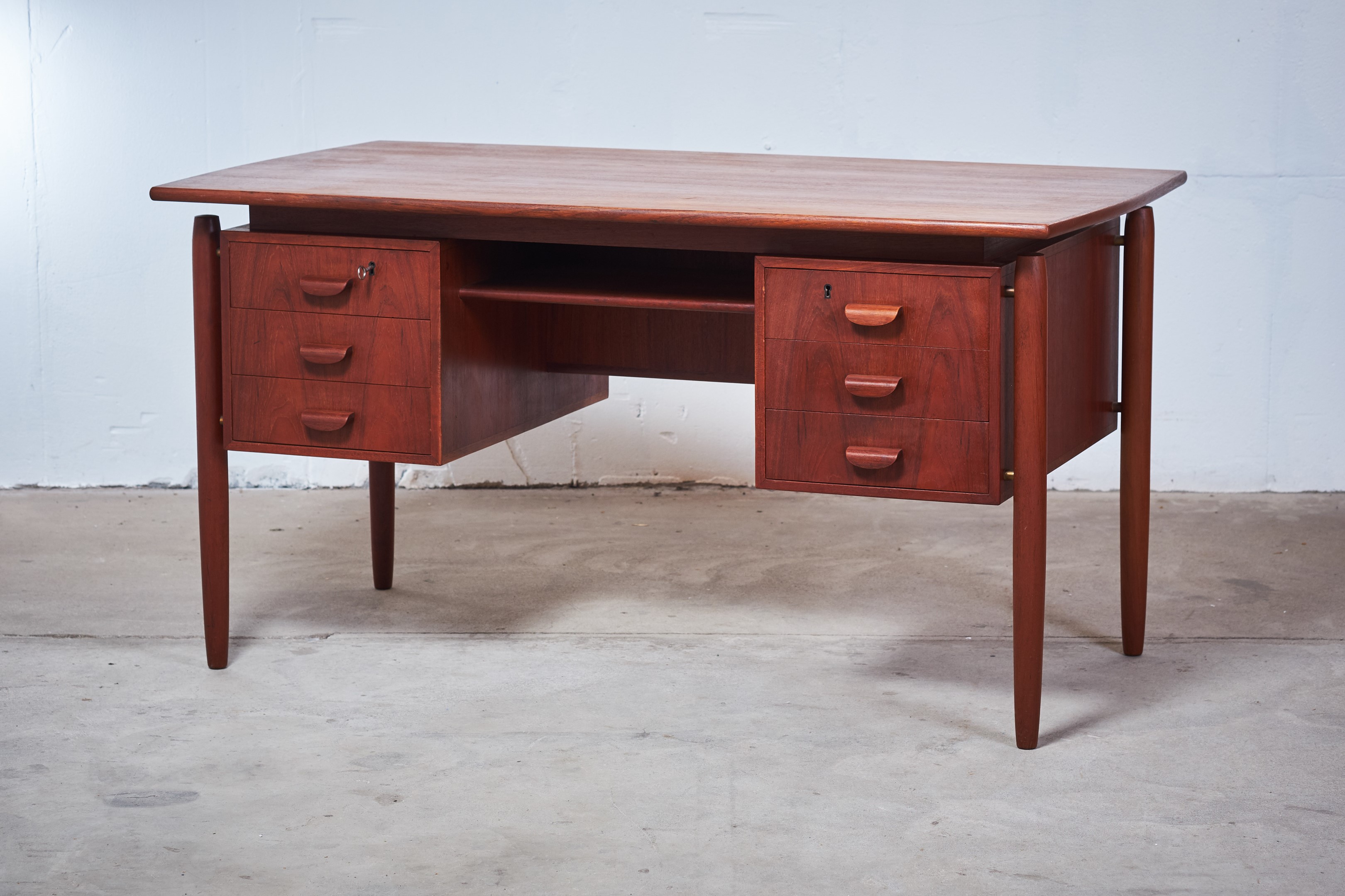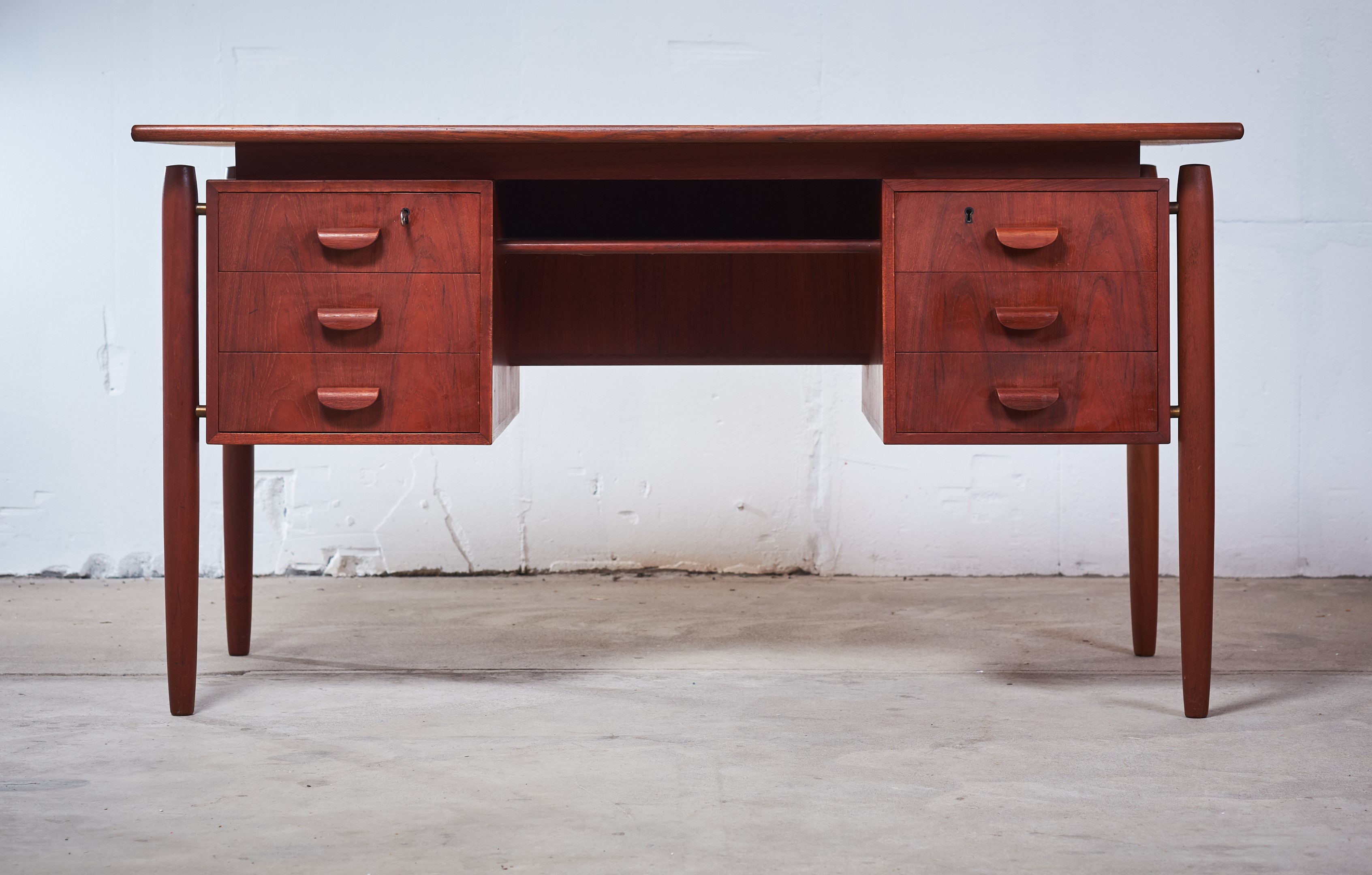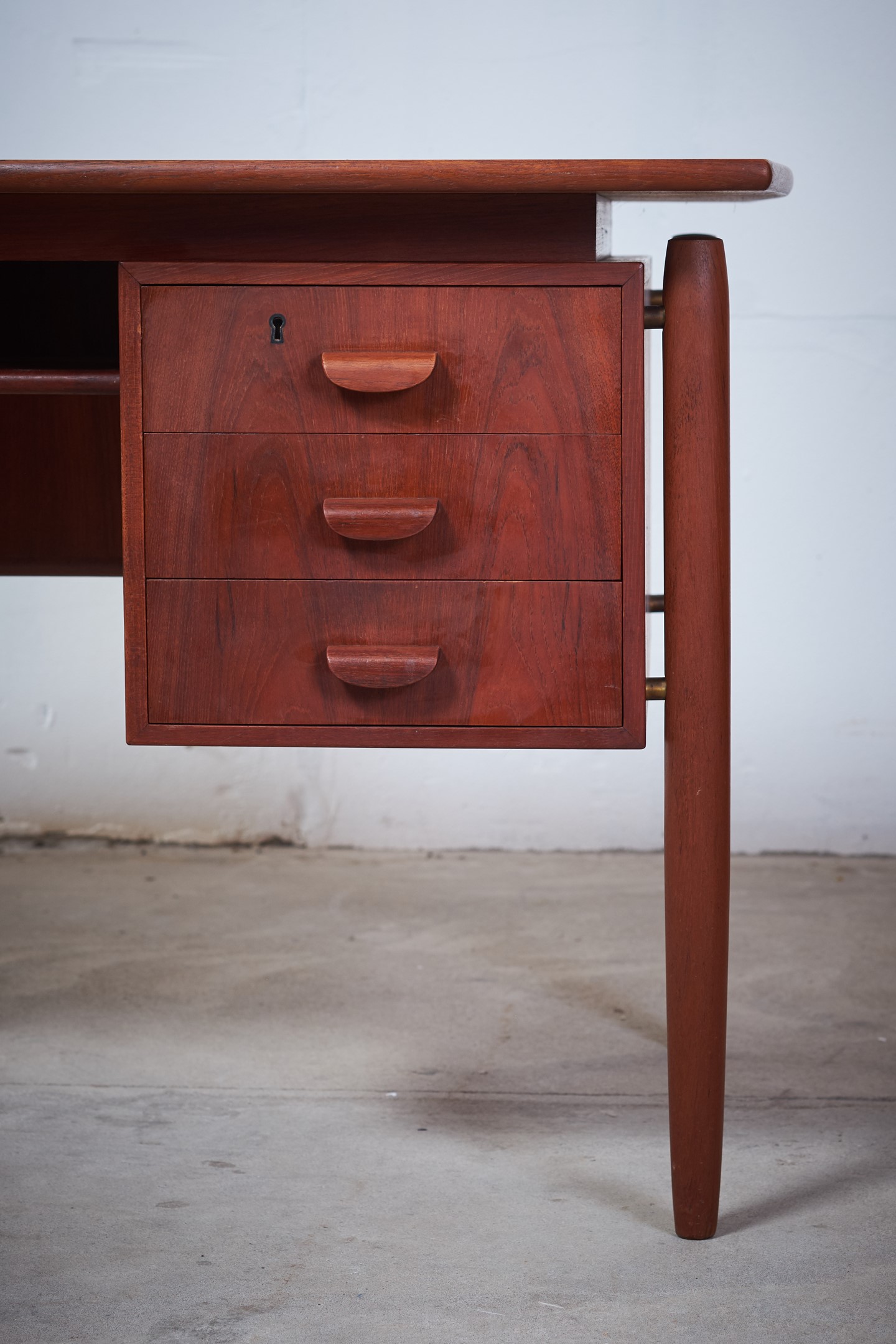Beautiful desk in teak, Danish design. Features, floating top plate, brace details, 6 drawers with good storage room and some really beautiful grips.