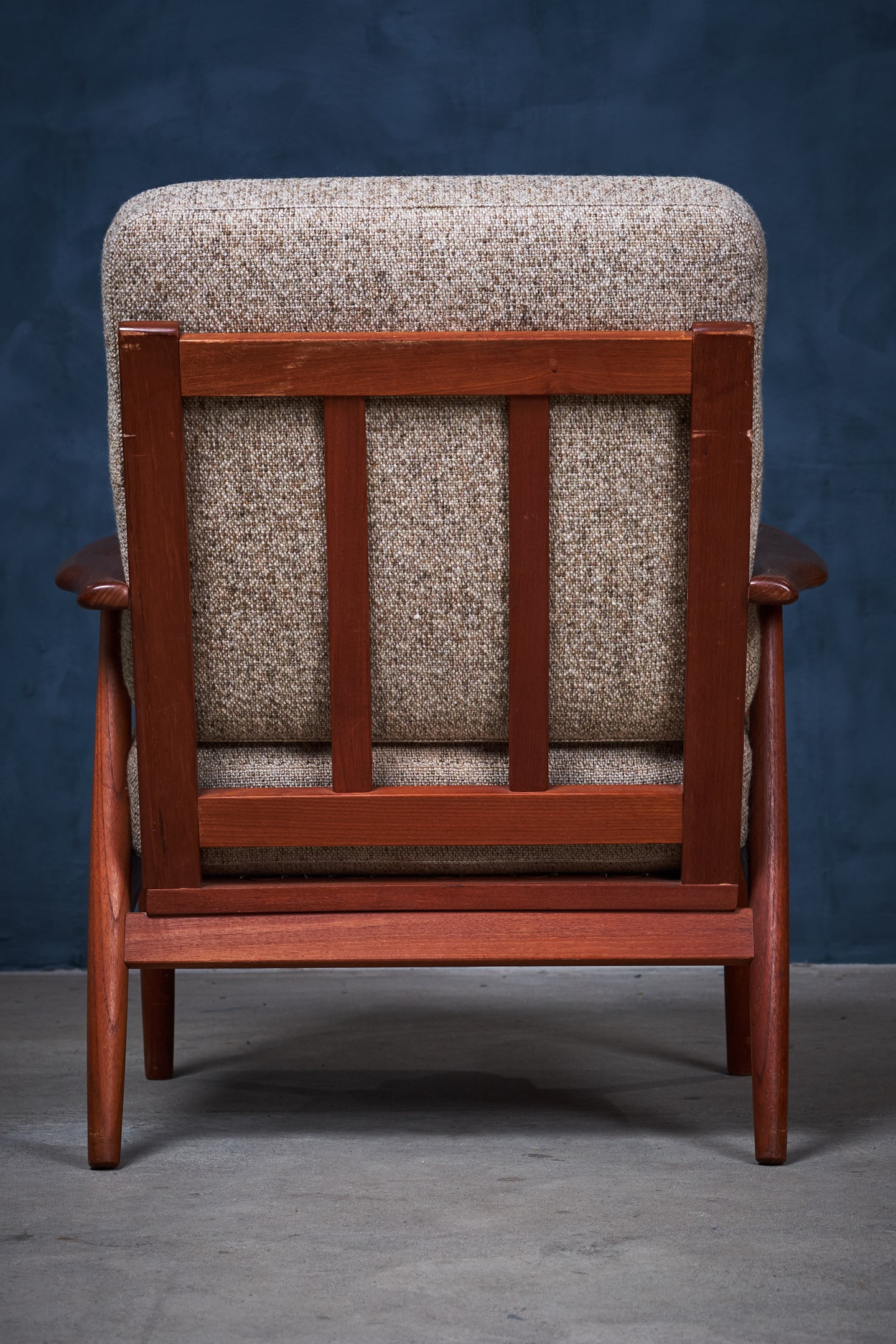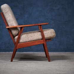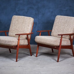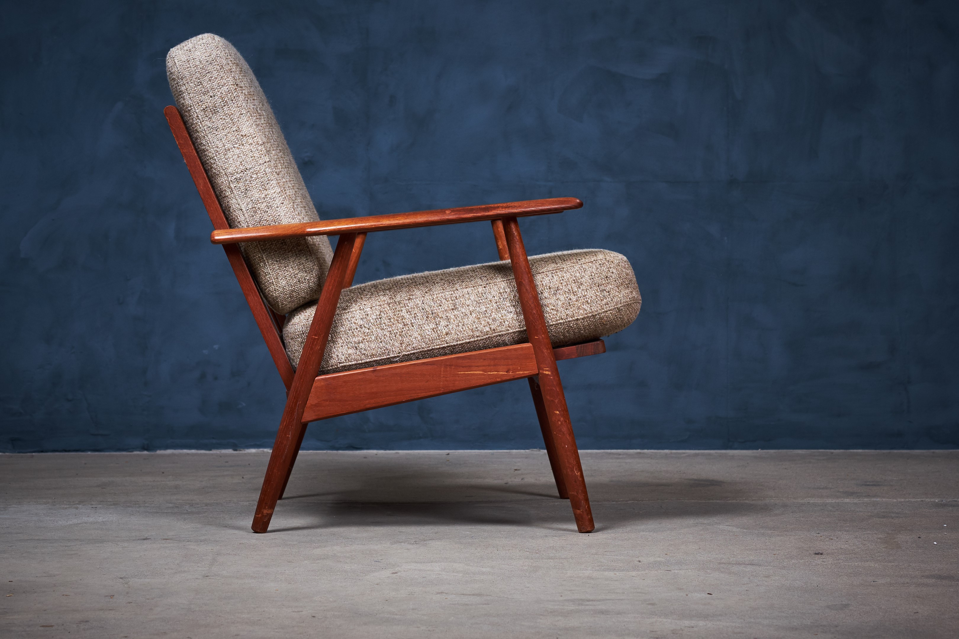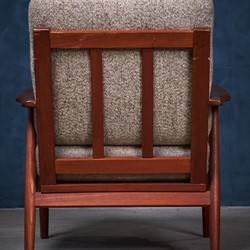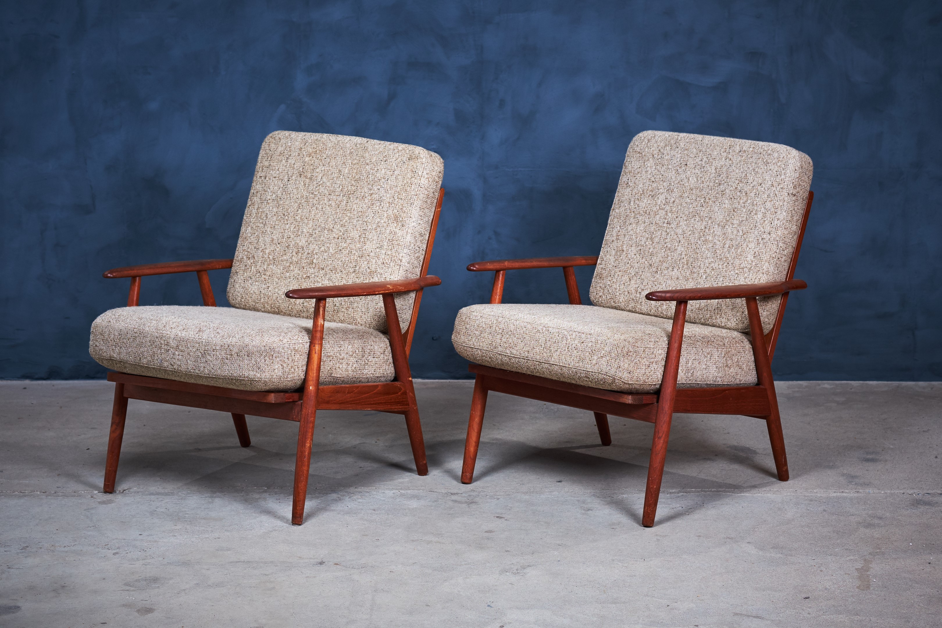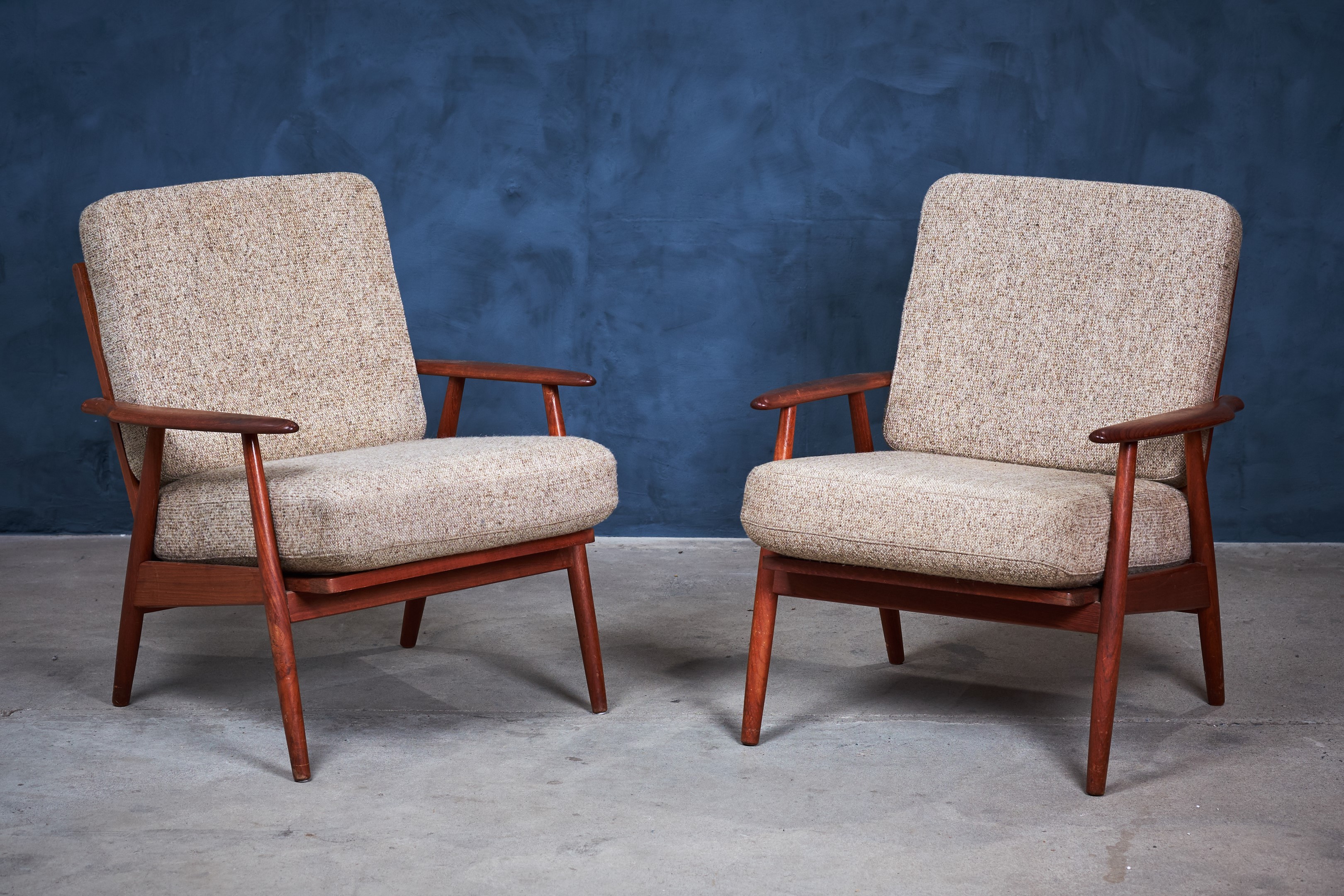 Beautiful set of minimalist lounge chairs in teak. The chairs provides really good seating comfort and would be a great addition to any modern environment. Danish design, from the 1960s era. The cushions are in wool and with springs, the cushions are in vintage condition, with few signs of patina.