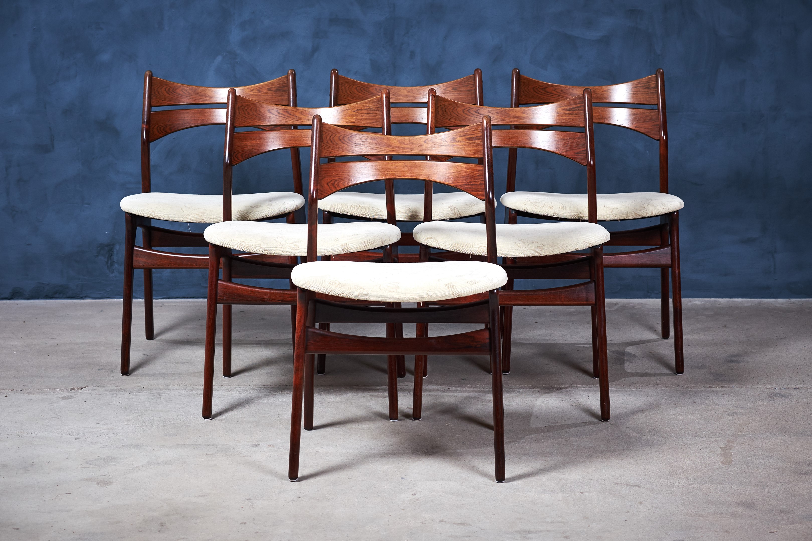 A set of six Rosewood dining chairs Model 310 by Erik Buch and produced at Christian Christensens Møbelfabrik - gently restored, in really good original vintage condition. Elegant with soft, organic lines and the curvature of the rosewood backrest and the rosewood frame supports the human body perfectly, making it an extremely comfortable dining chair. It would add style and class to any dining room.The Model 310 chair is a beautiful example from the Danish modern era, constructed of solid rosewood frame with curved rosewood backrest and floating seat.