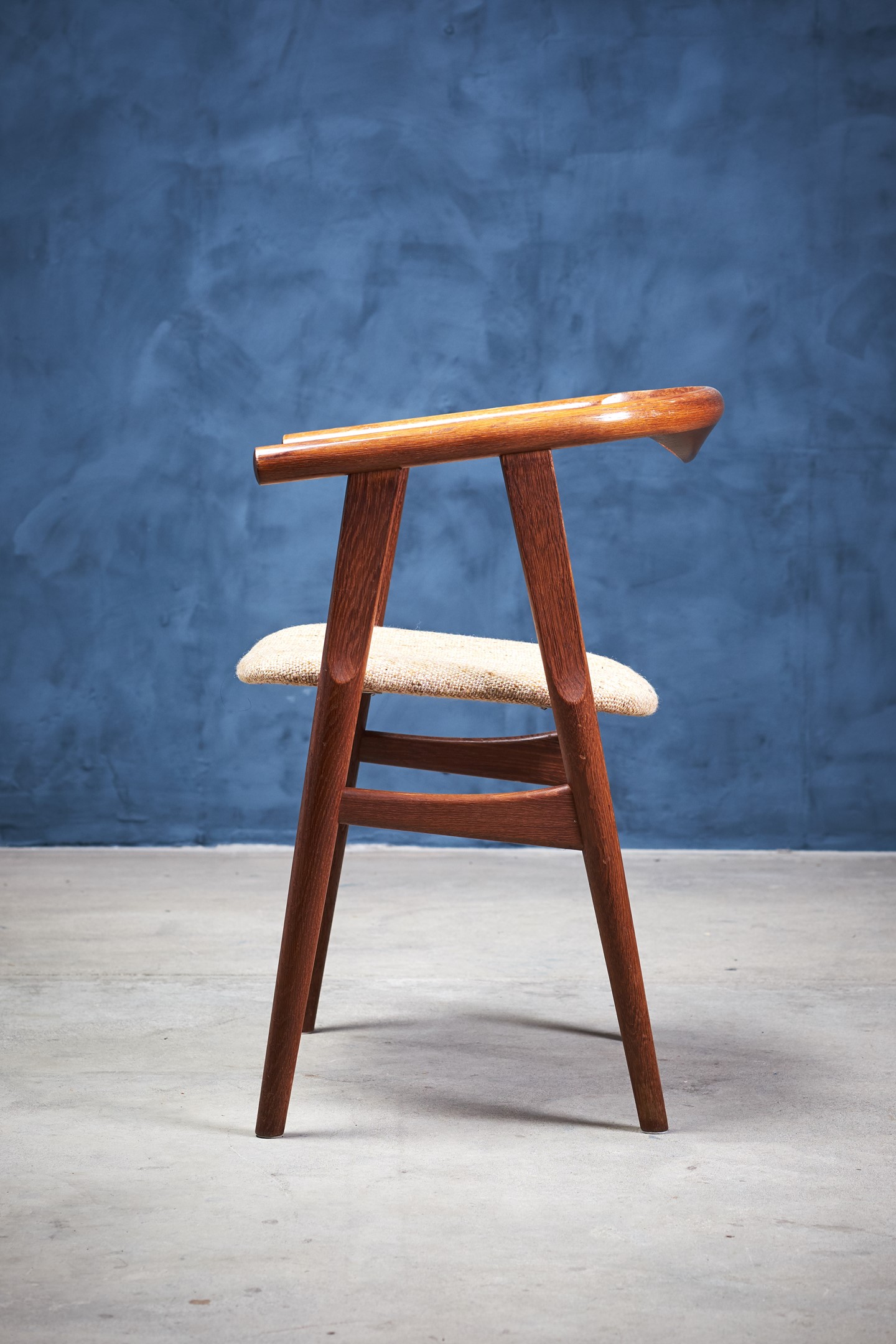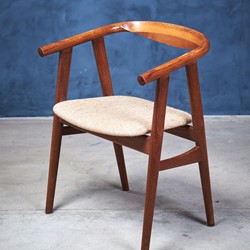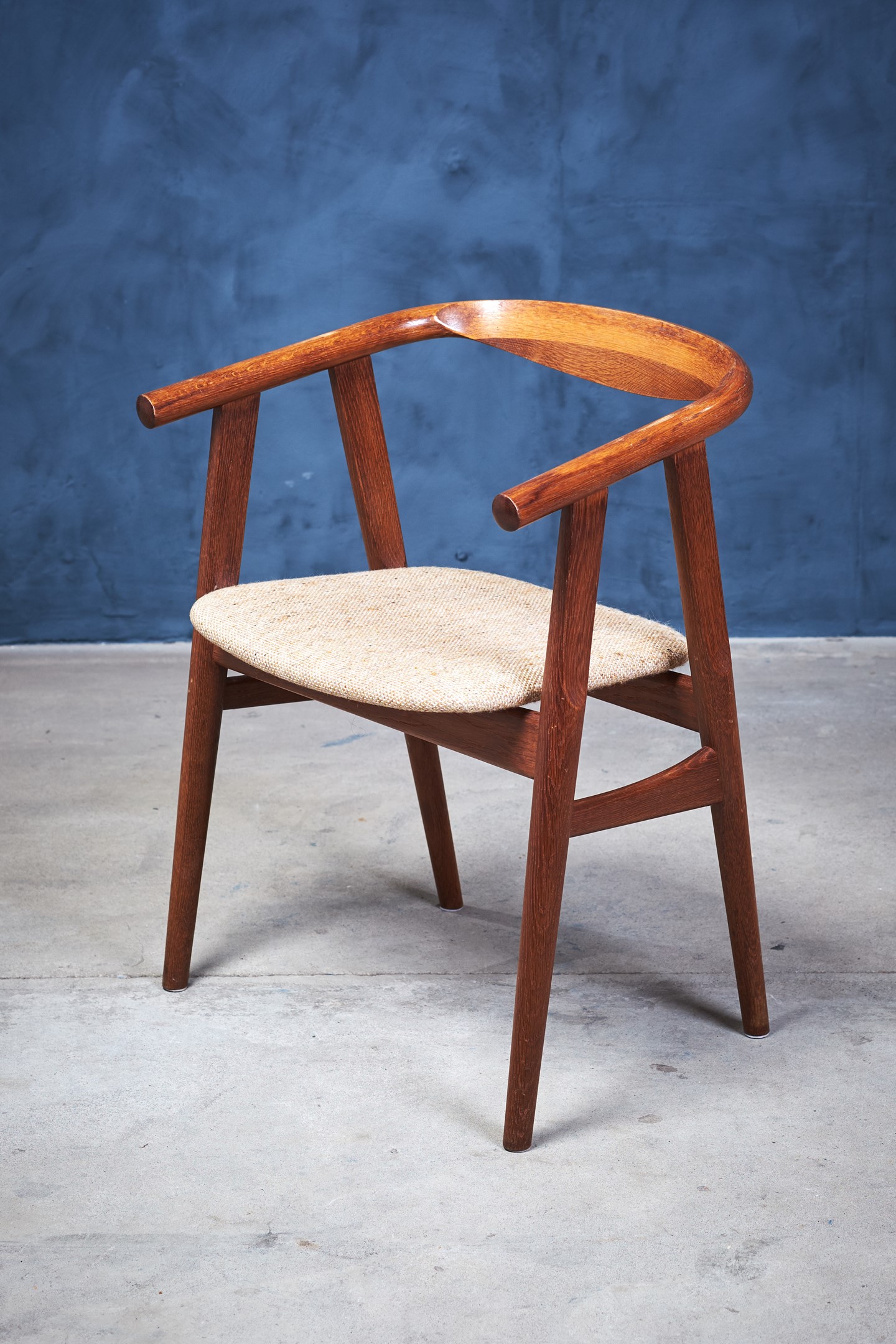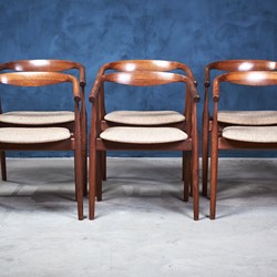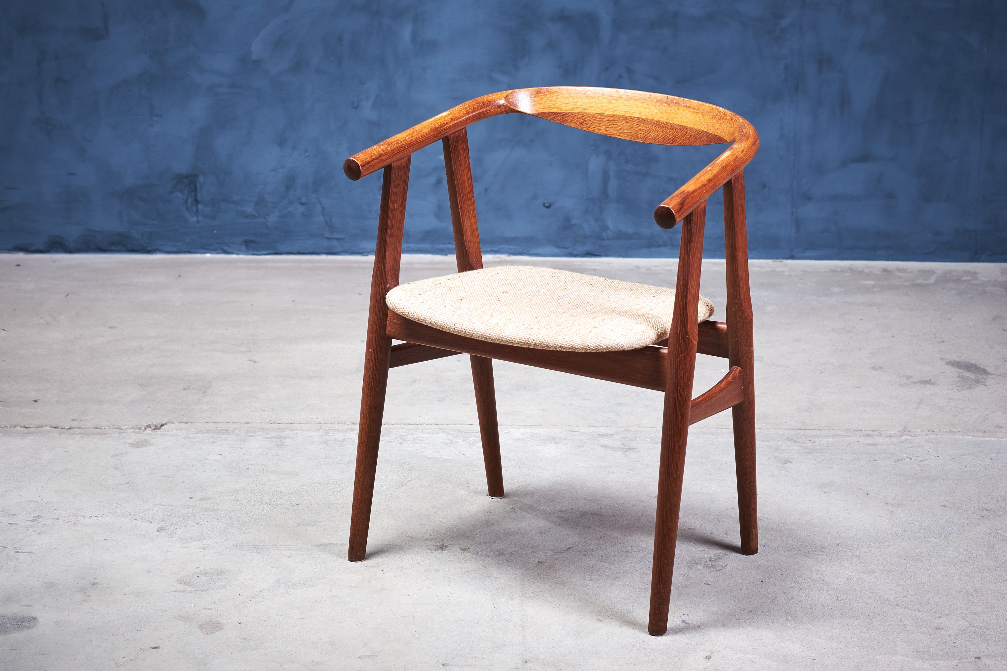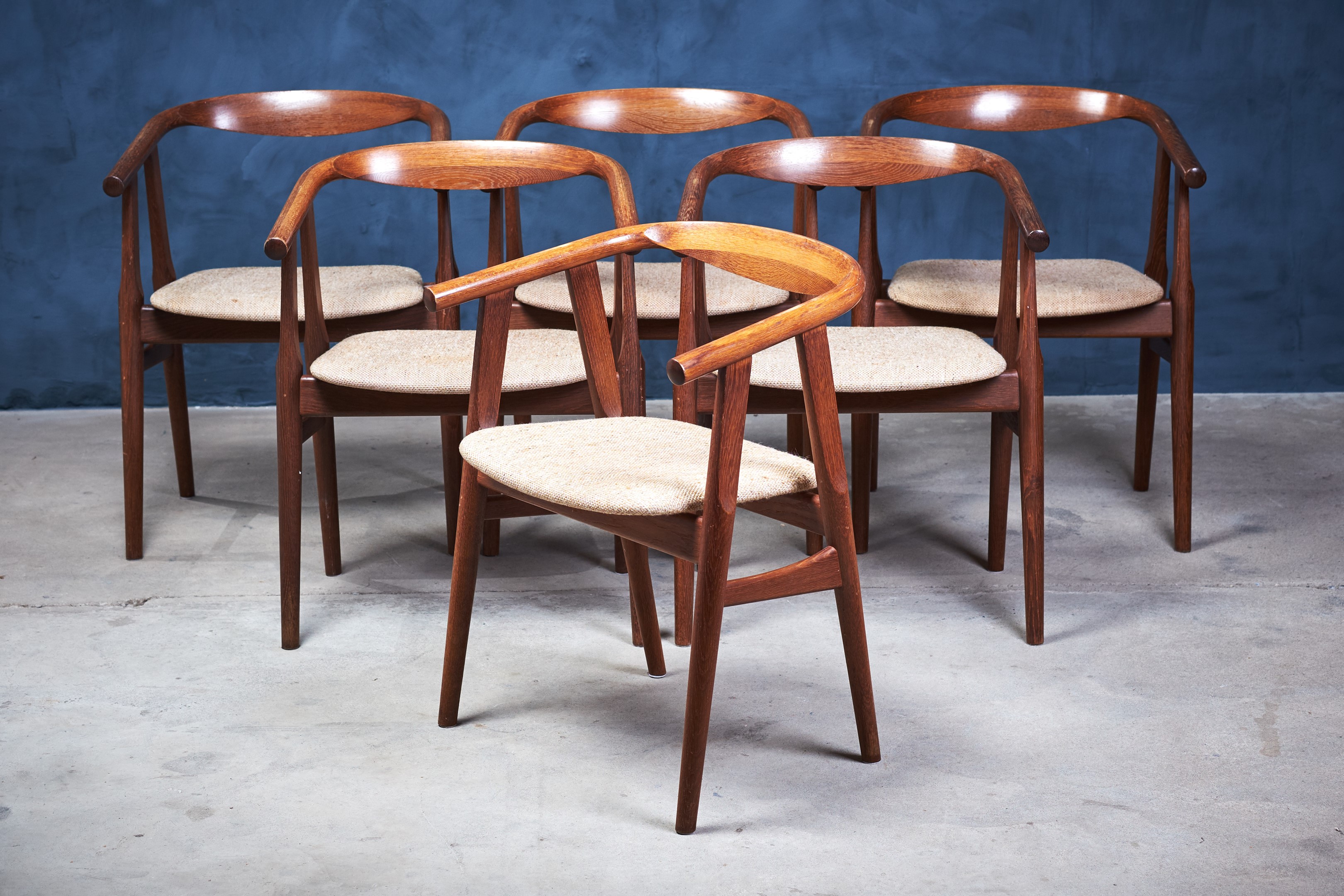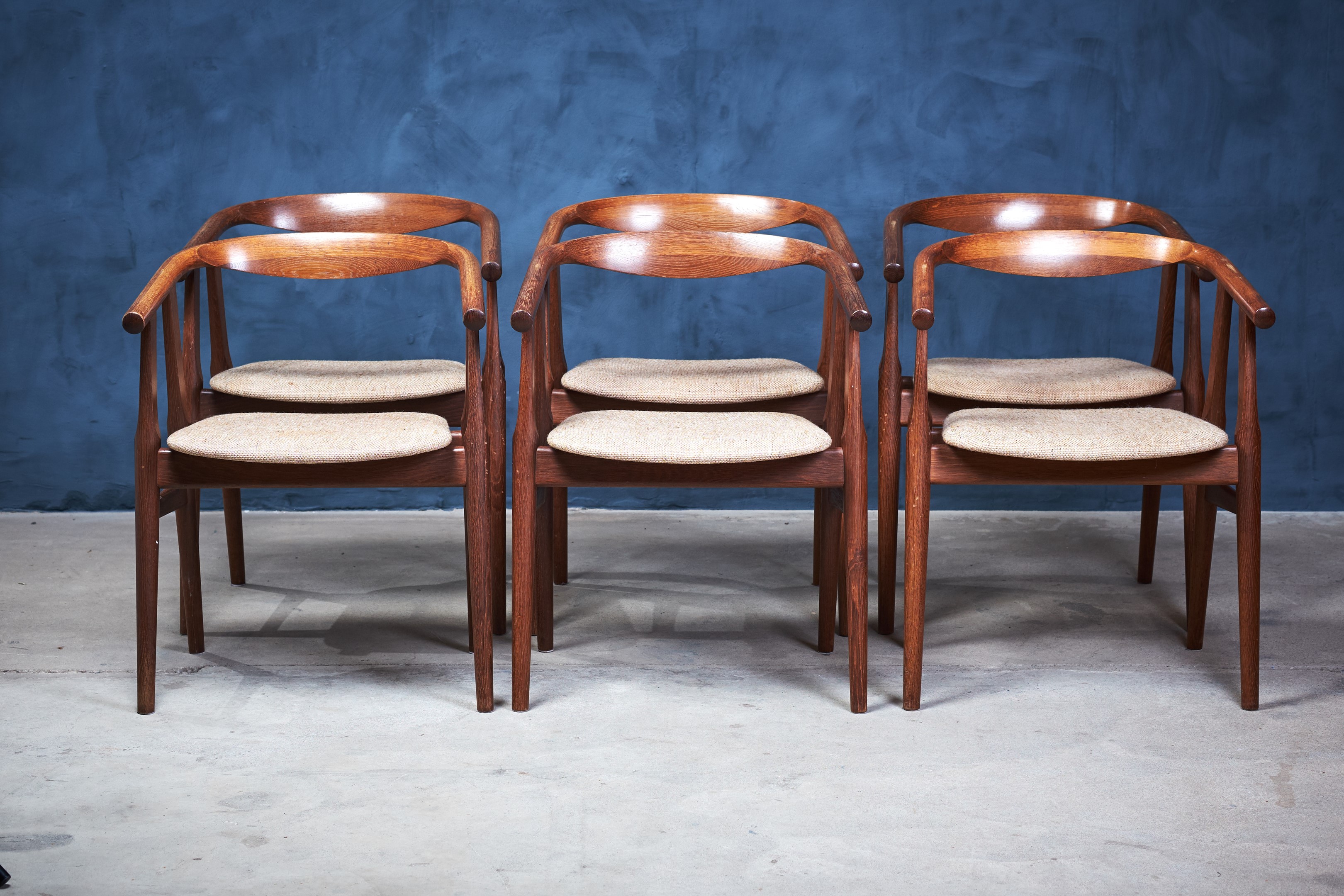 Set of six dining room chairs, model GE525, designed by Hans J. Wegner and manufactured by GETAMA in the 1960s. The chairs are in 'smoked' oak and upholstered in light fabric. The chairs are in great vintage condition.