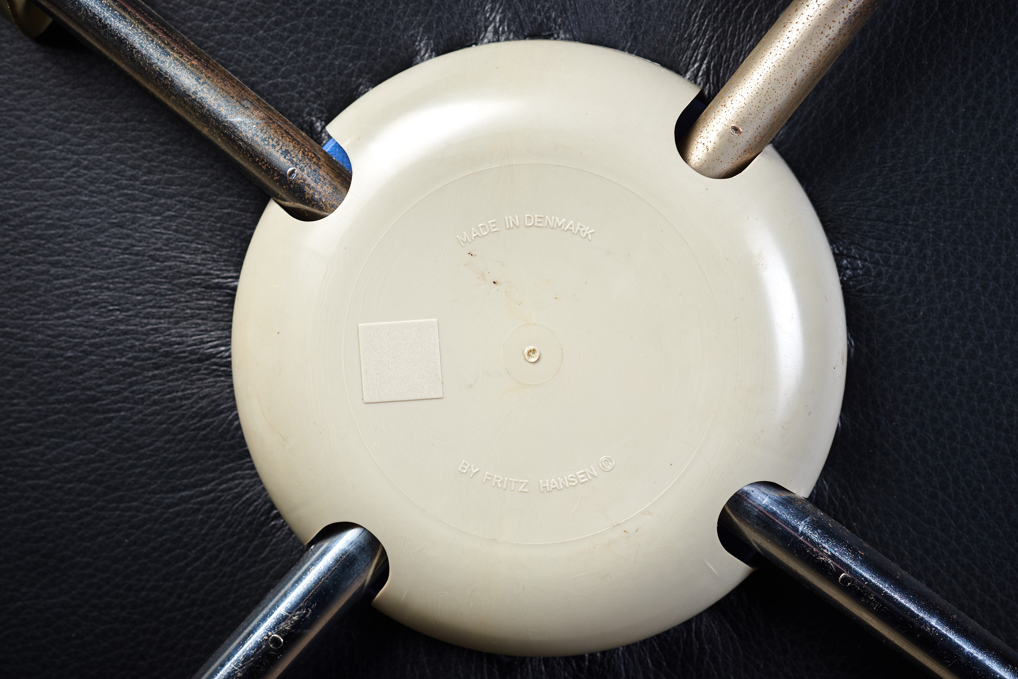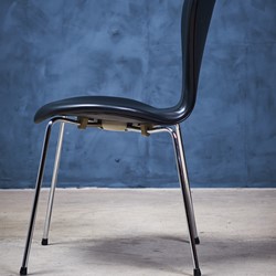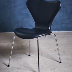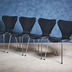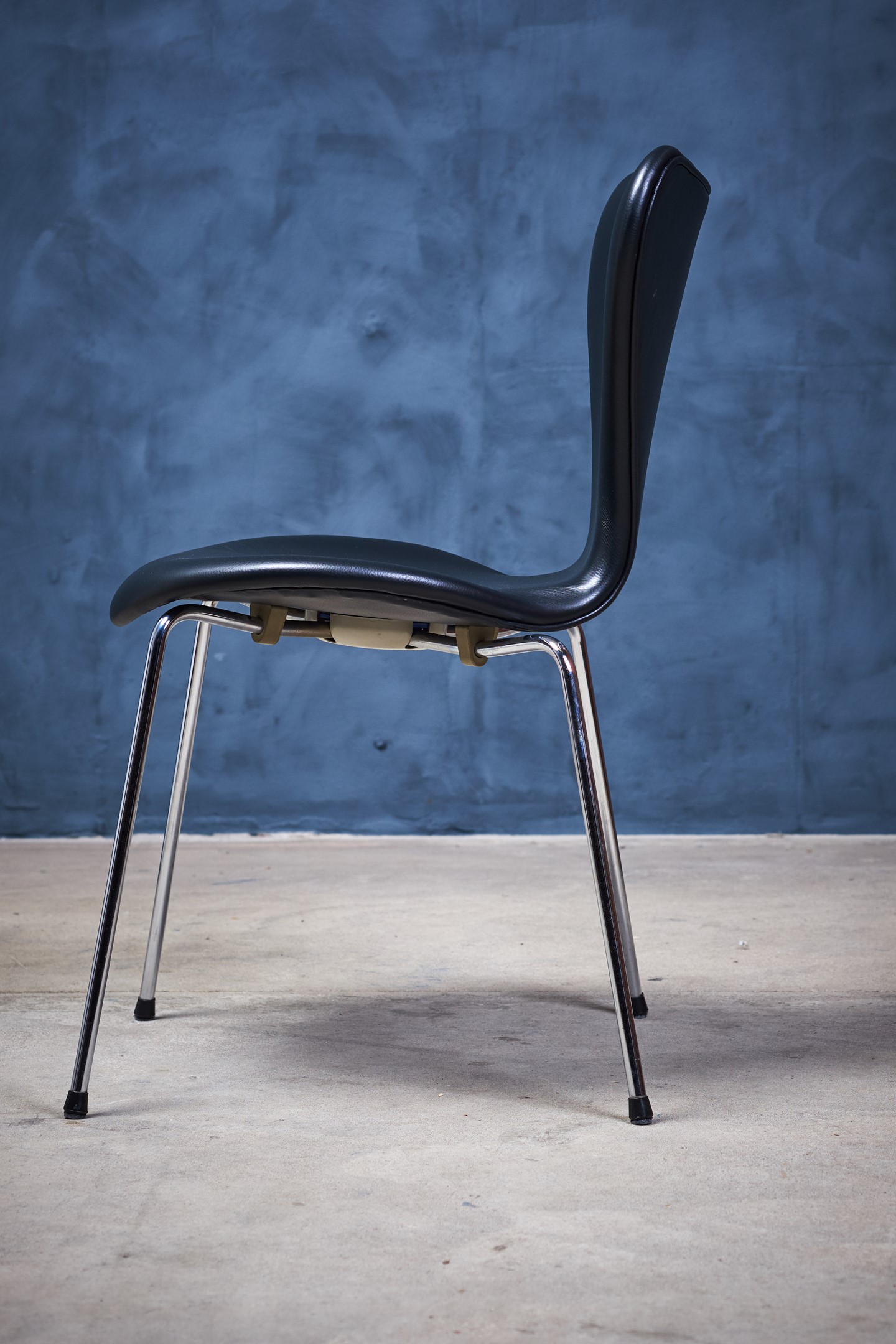 A set of four Seven chairs, model 3107, designed by Arne Jacobsen and manufactured by Fritz Hansen in the 1980s. The chairs are upholstered in black classic leather. Danish design by Arne Jacobsen at his best! We can upholster more chairs if needed, in any leather wanted.