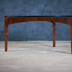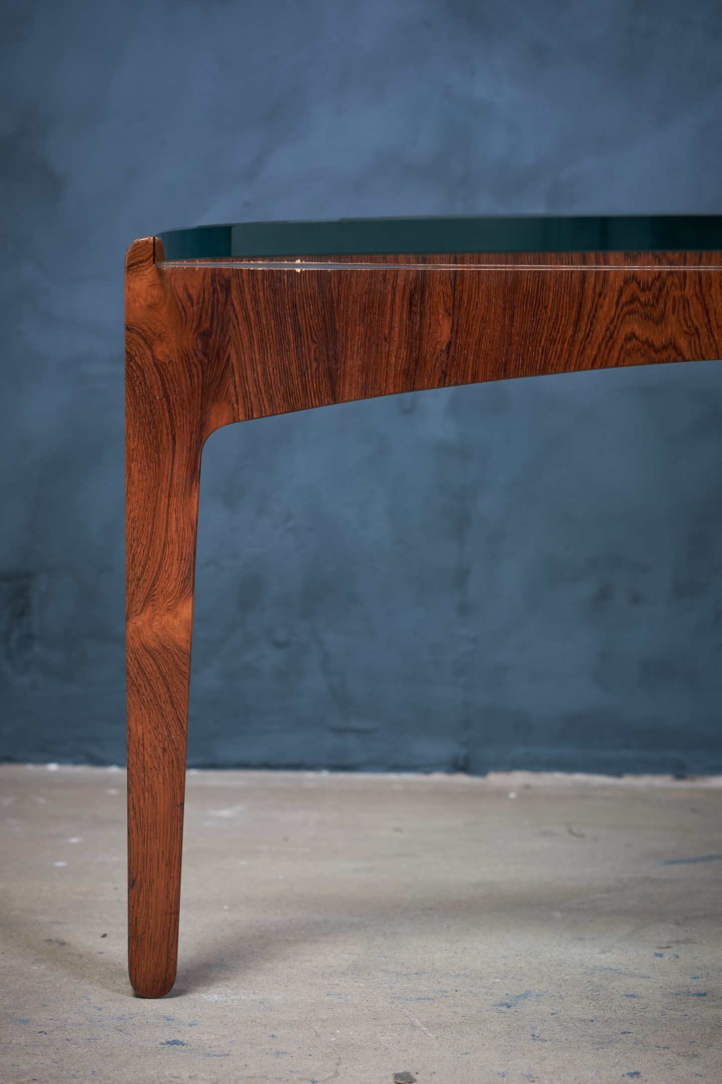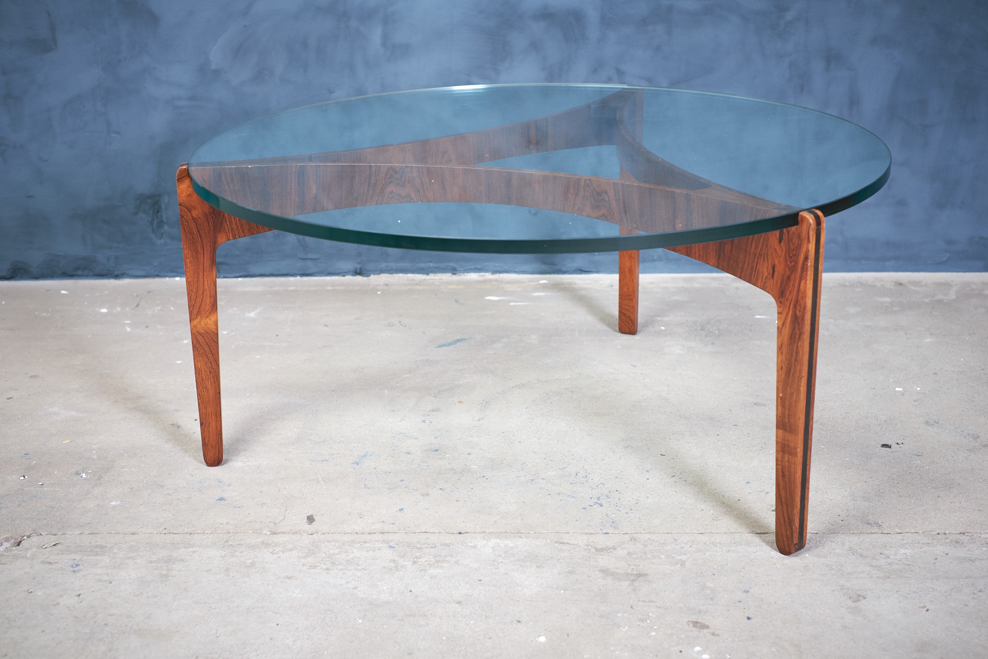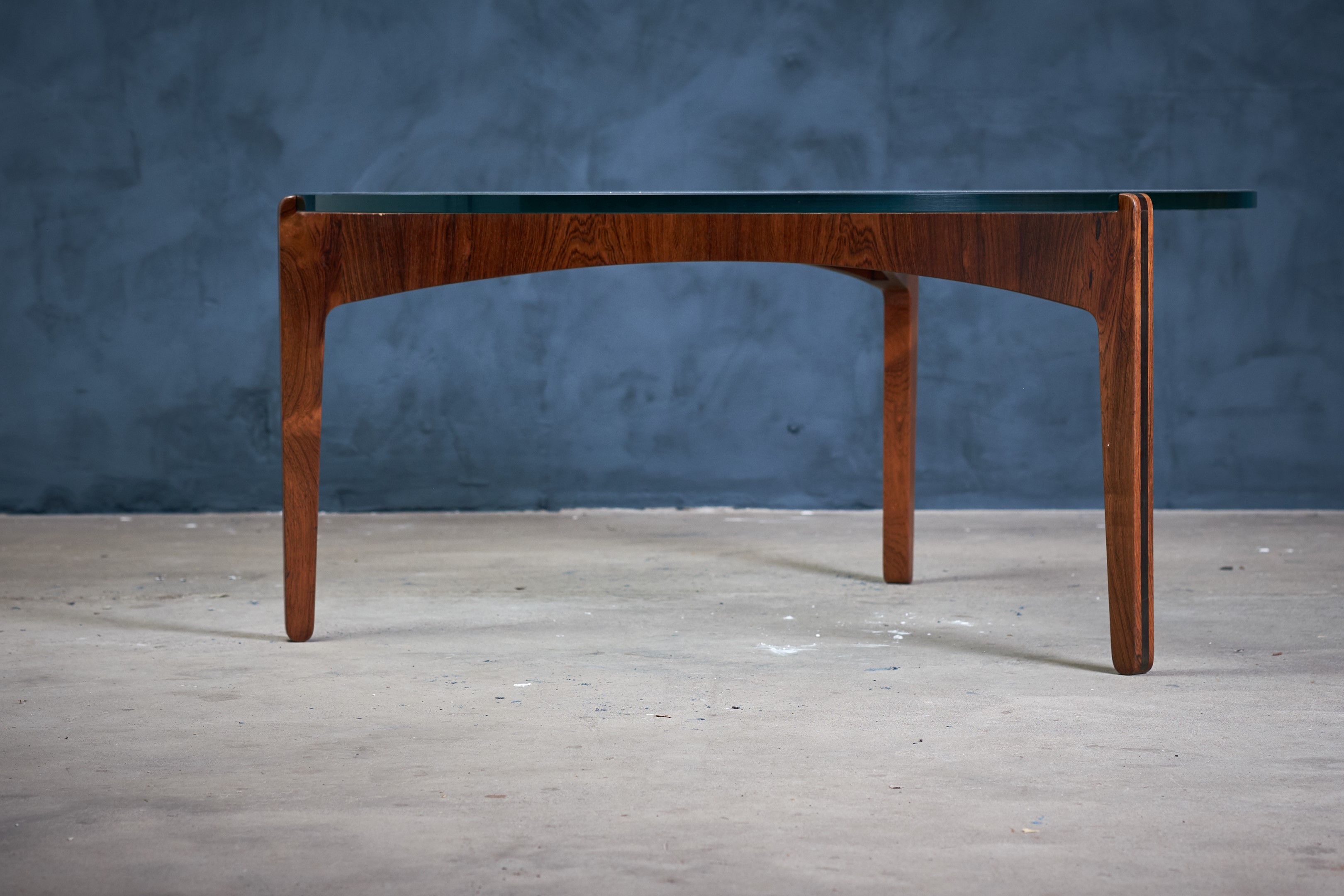 Beautiful coffee table in rosewood designed by Danish designer Sven Ellekaer in the 60s. This beautiful table features a thick and brand new glass plate in the original dimensions, not a scratch. Stunning frame with lot of beautiful details. This table would be a great addition to any modern environment.
