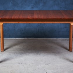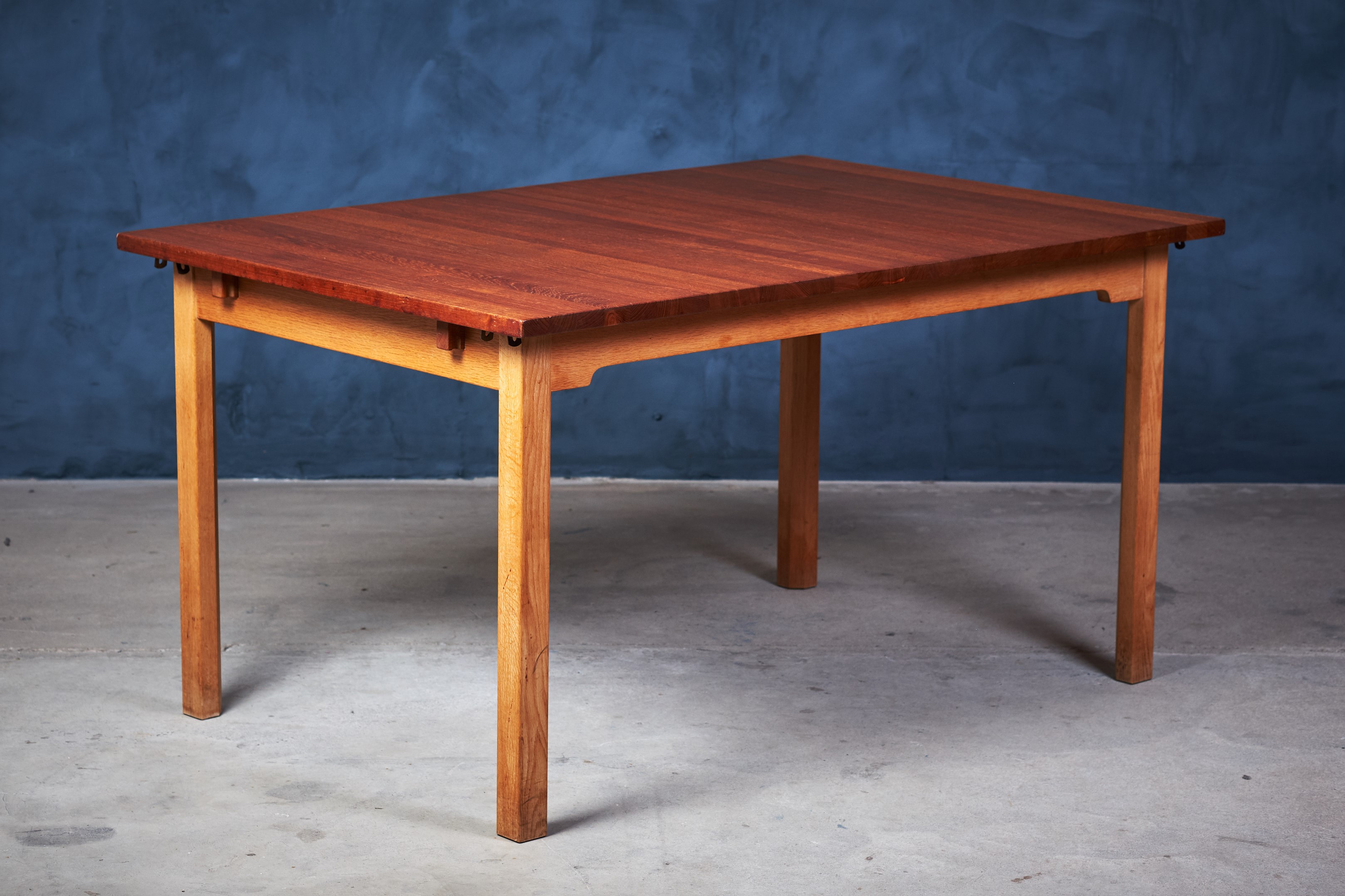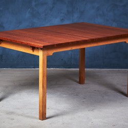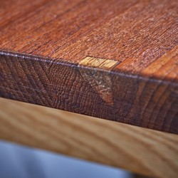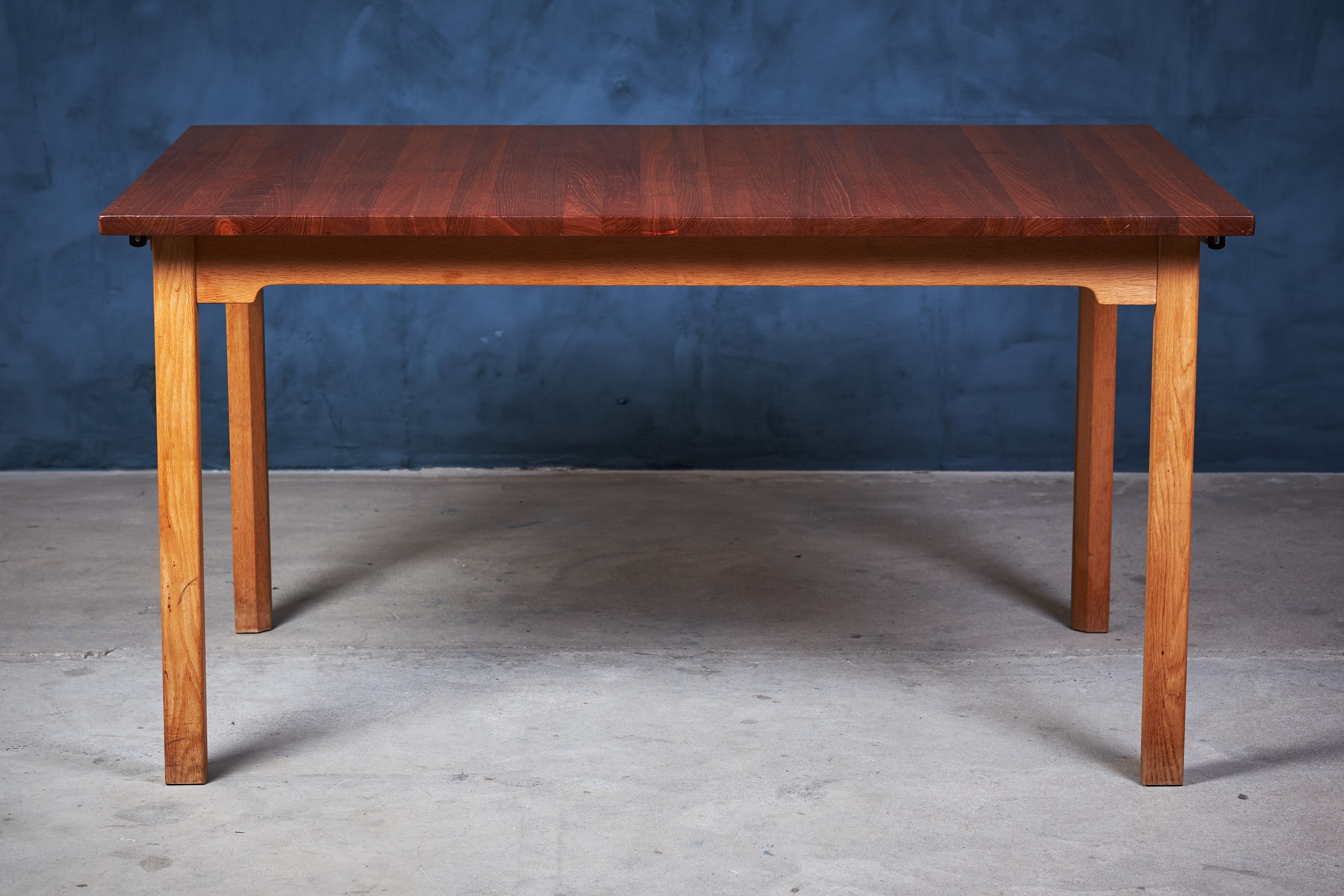 Solid dining table in teak and oak. Not very offen you see solid teak top on tables. Very beautiful table and the oak and teak works perfectly together. Two extension folding plates can be mounted in some brass brackets. Would be a great addition to any modern dining room.
