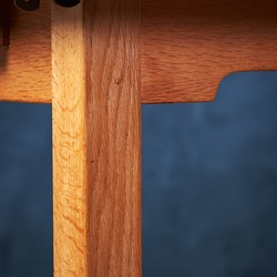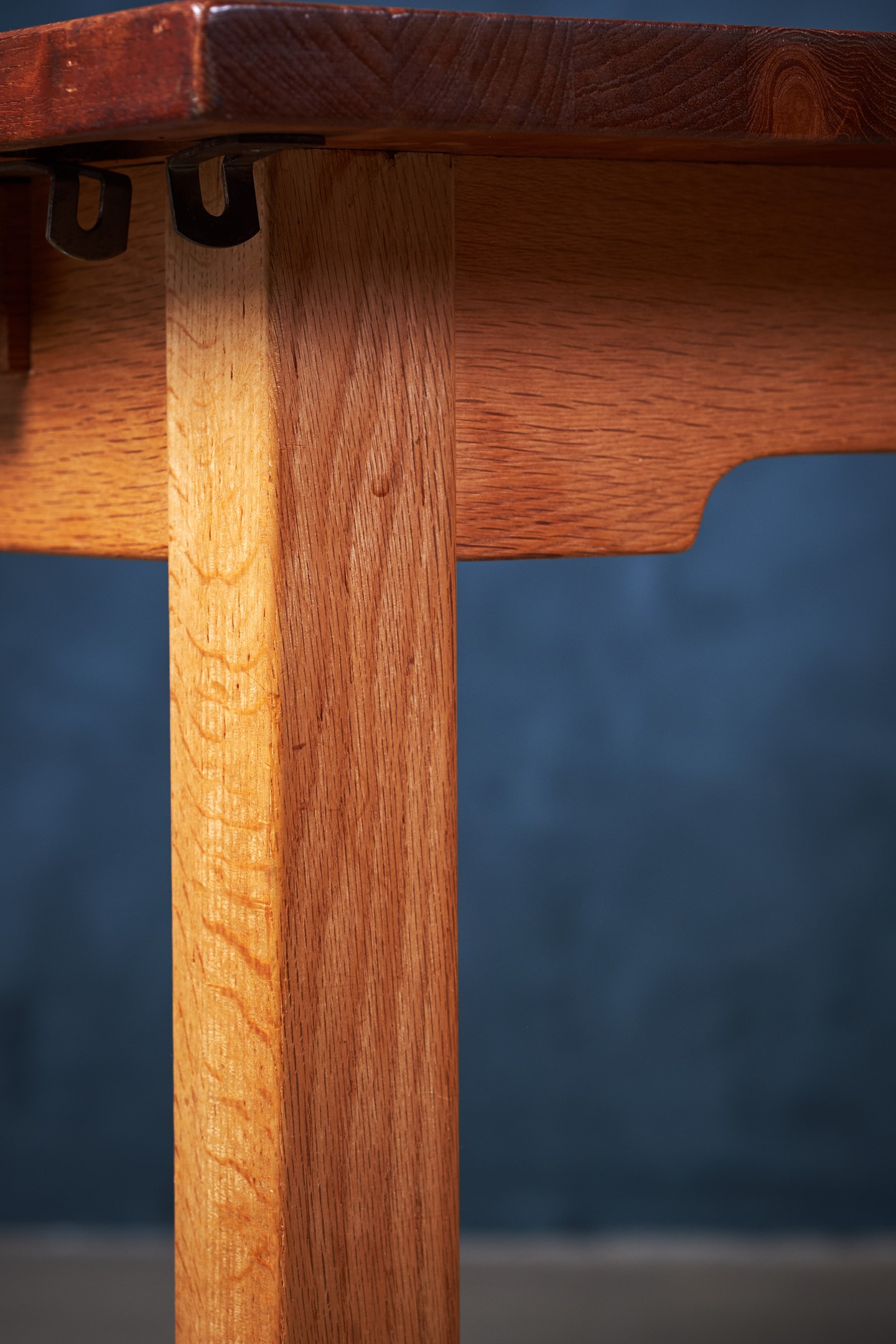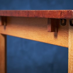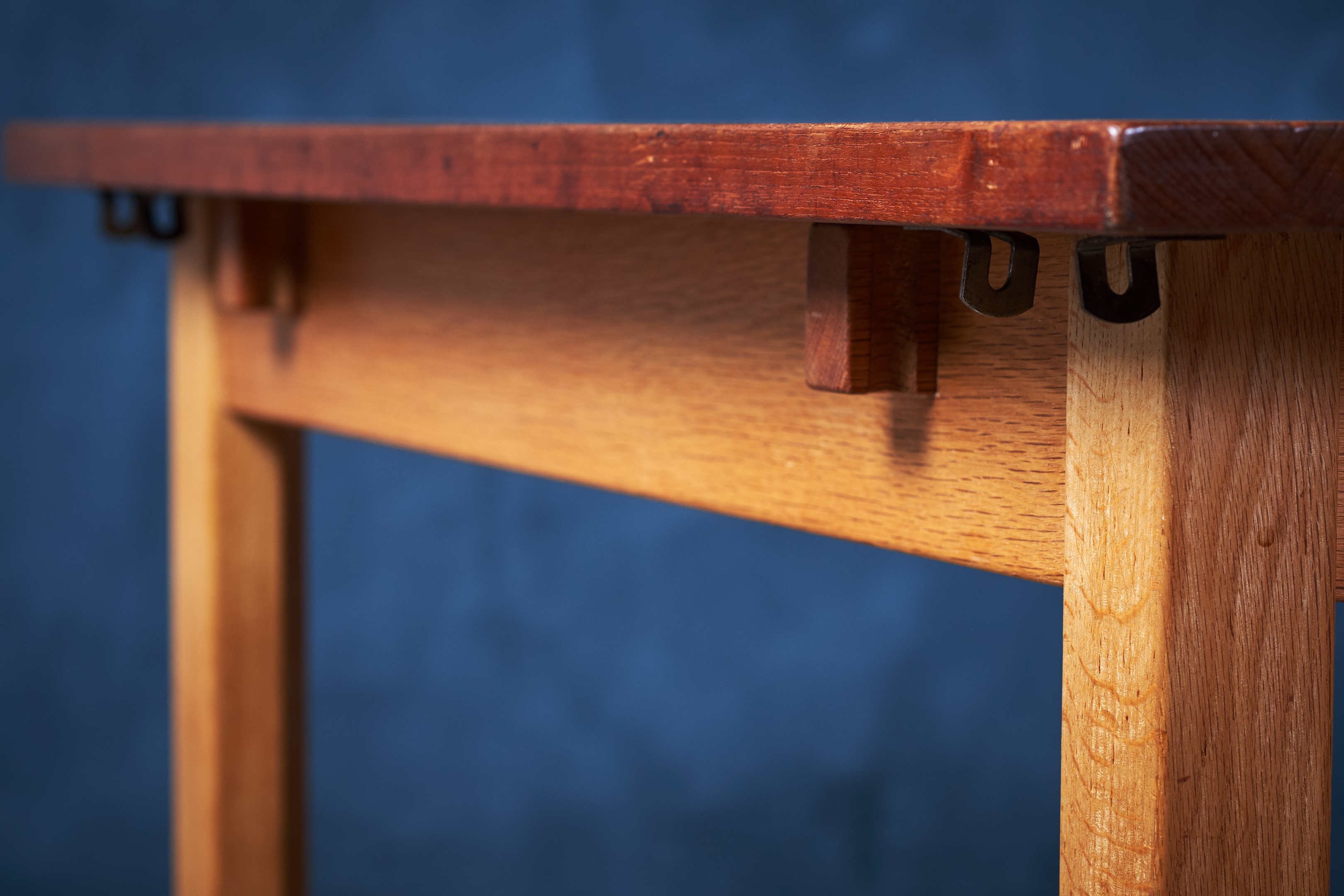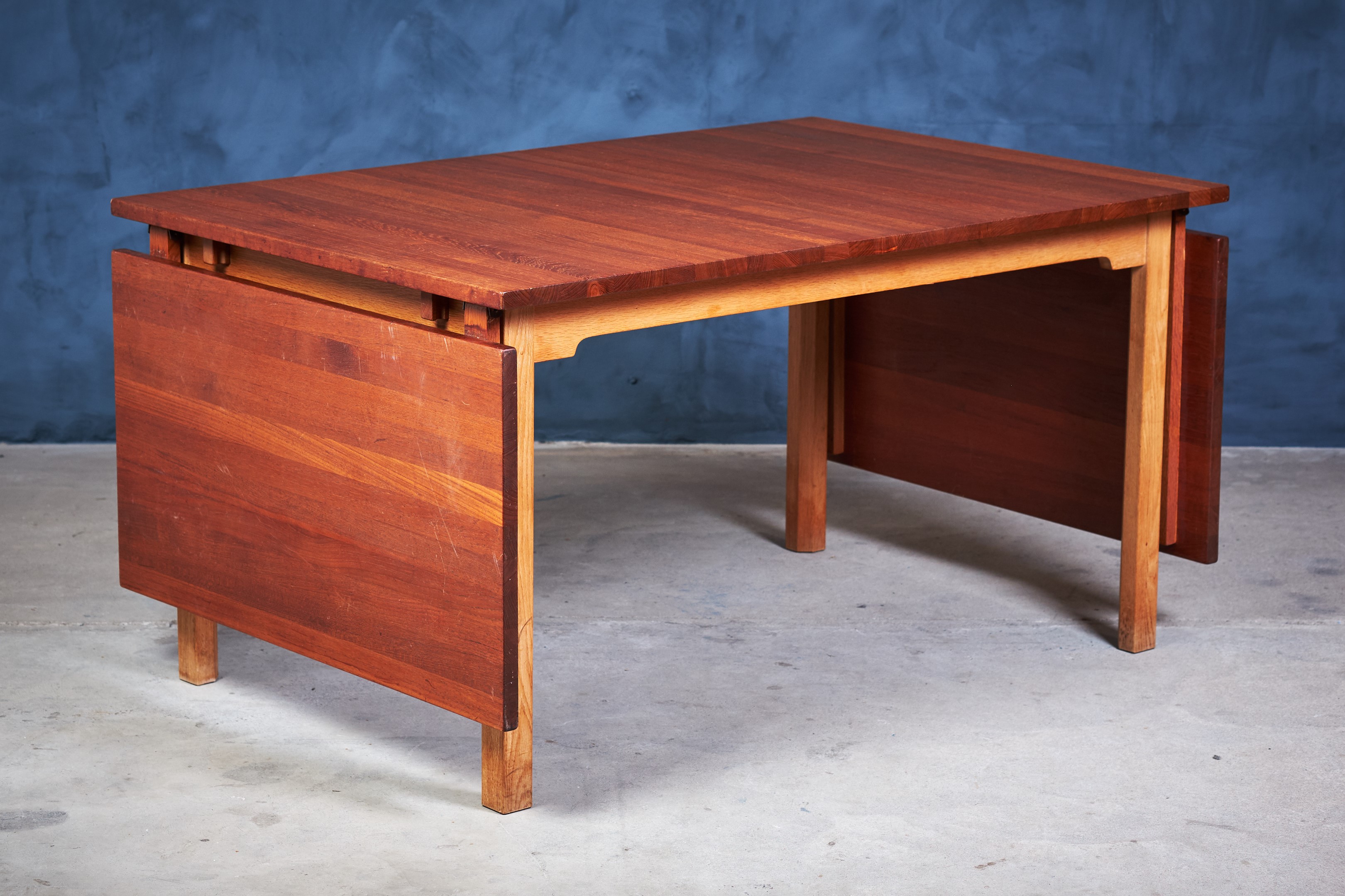 Solid dining table in teak and oak. Not very offen you see solid teak top on tables. Very beautiful table and the oak and teak works perfectly together. Two extension folding plates can be mounted in some brass brackets. Would be a great addition to any modern dining room.
