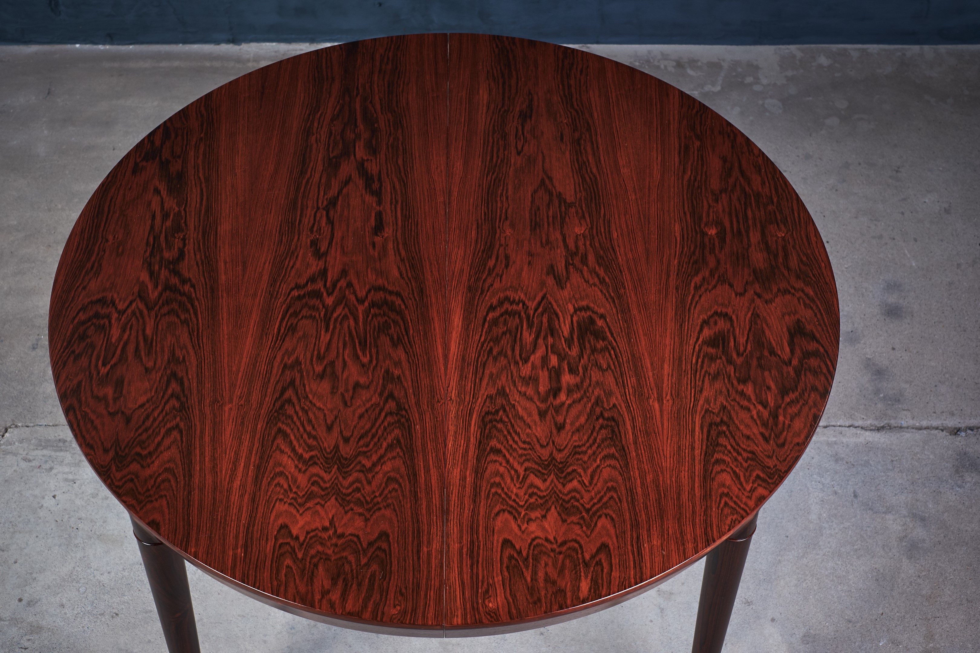 Round dining table in rosewood with two leafs for extension. Designed by the Danish designer Severin Hansen. The table has been totally renovated and got new lacquer by a professionel carpenter. Amazing grains in the rosewood which gives a fantastic look. This table would fit in any modern environment.