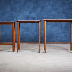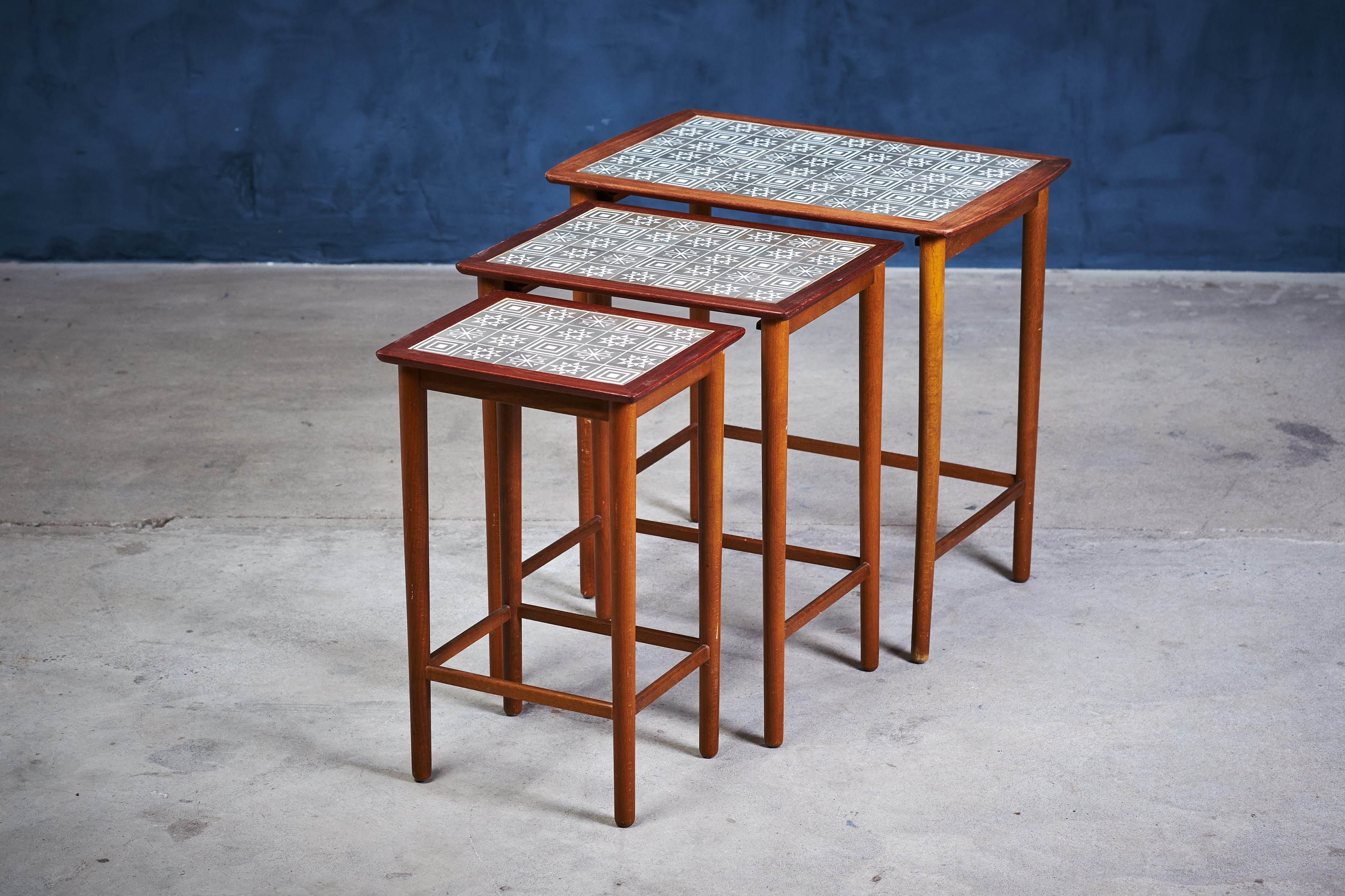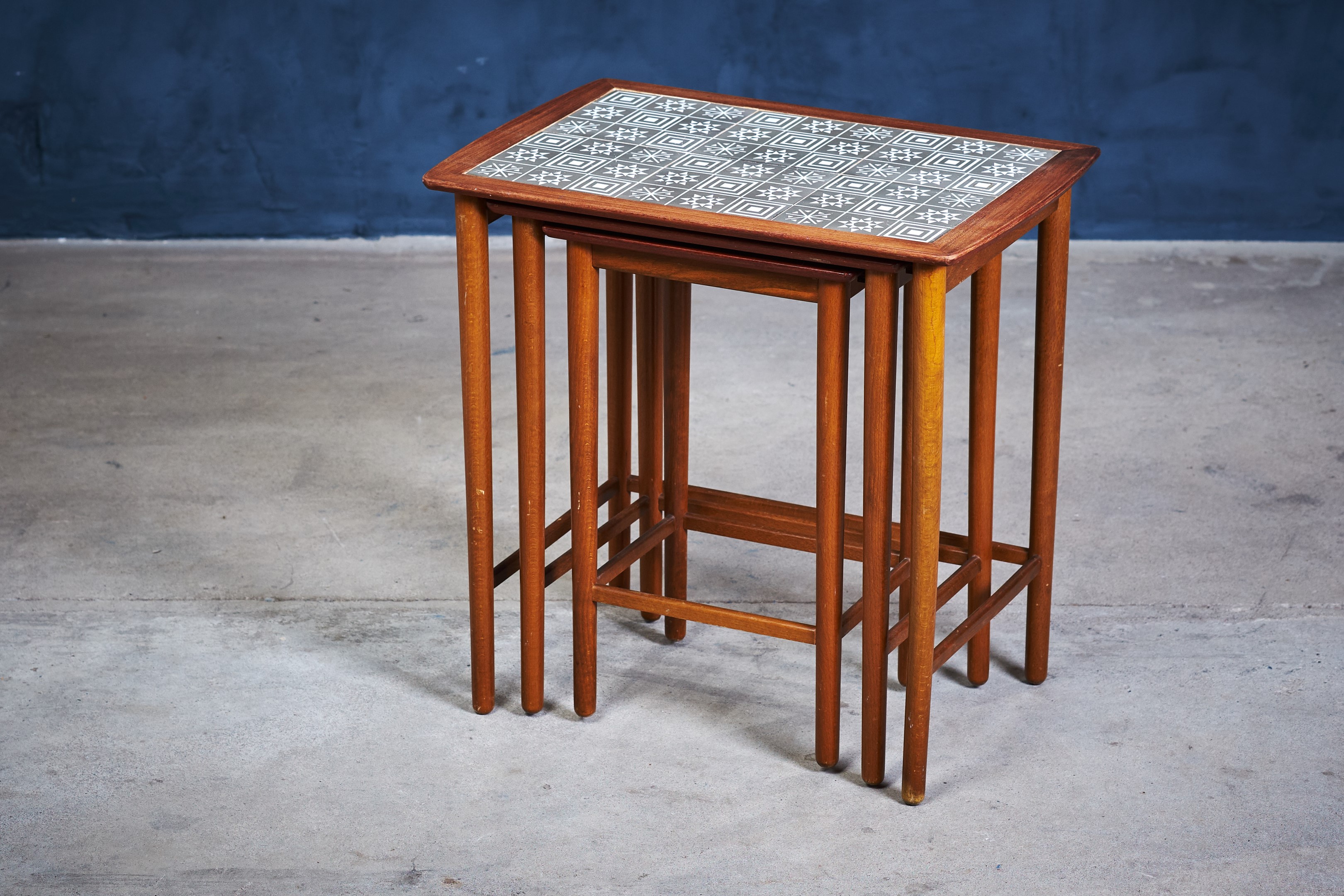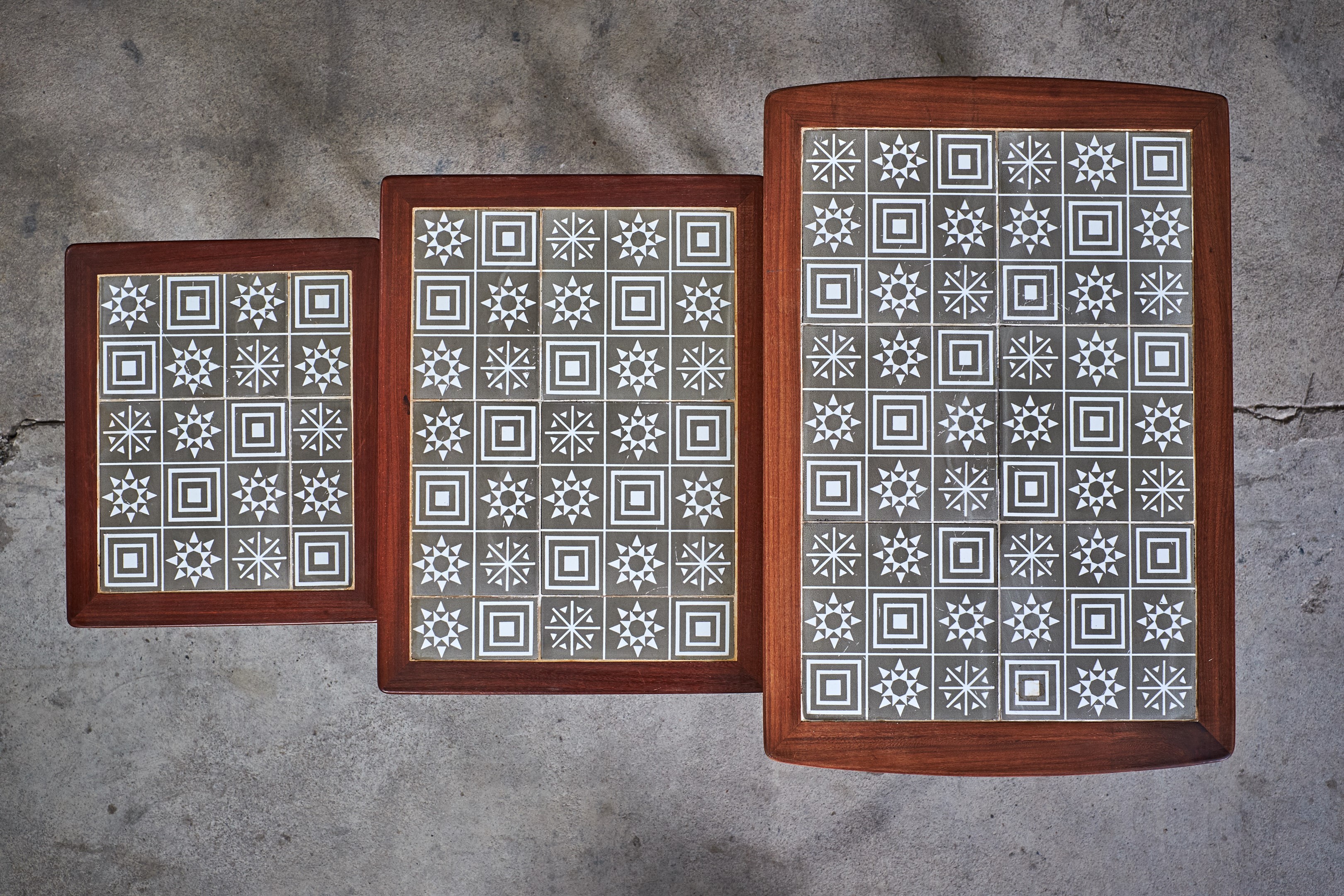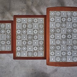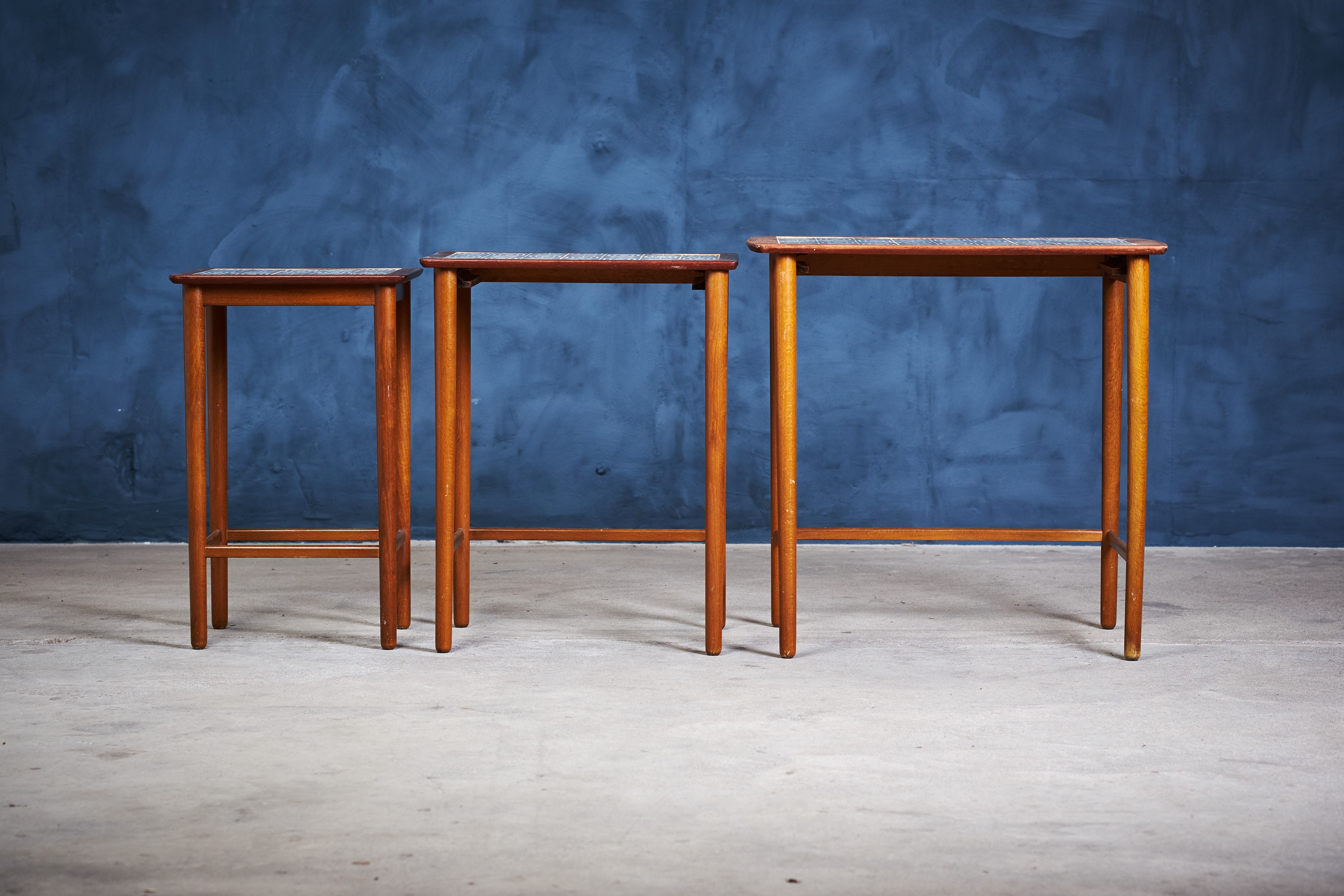 Danish nesting tables in teak and beech with beautiful tiles. These tables has many functions and can be used for many things. These nesting tables will be a great addition to any modern environment. Made in Denmark by a Danish carpenter in the 1960s.