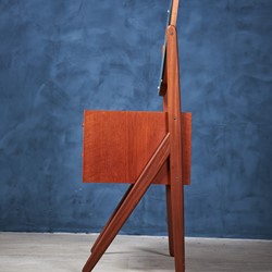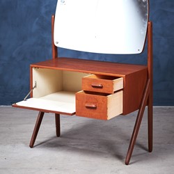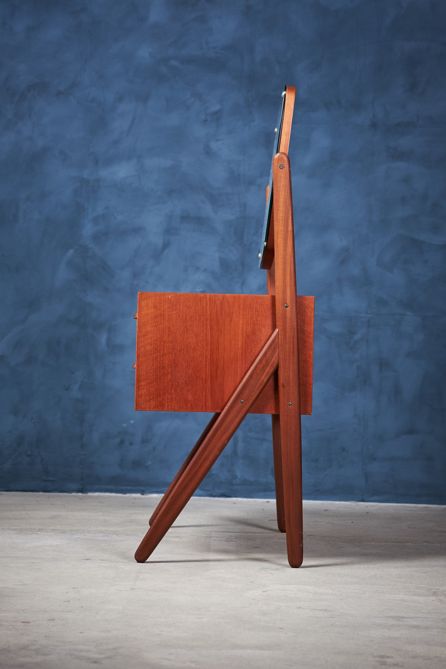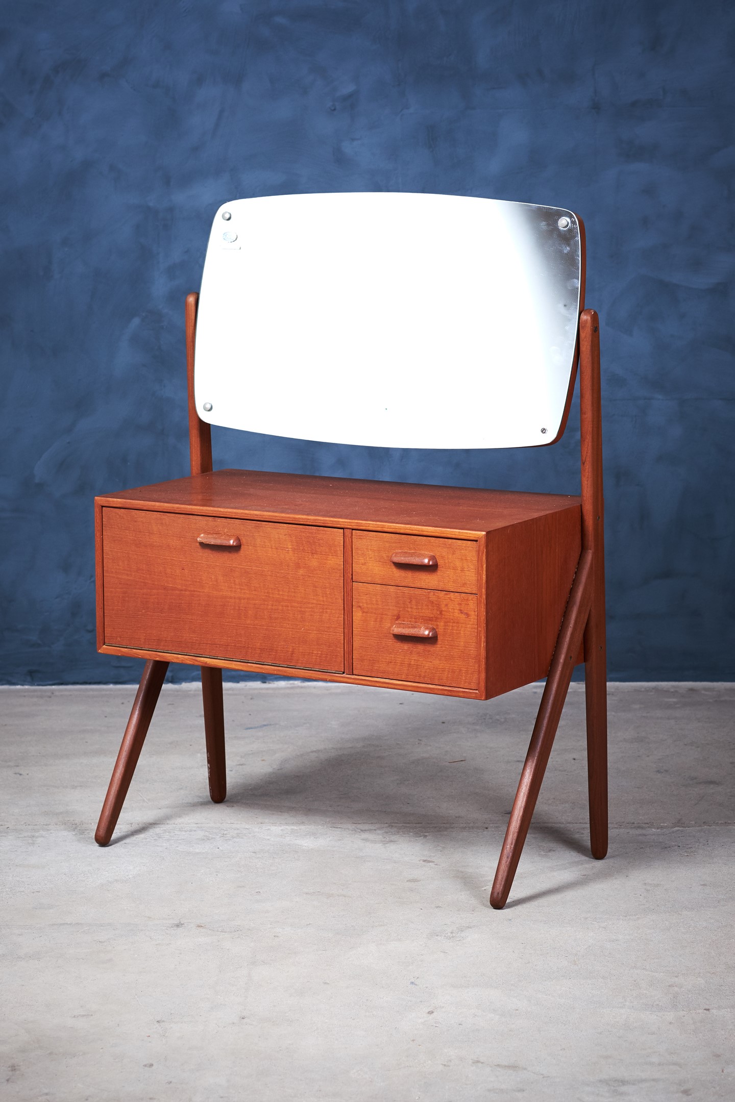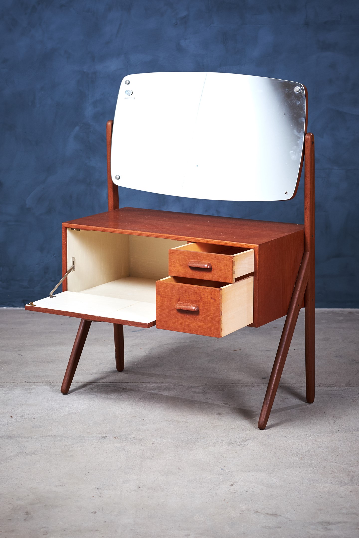 Elegant and very versatile vanity table with mirror made of solid teak and teak veneer and drawers of solid ply. Designed by Sigfred Omann and manufactured by Ølholm Møbelfabrik in the early 1960's. Overall high quality and excellent condition with just a few very minor patina consistent with age and use. Very clean inside. Would be a grat addition to any modern home.