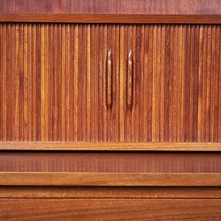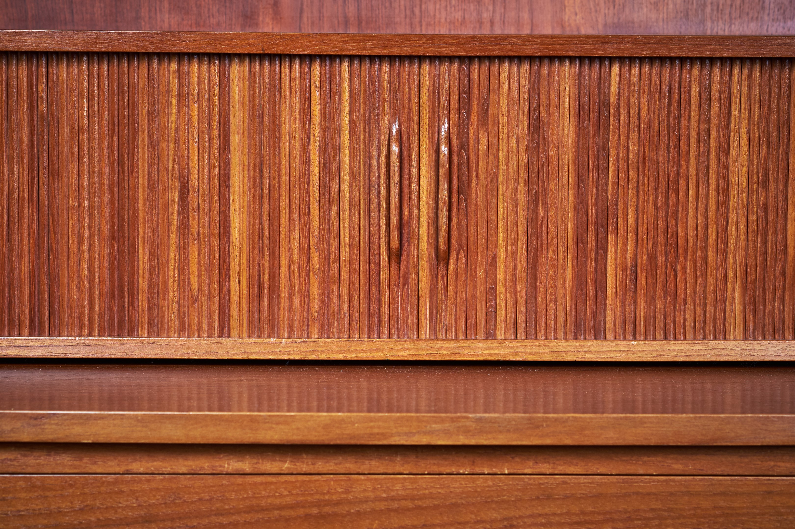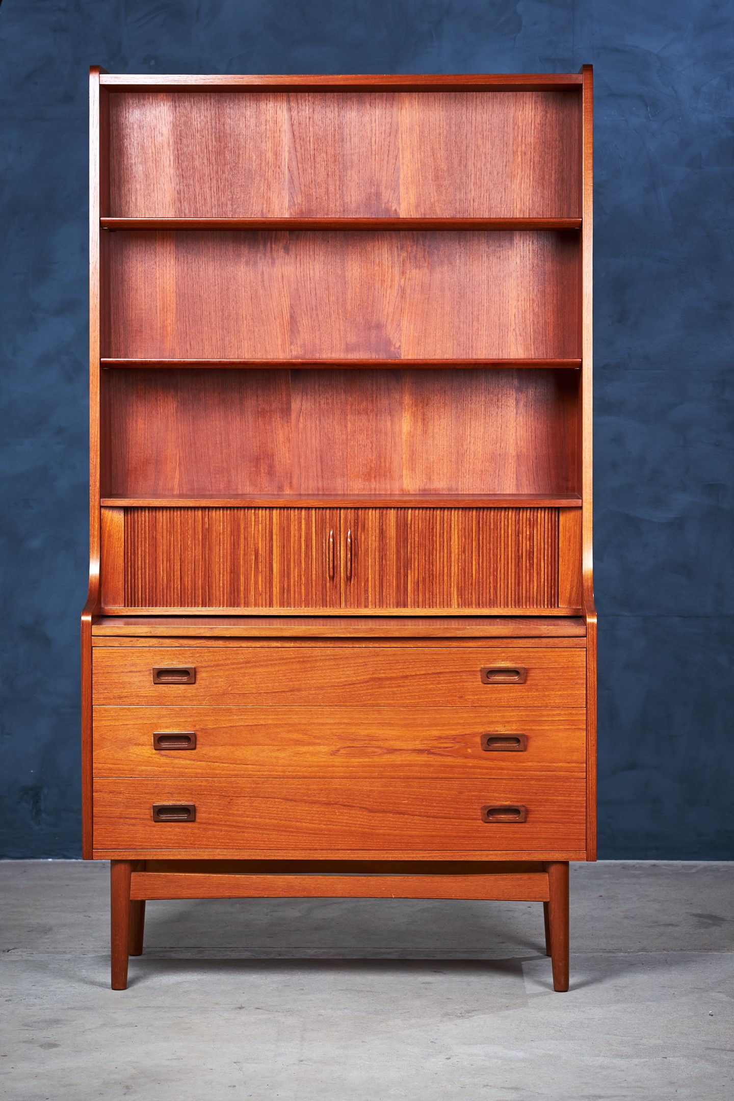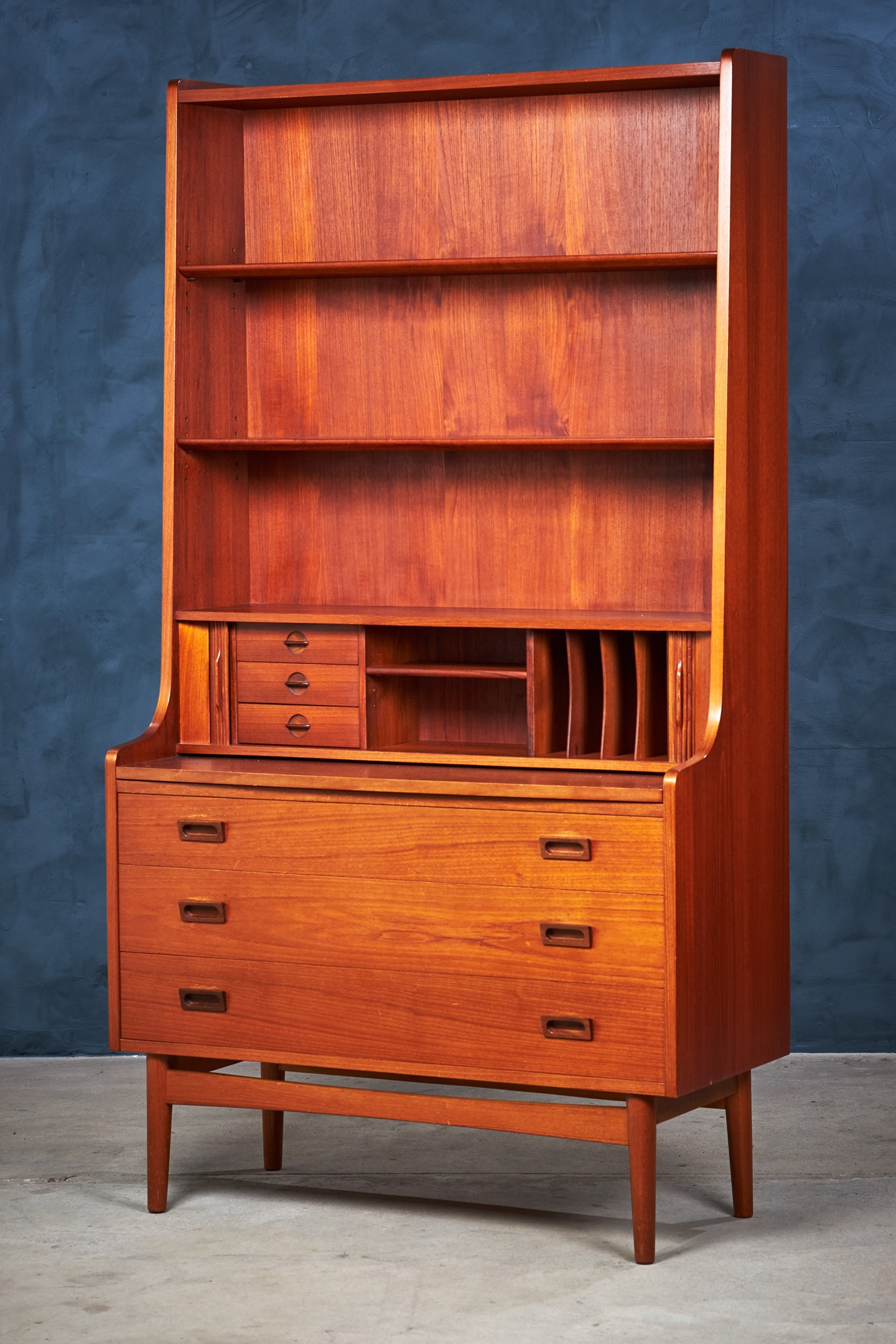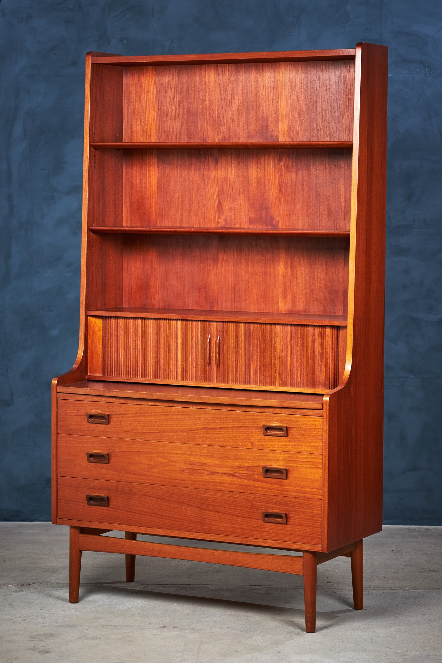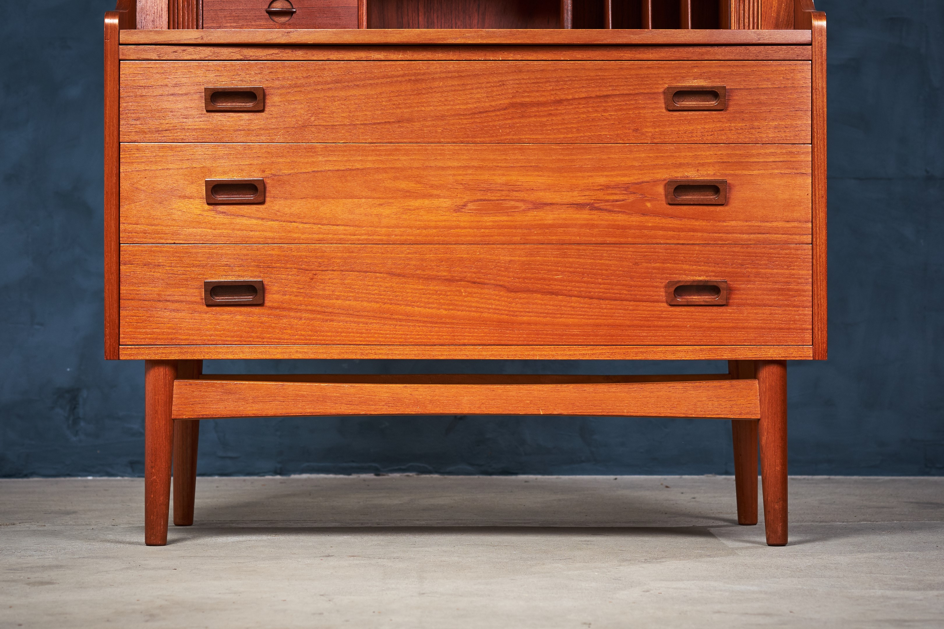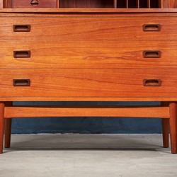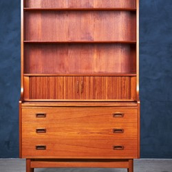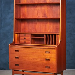 This beautiful midcentury bookcase in teak was designed by Johannes Sorth for Bornholm Møbelfabrik, Nexø. The tall, upper hutch features three adjustable shelves. The lower cabinet features three large drawers for plenty of storage. A pullout secretary desk converts this versatile piece into a quick and easy workstation for any occasion. Raised on a solid, hand formed base. In excellent original vintage condition.