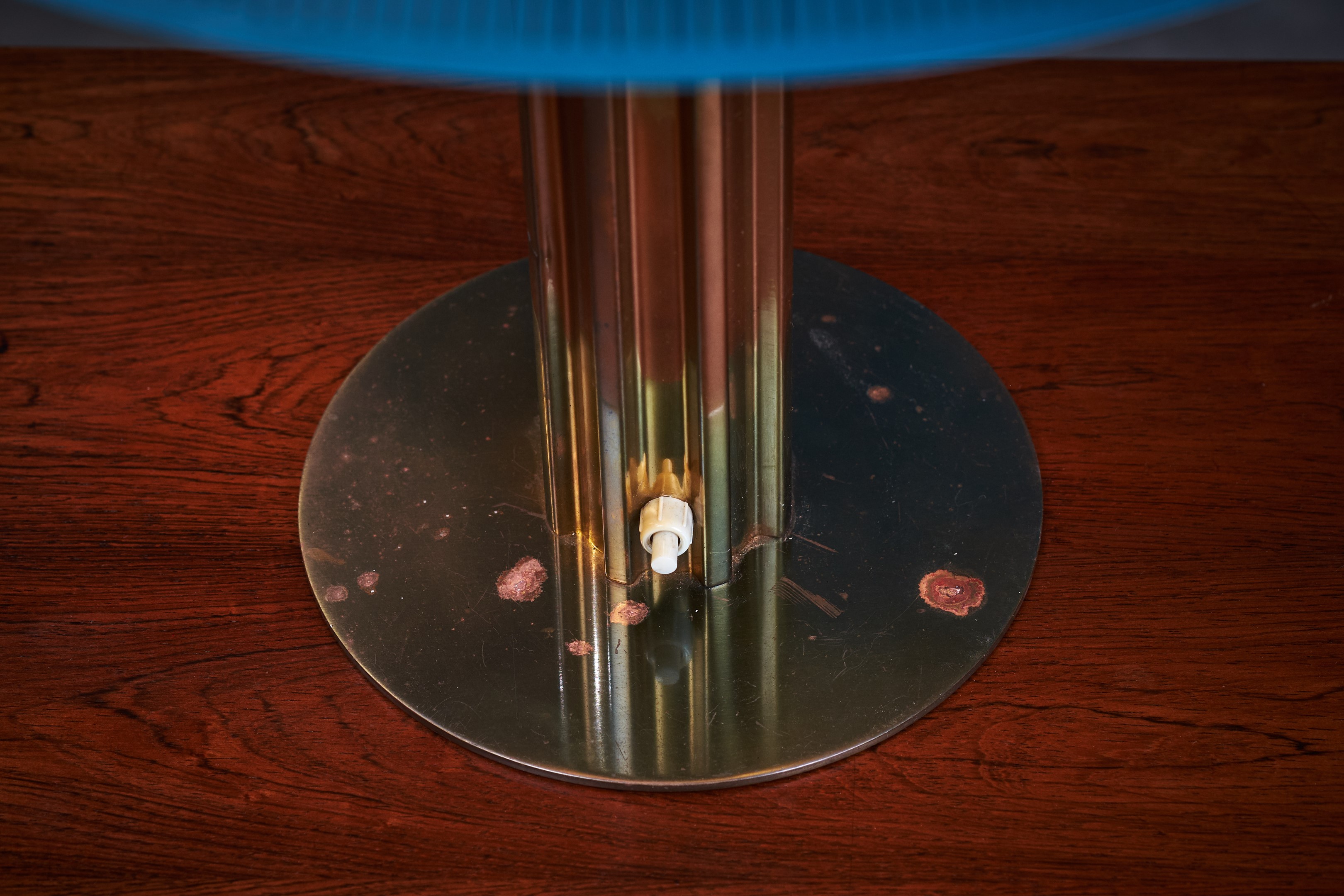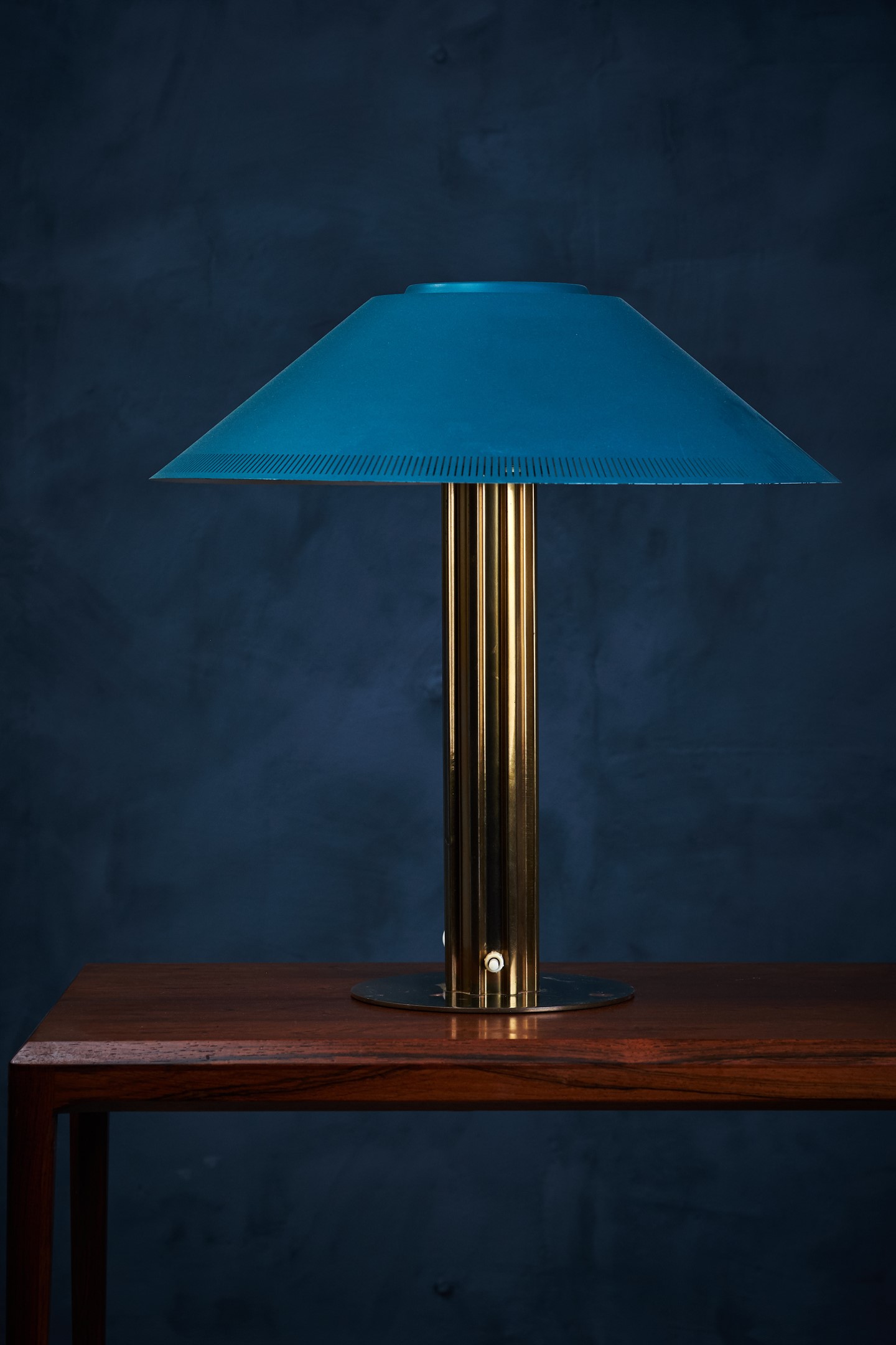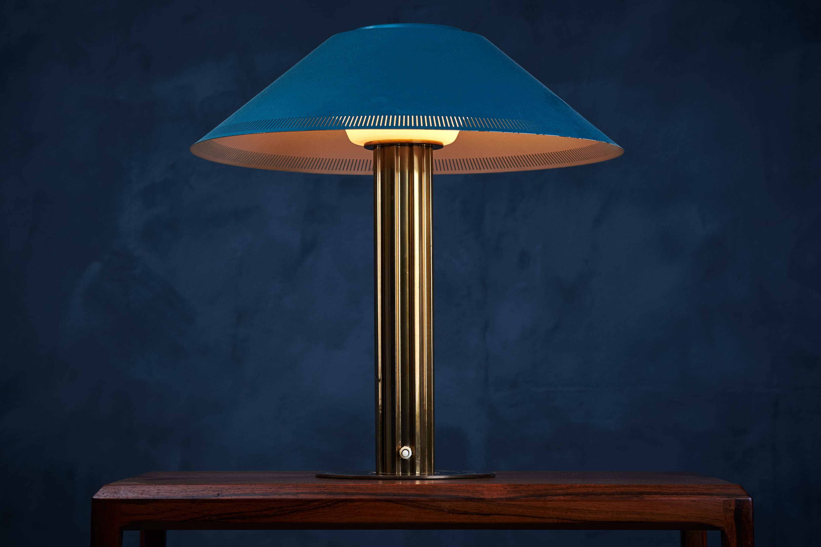 Beautiful and speciel table lamp in brass, glass and a beautiful green shade. The lamp provides great light and would suit almost any desk, this beauty will be a great addition to any modern environment.