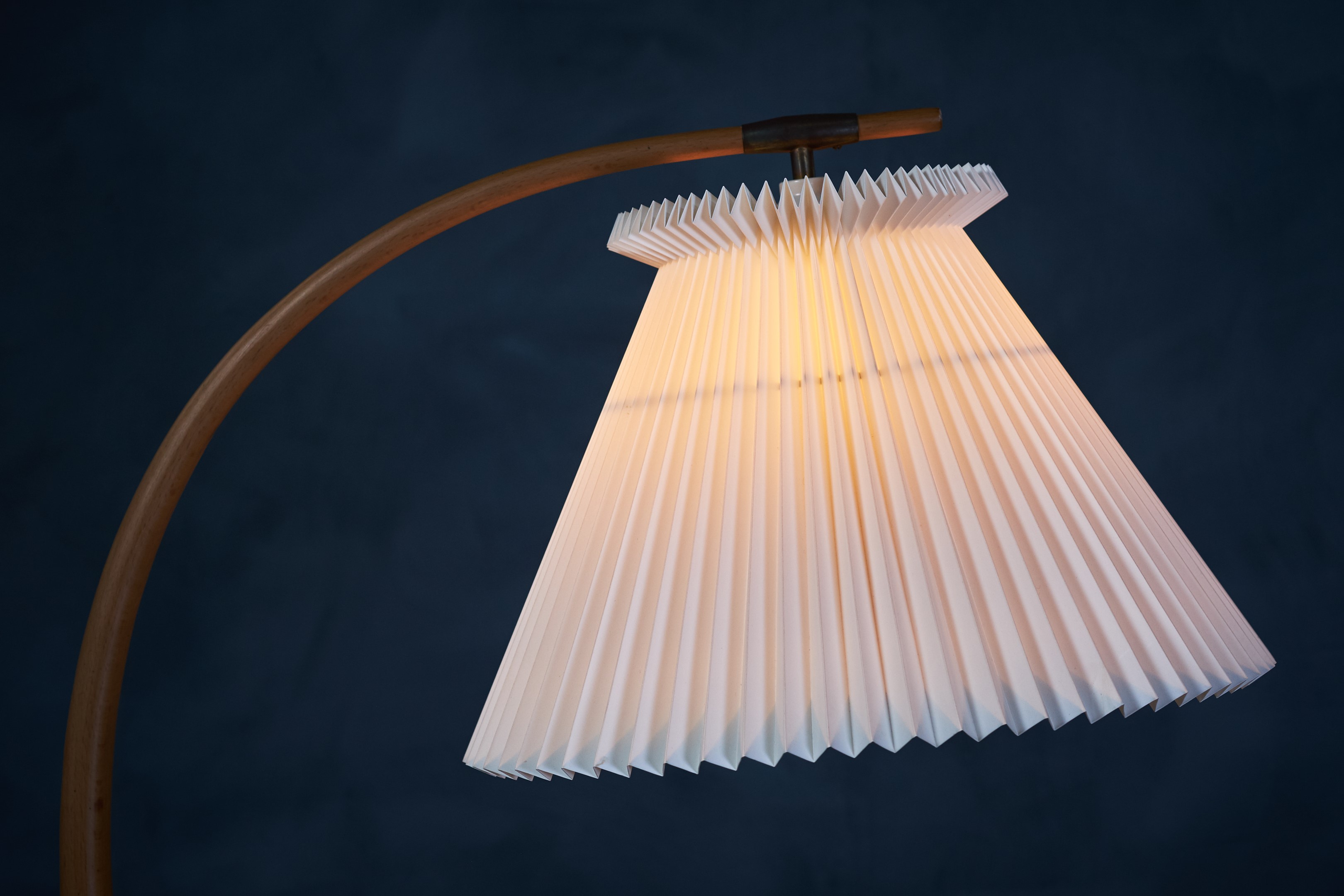 This lamp is made of beech with brass elements. The wire is beautifully hidden along the backside of the stem which is a very beautiful detail. The switch is found in between the tripod legs. The lamp comes with a Le Klint shade which is in great condition. The lamp is also in great condition.