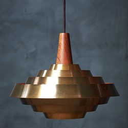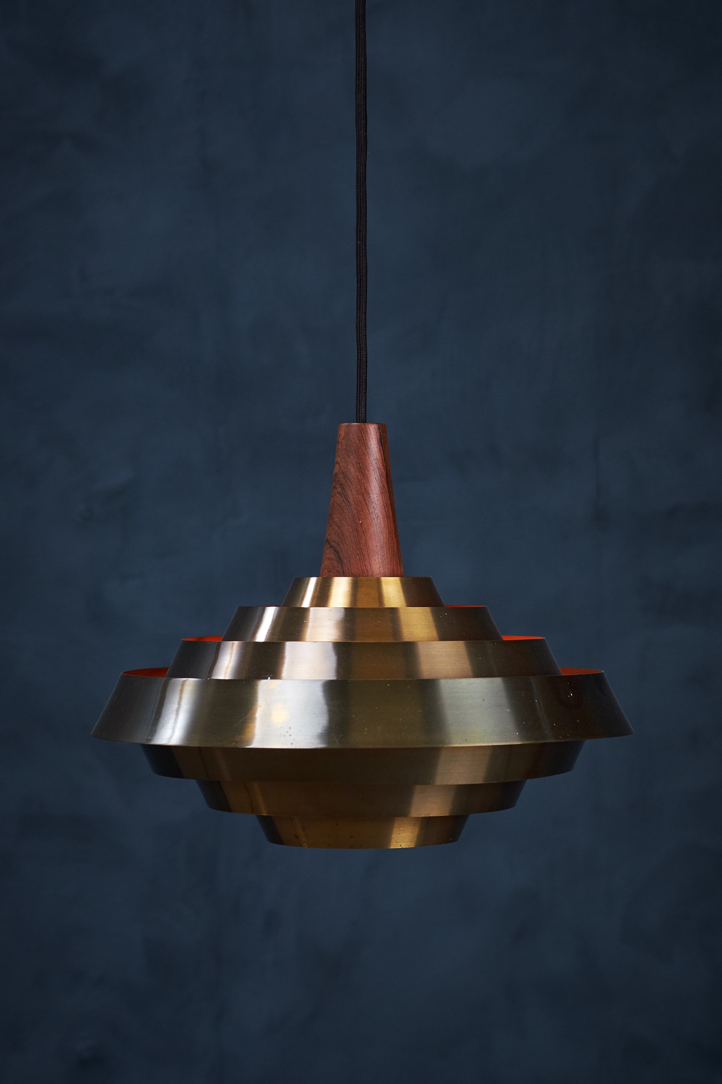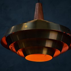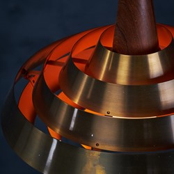 Stunning Danish pendant lamp in brass with solid teak top. The lamp is lacquered orange inside which perfectly works with the light and provides a warm and cozy light. This lamp is made in the 1960s Danish design era and that is easy to see. The lamp is in good vintage condition with no dents or big scratches. The lamp will come with a brand new white or black, fabric or plastic cord as you wish.