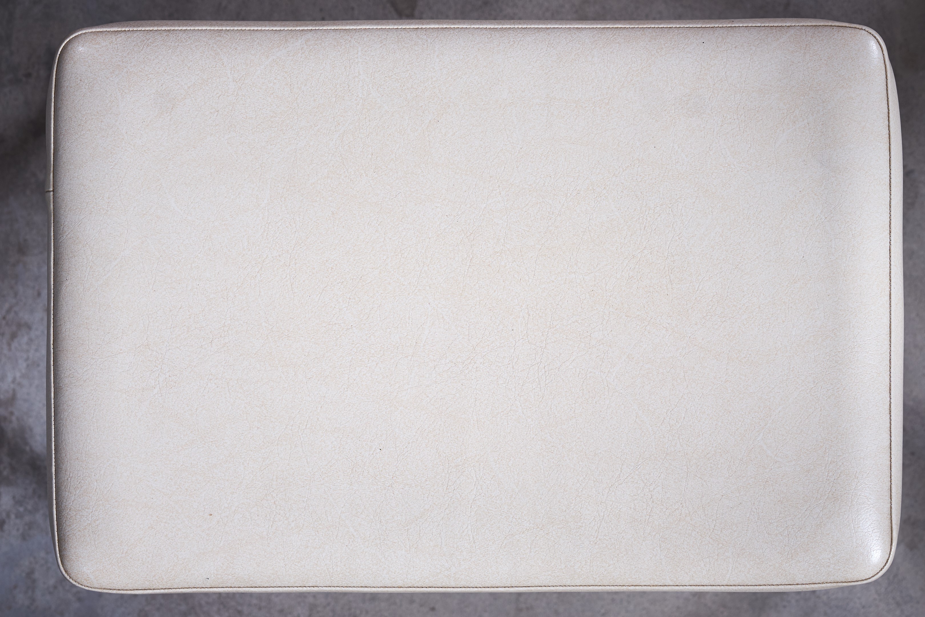 Set of 2 stools with inclined legs in solid teak and cover in artificial leather. Made in Denmark around the 60s and have been in the same home since. The stools are in good vintage condition and would be a great addition to any modern environment.