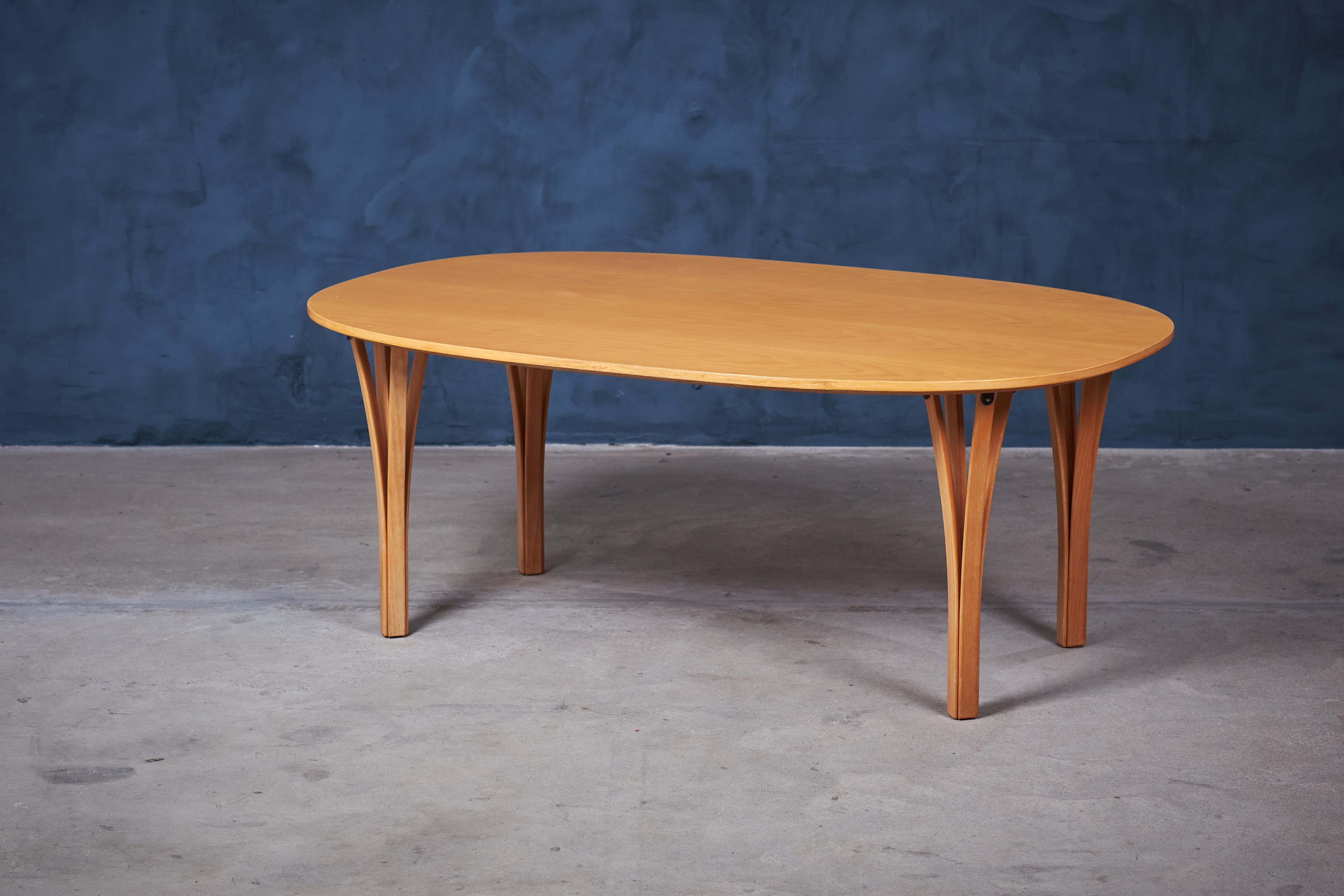 Super Ellipse table designed by Piet Hein and Bruno Mathsson for Fritz Hansen. The table is made of laminated beech wood with solid beech legs. The legs tighten and slide out of their location points in each corner, which means that the table can be easily removed if it is required for carrying or storing. Good quality and a beautiful coffee table there would be a great addition to any modern environment. In very good condition.