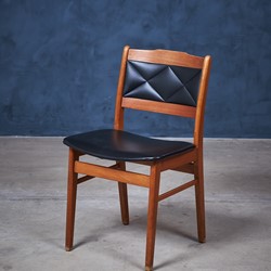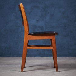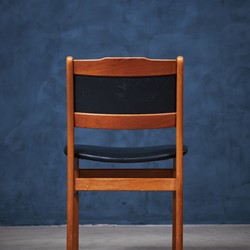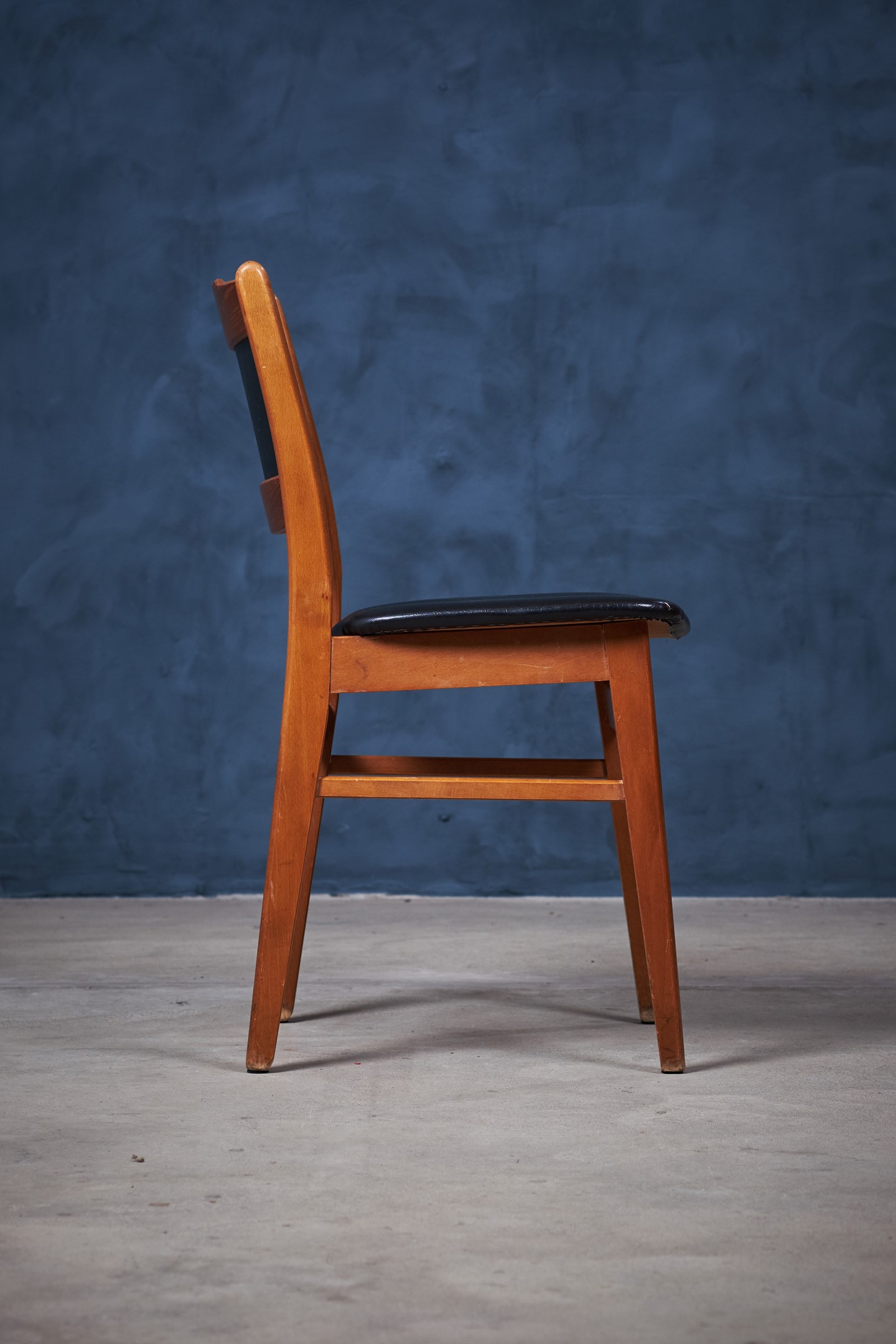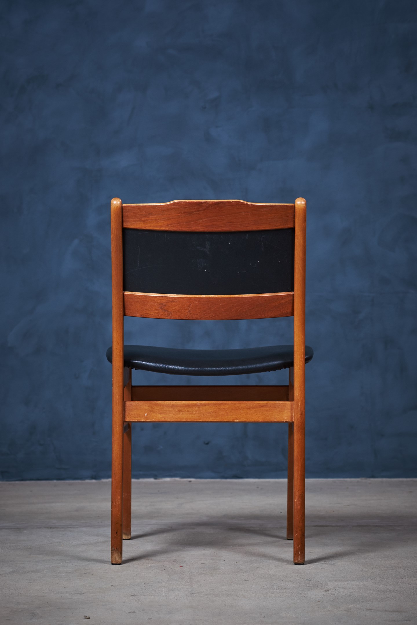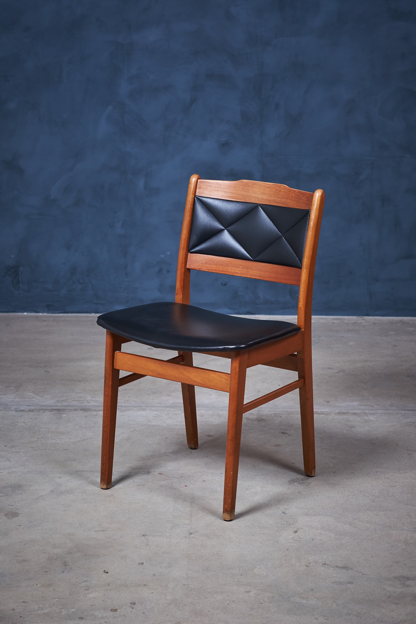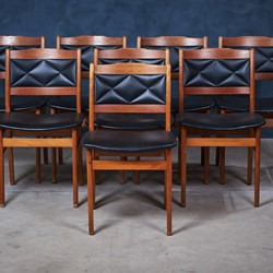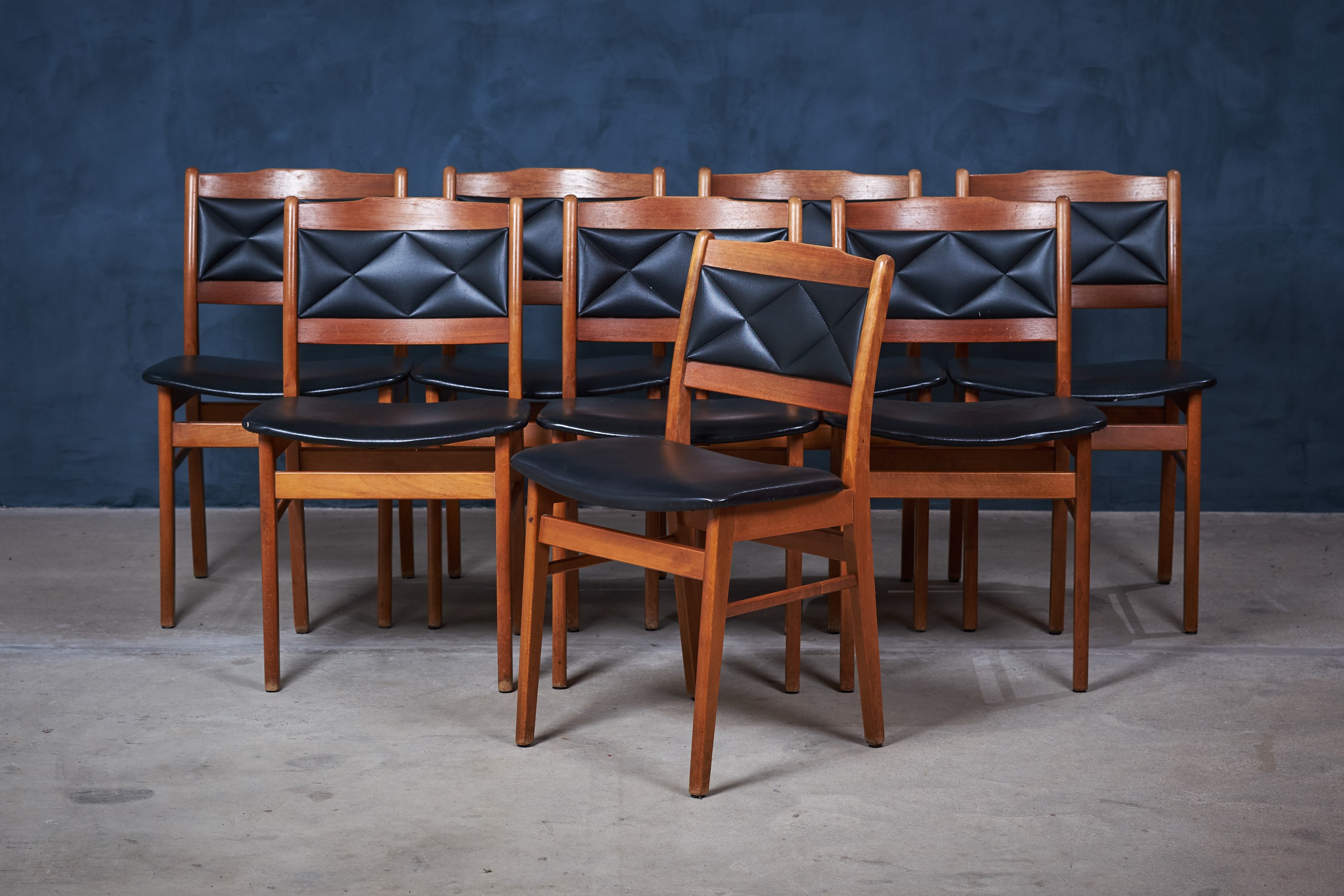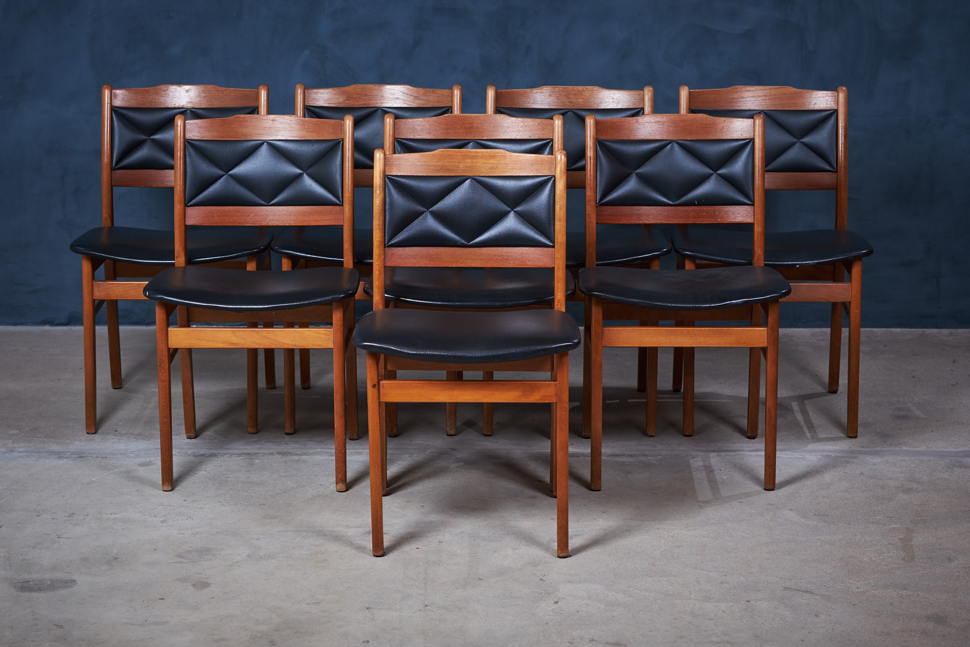 Set of eight mid-century dining chairs in teak. Danish design from the 1950s. The chairs has an elegant look with seat and back in artificial leather. Great seating comfort. The chairs are in good vintage condition with small traces of age and use. This set would be a great addition to any modern dining room area.