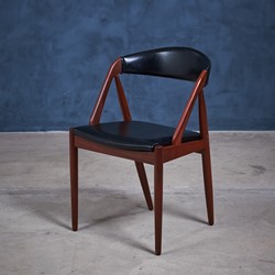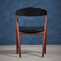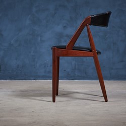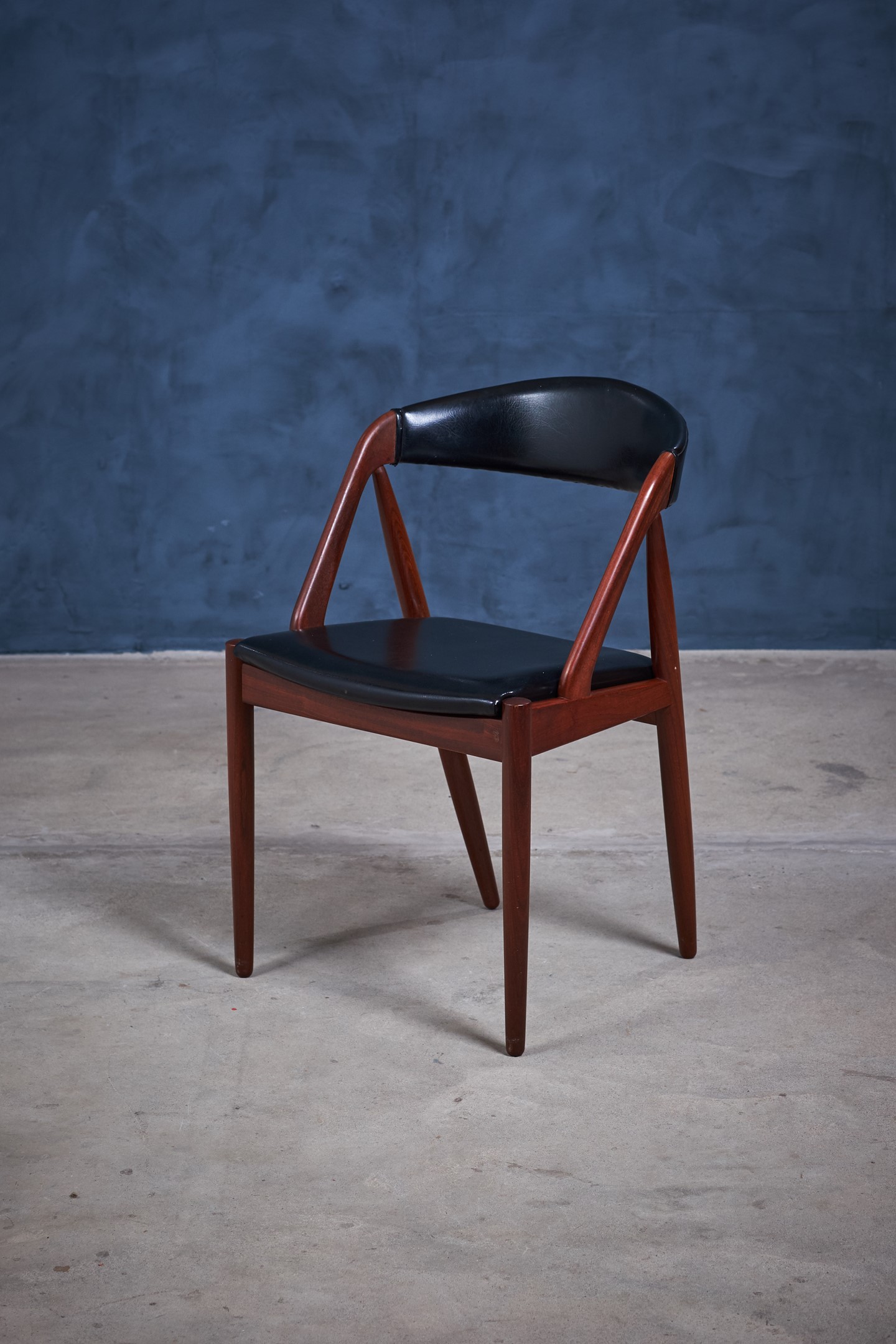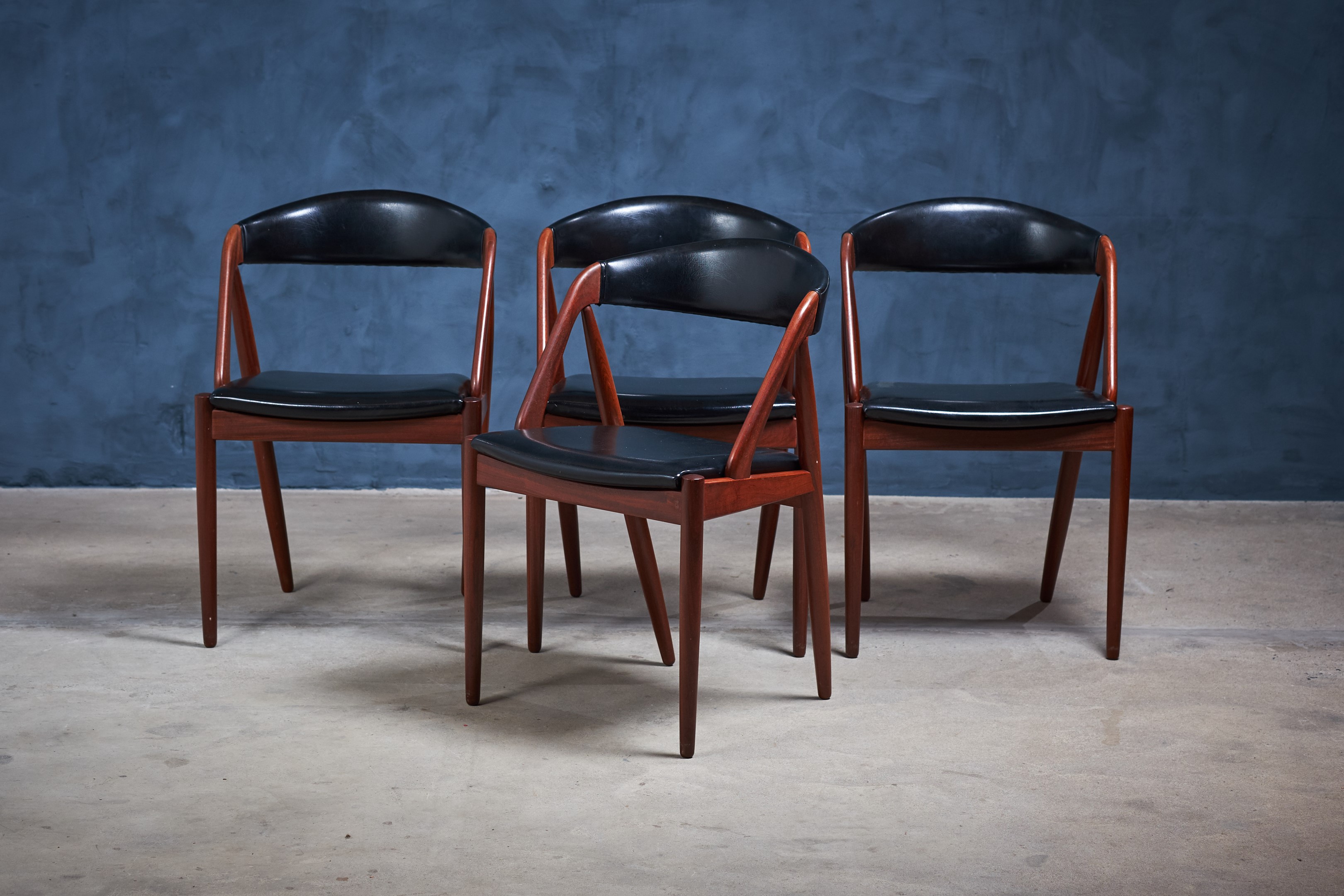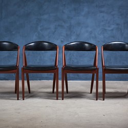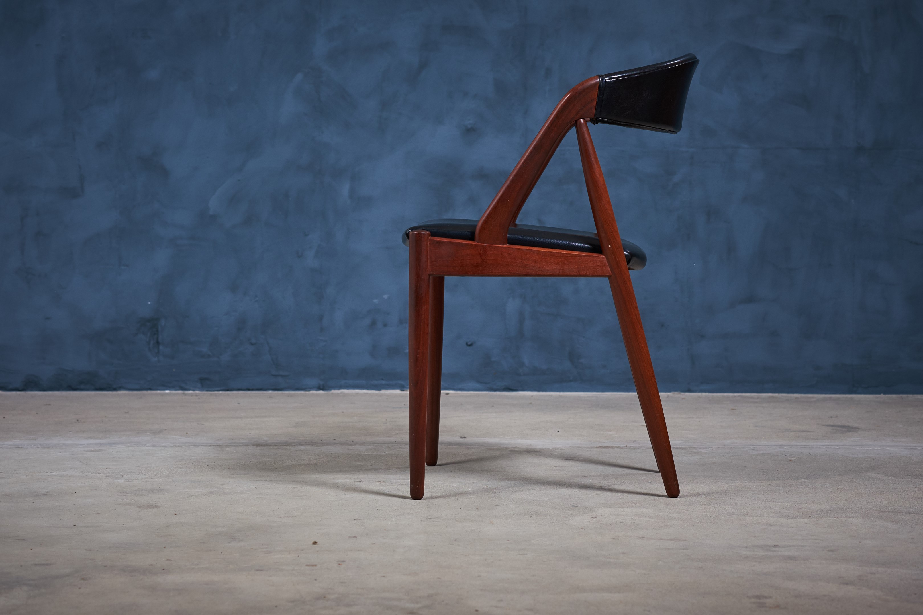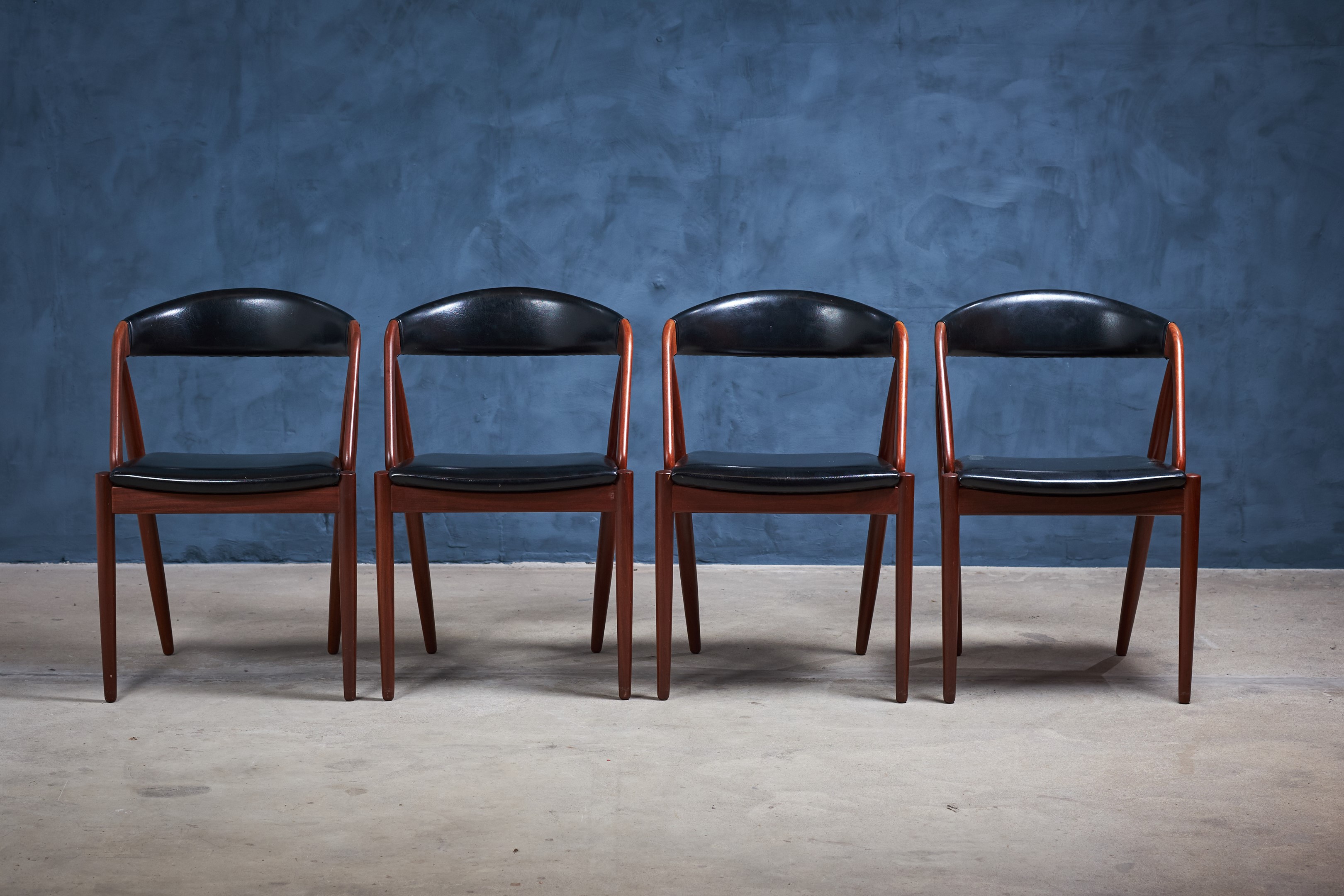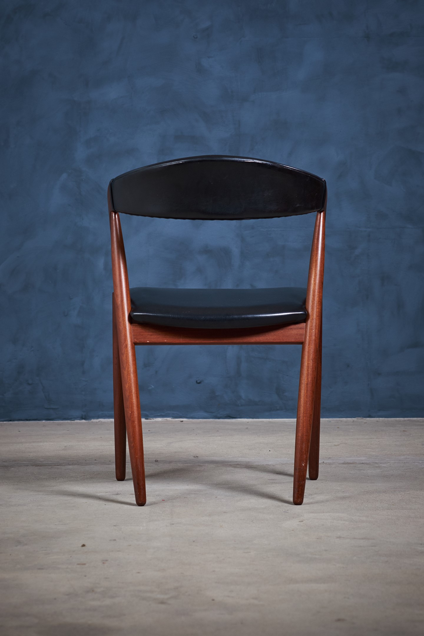 A beautiful set of four teak dining chairs by Kai Kristiansen. The comfortable and timeless Danish Classic, 'model 31'. Produced in Denmark, circa 1960. These four chairs is upholstered with artificial leather on seat and back which are in good vintage condition with no holes or deep scratches. These chairs would be a great addition to any dining room environment.