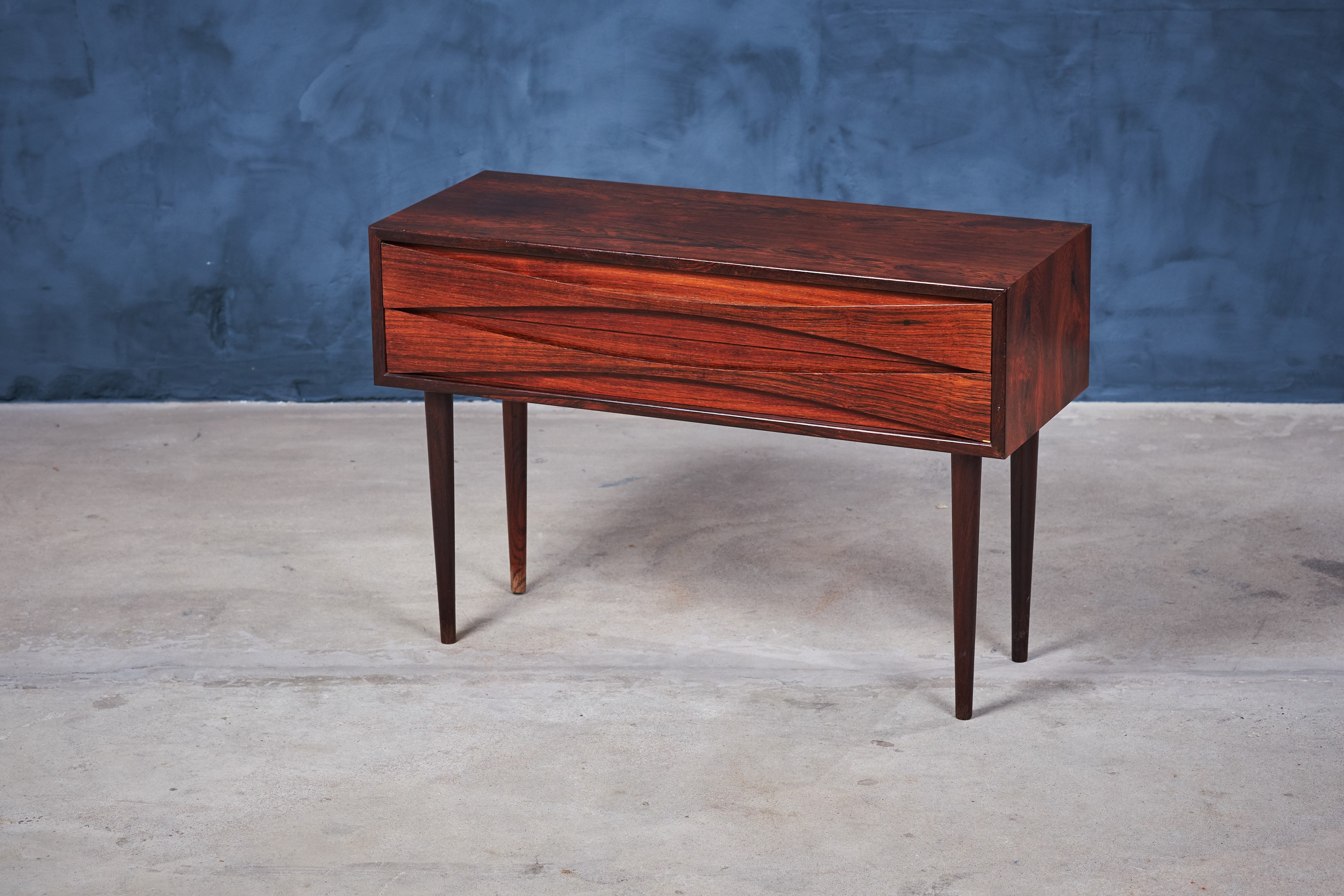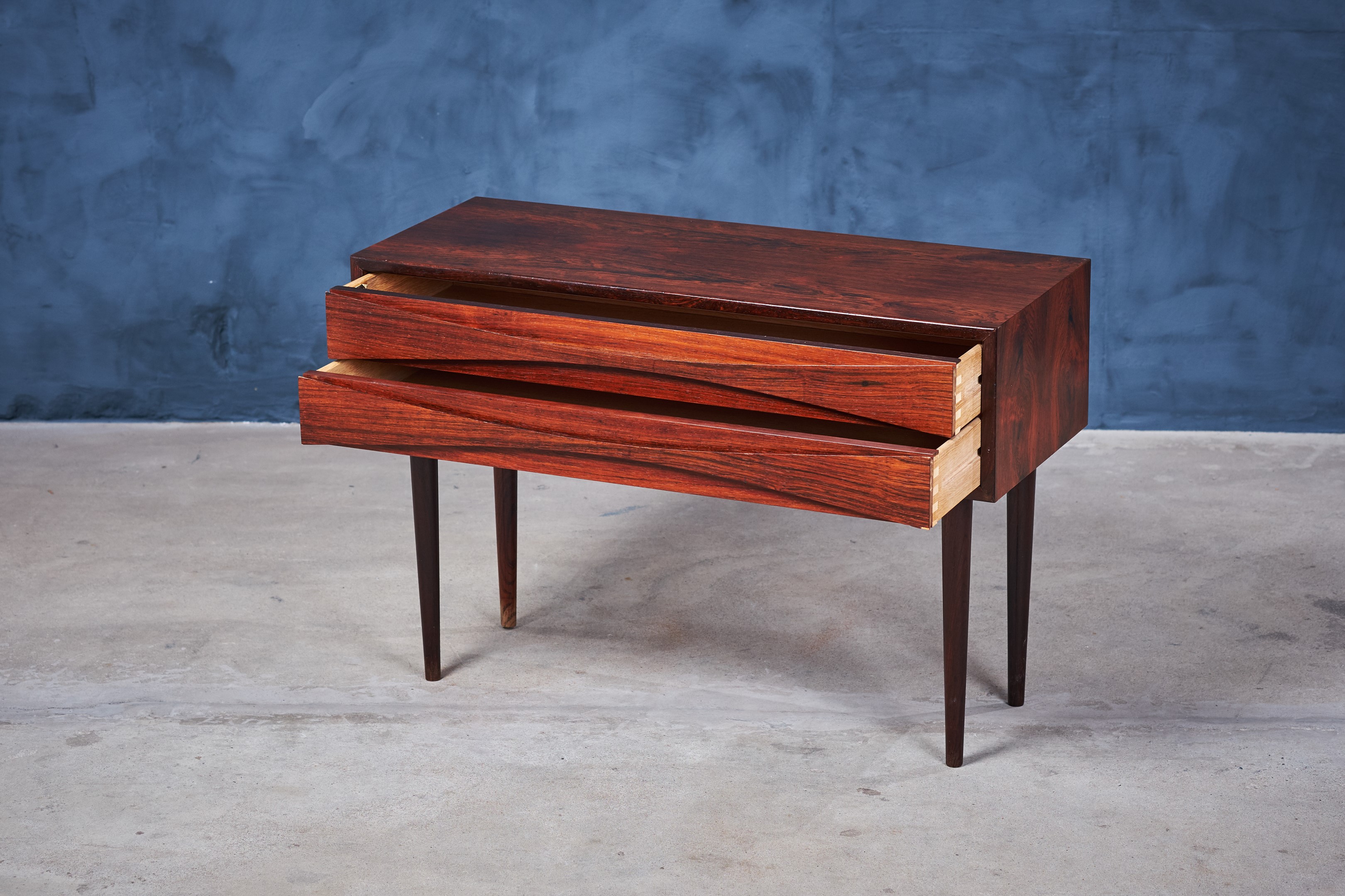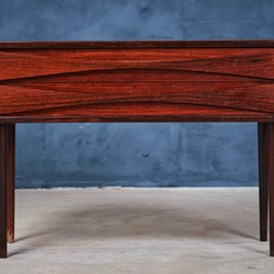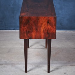 An elegant long, two-drawer cabinet from Arne Vodder in rosewood veneer. The cabinet is in really good condition. It comes with his signature handles and solid tapered legs. It is produced for NC Møbler in Odense, Denmark.