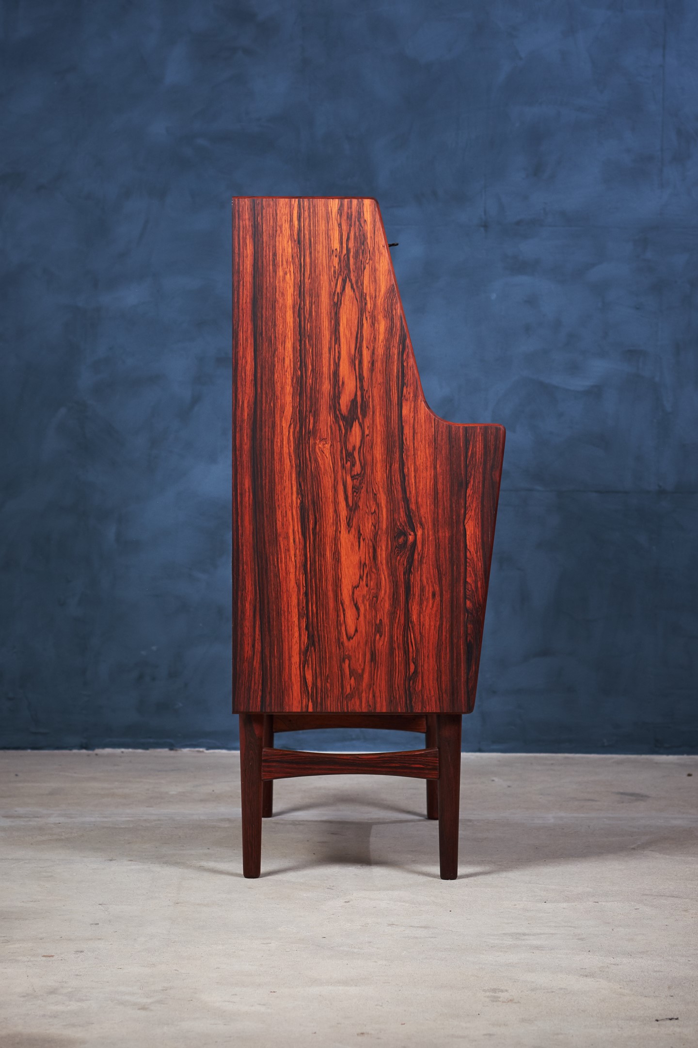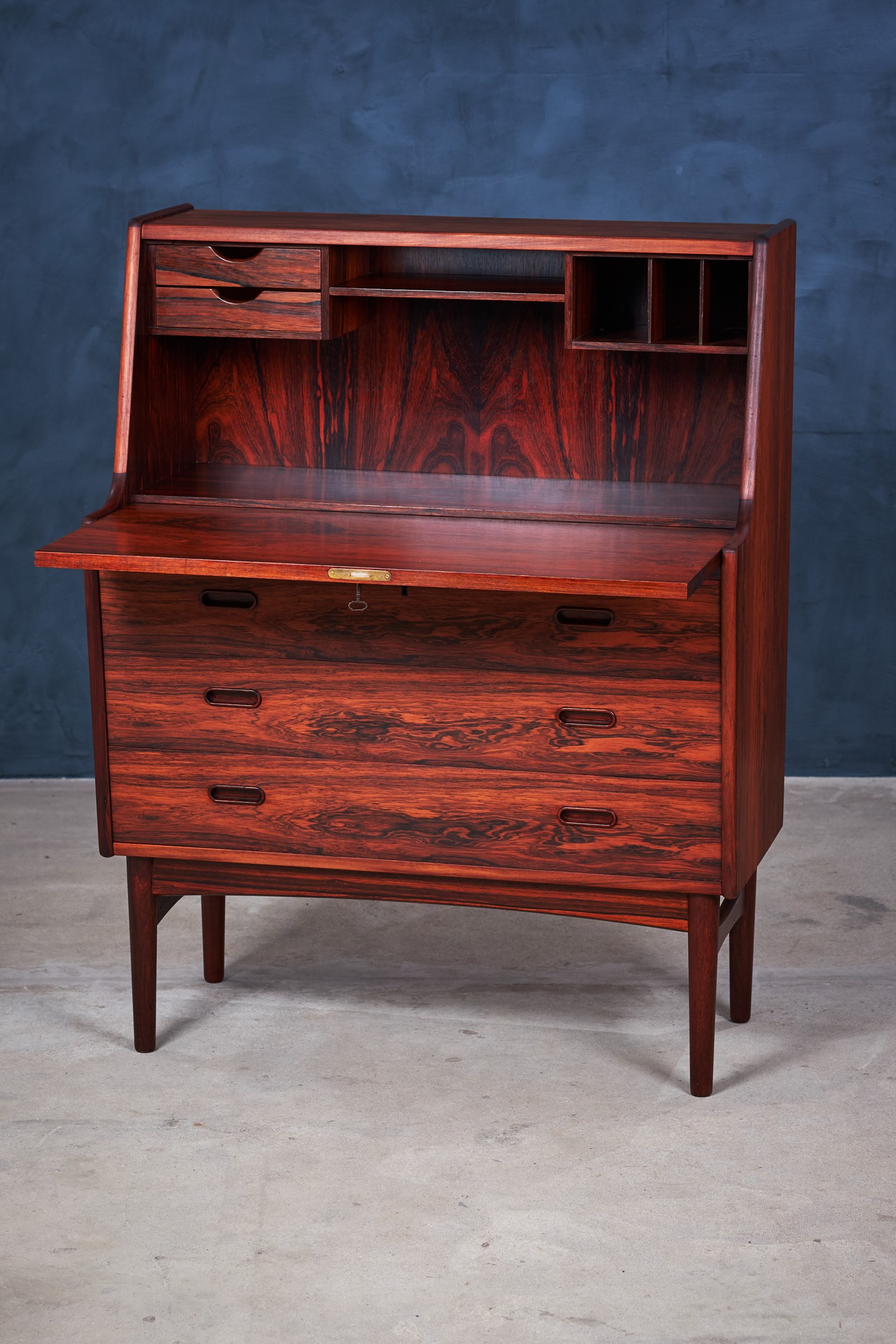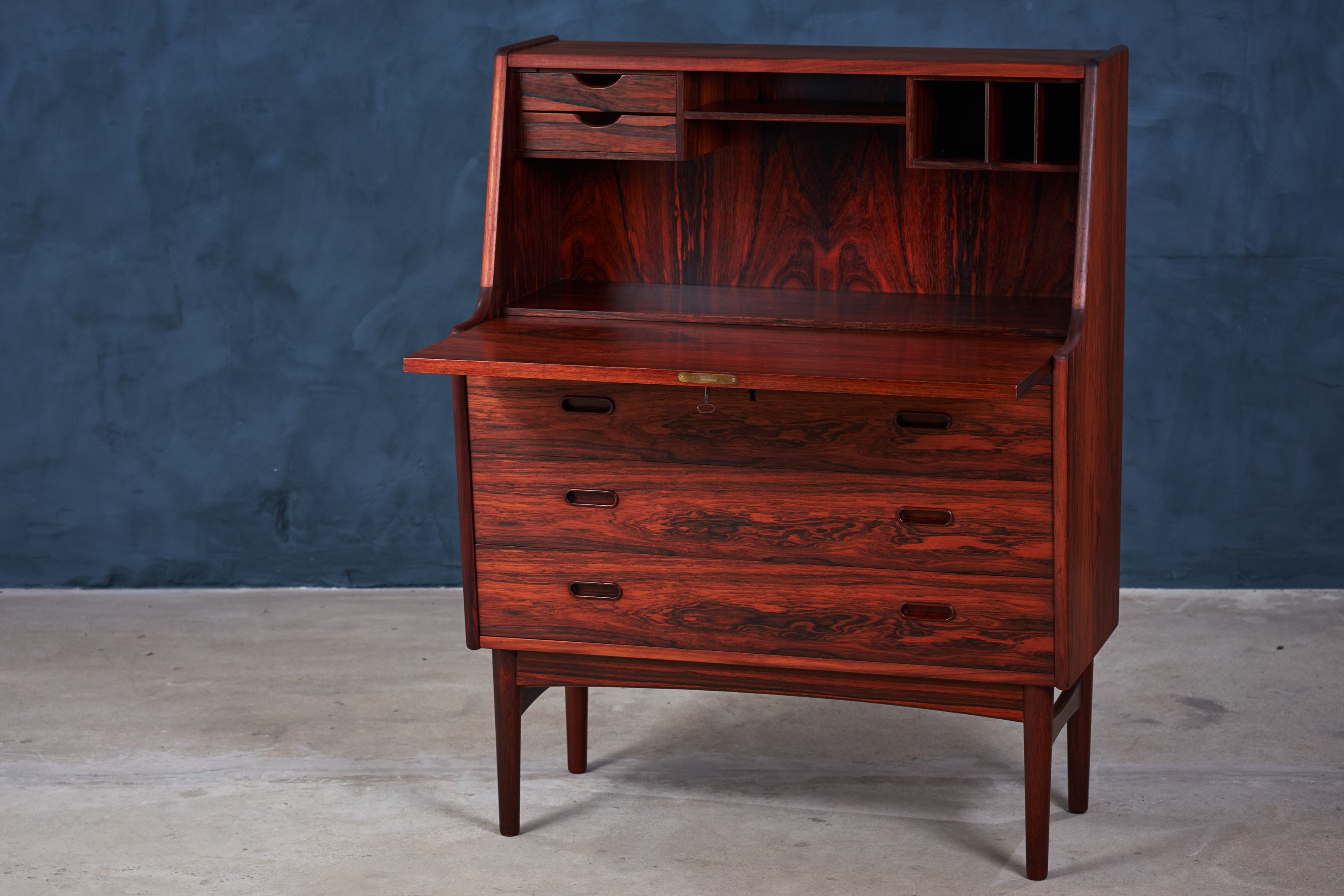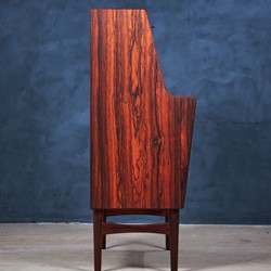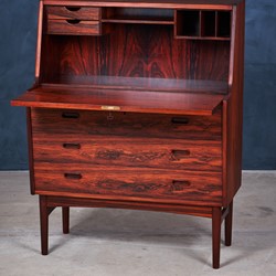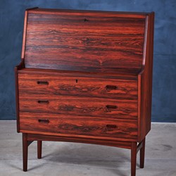 This stunning secretary in rosewood was designed by the Danish designer Arne Wahl Iversen in the 1960s. A key opens the desk top, which flips down and can be used as a writing place and to reveal two mini drawers, letter organizers. This secretary has been totally renovated by our skilled carpenter, the grains in the rosewood looks absolutely amazing.