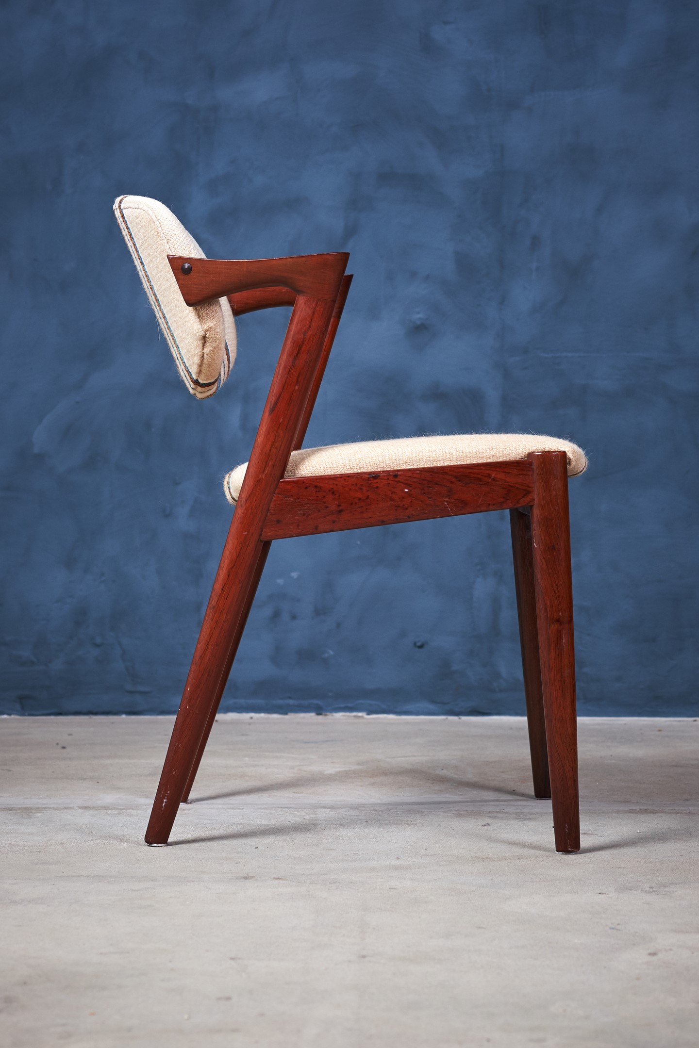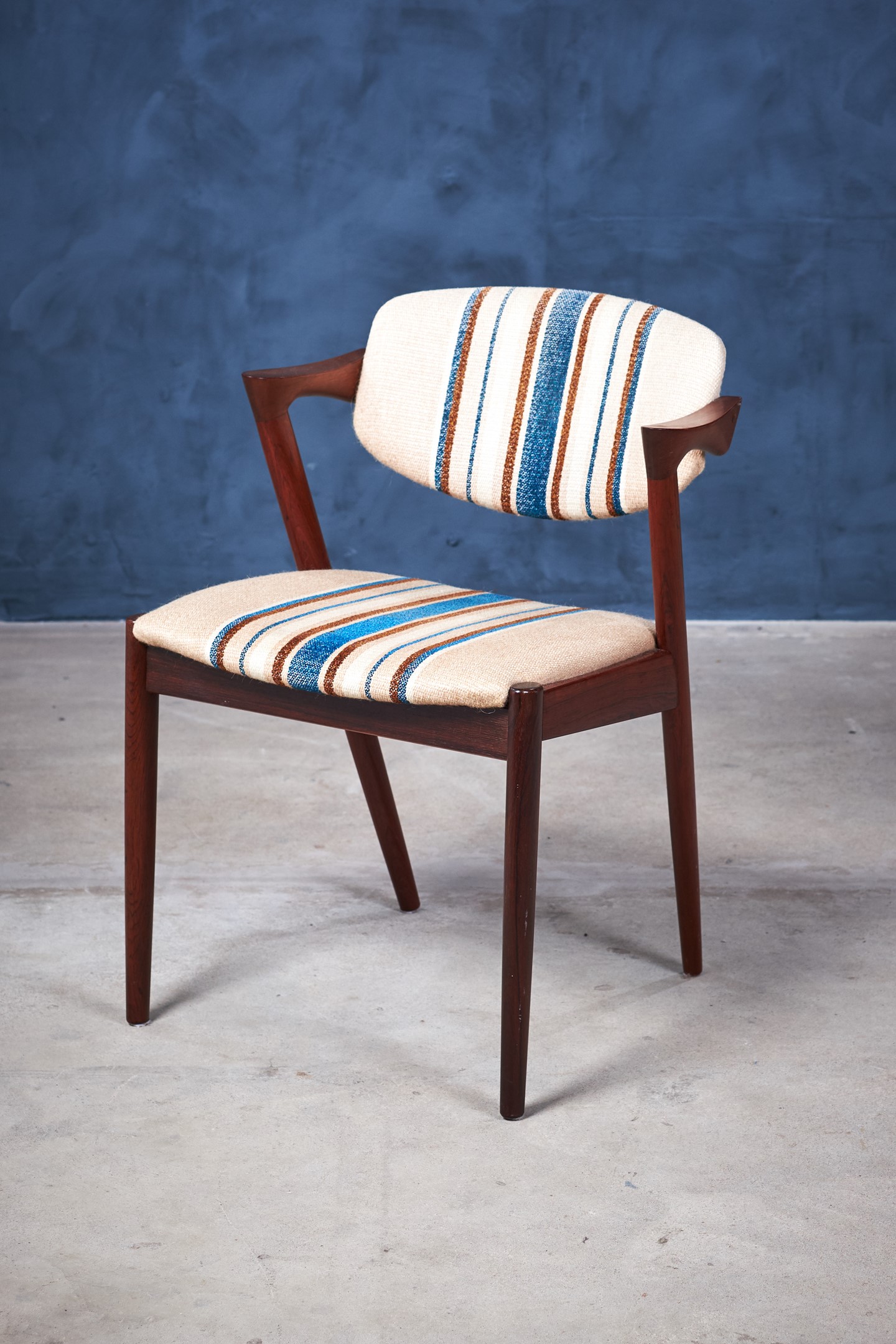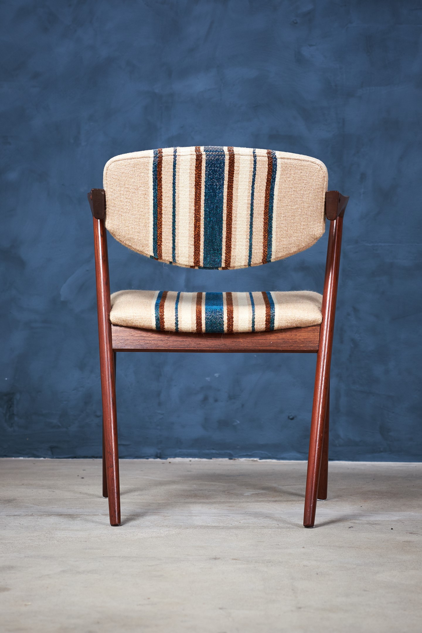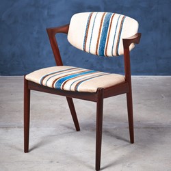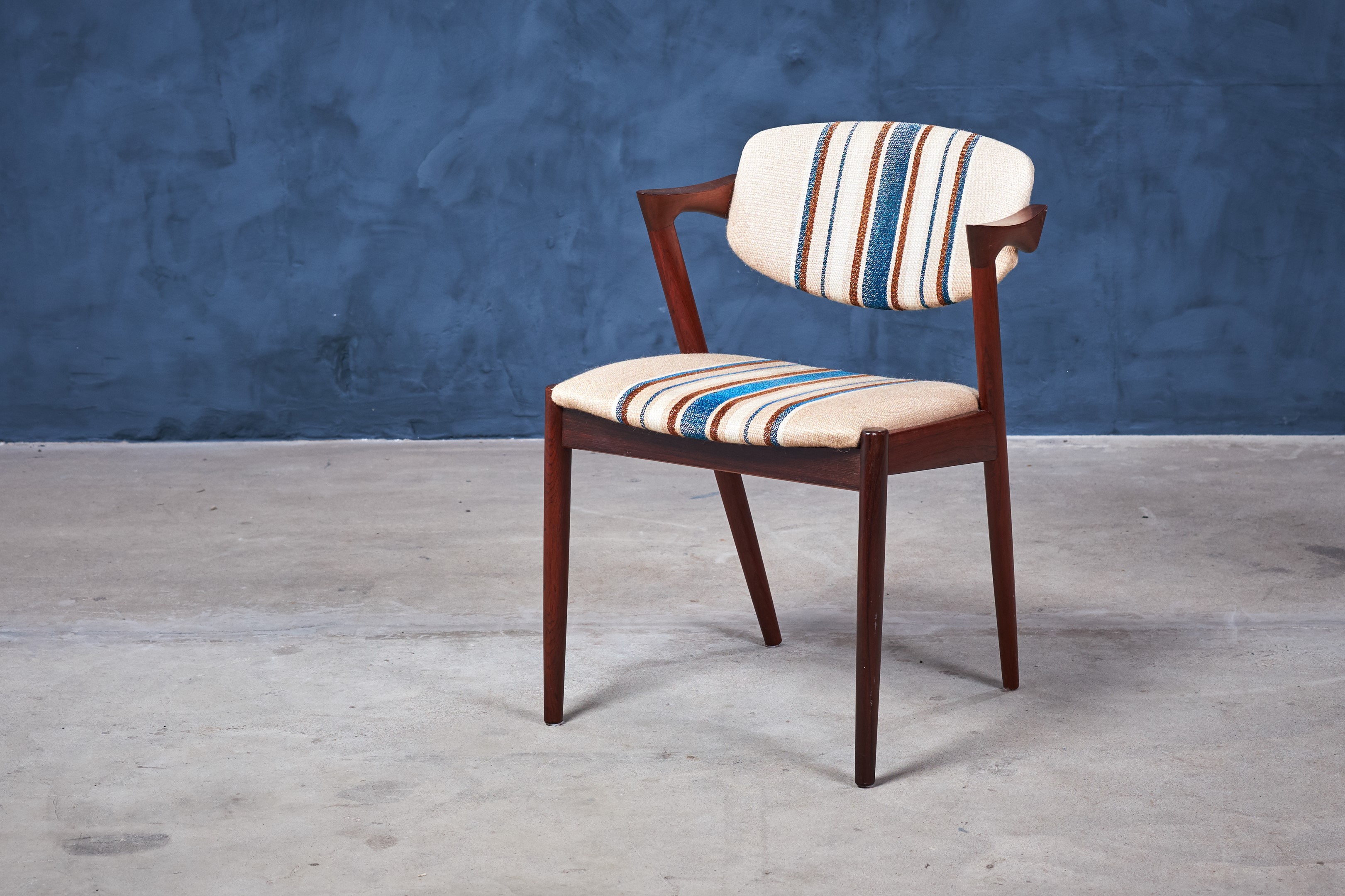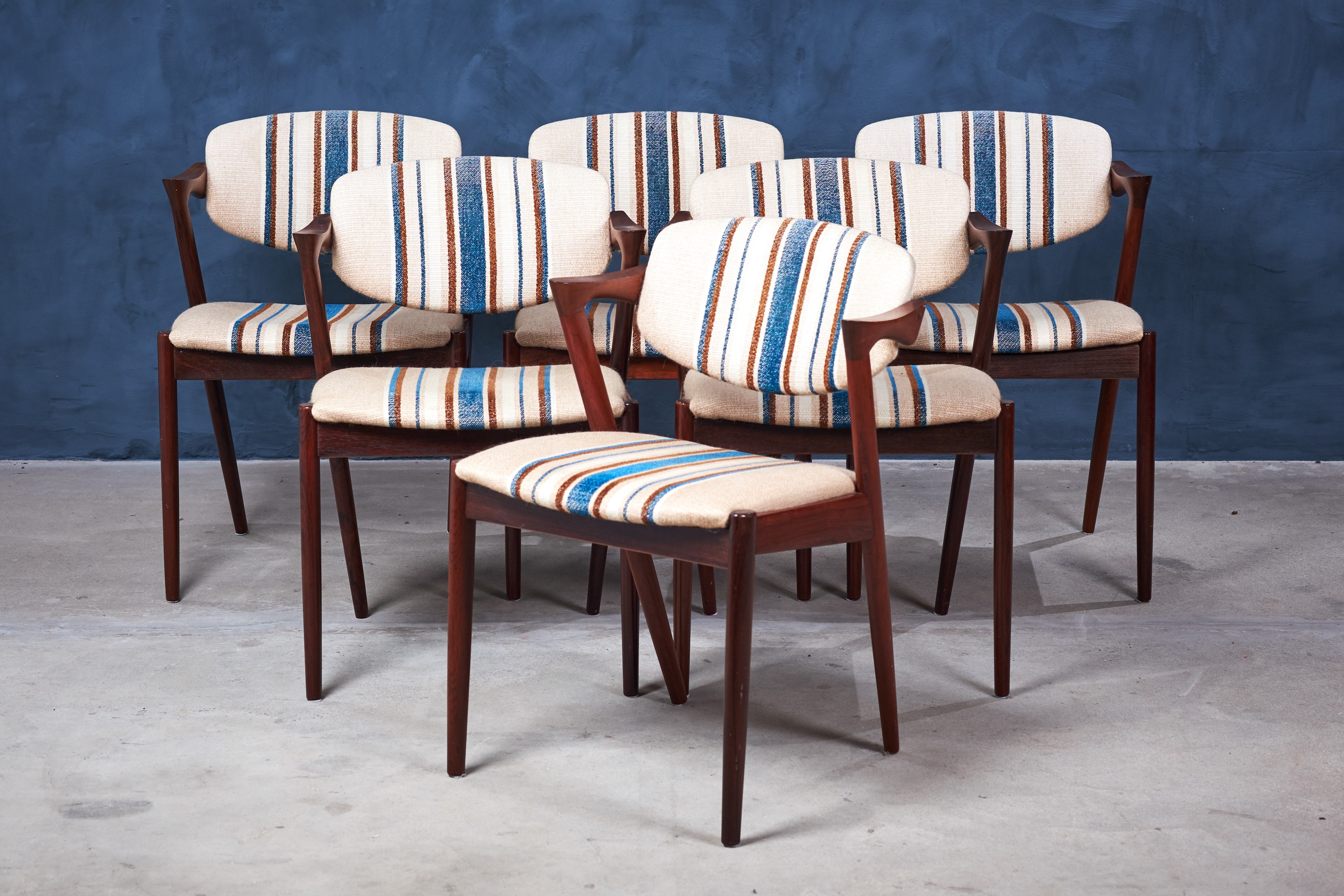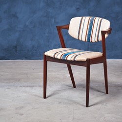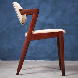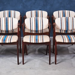 This is a stunning set of six rosewood dining chairs by the Danish designer Kai Kristiansen. When walking into a room, this chair cannot help but grab ones attention with its striking design. The model has an elegant and light design and all the best qualities of good Danish craftsmanship and on top of that, a really good seating comfort.
