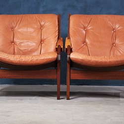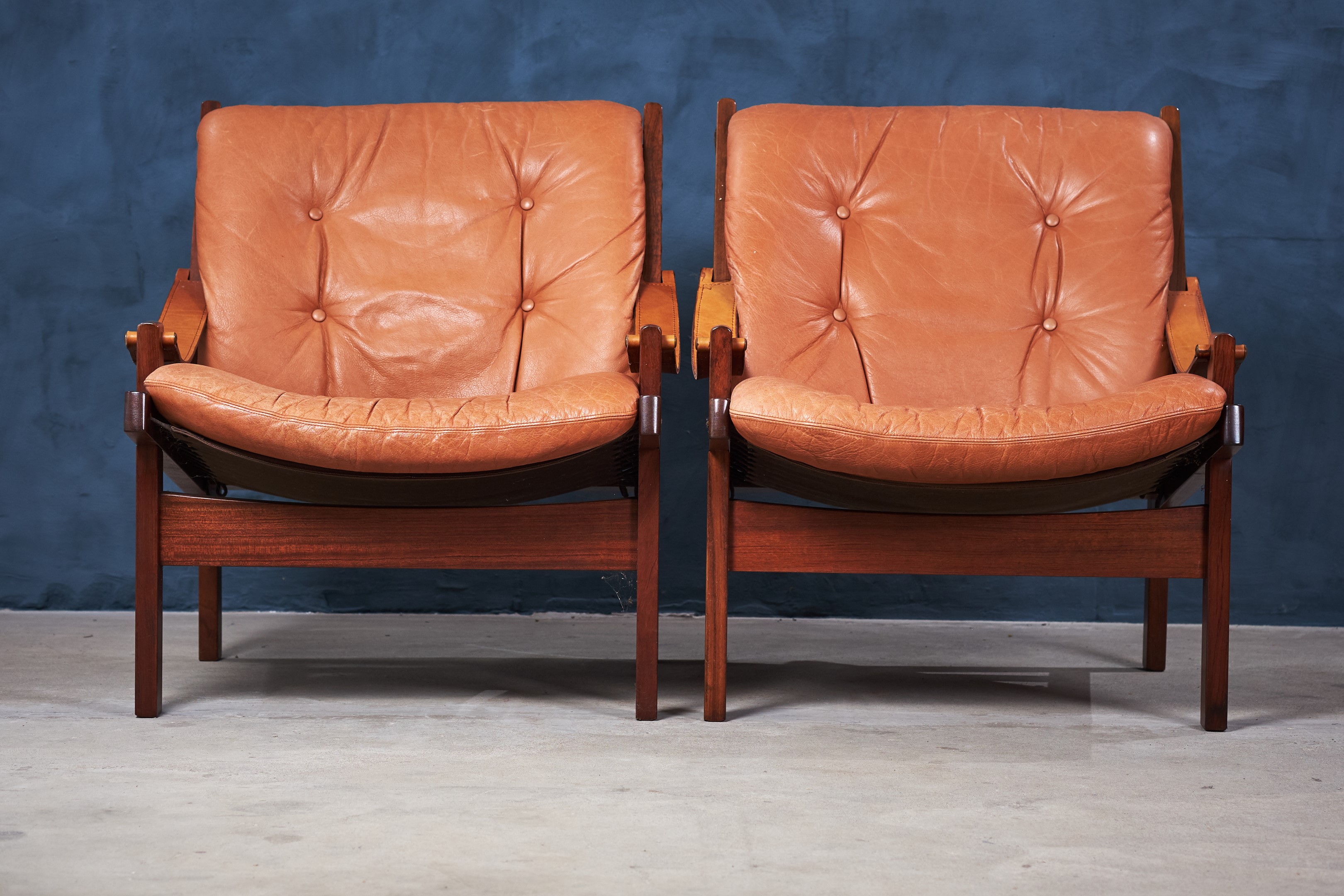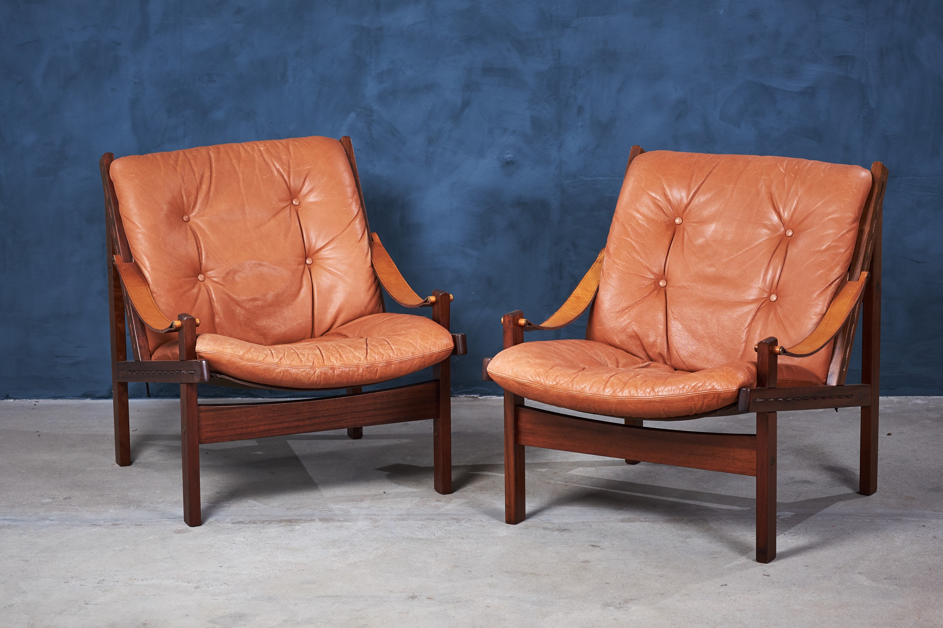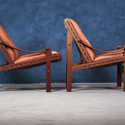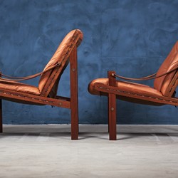 This amazing set of Hunter Safari chairs was designed by Torbjörn Afdal for Bruksbo Norwegen in the 1960s. The set is in great vintage condition and would be a great addition to any modern home. The seats are covered with leather and have a really good seating comfort.