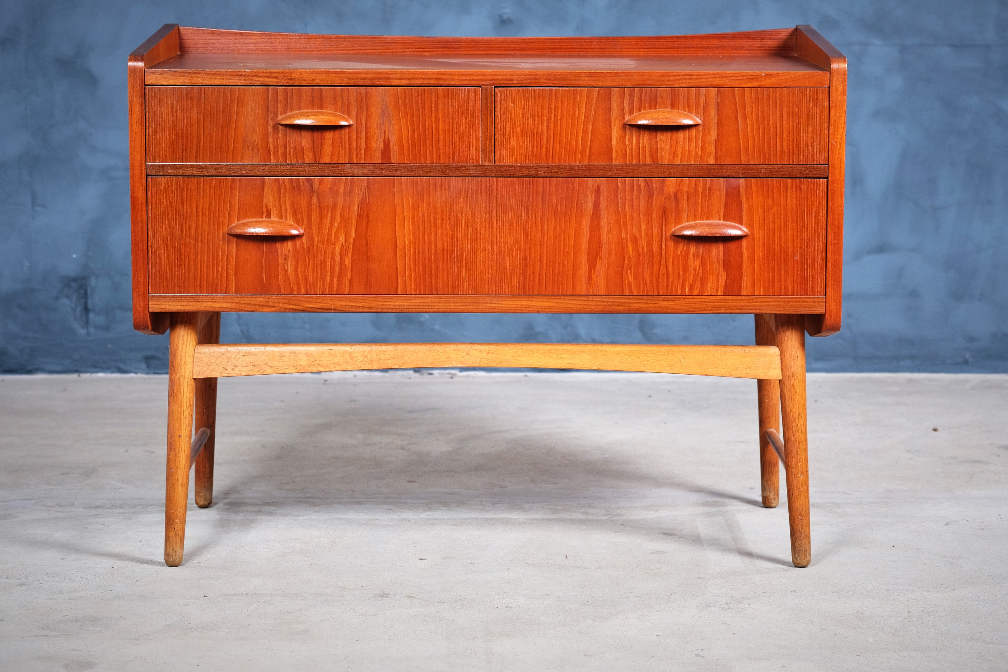 Chest of drawers in teak with a beautiful and elegant frame made of solid oak. Features, two small and one big drawer with lots of storage room. This chest of drawers can be used in your entrance, bedroom, living room etc. At least it is not difficult to find room for this beauty. Would make an great addition to any modern environment.