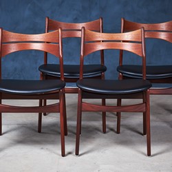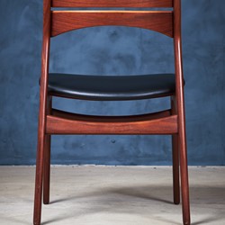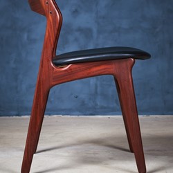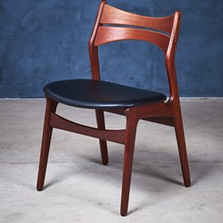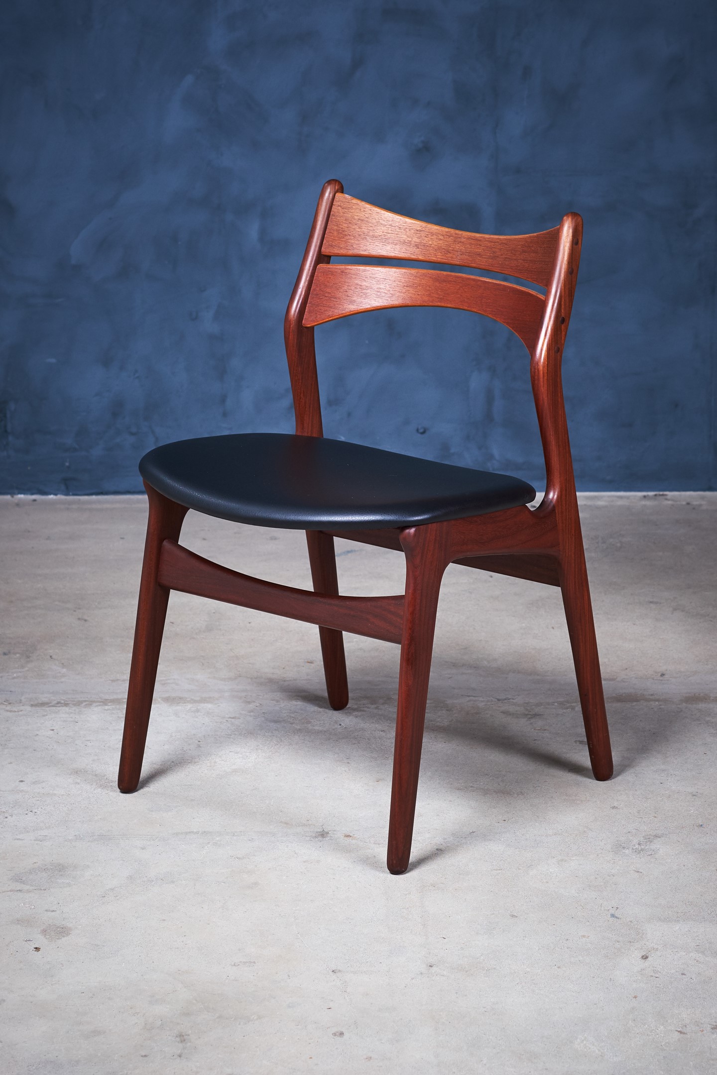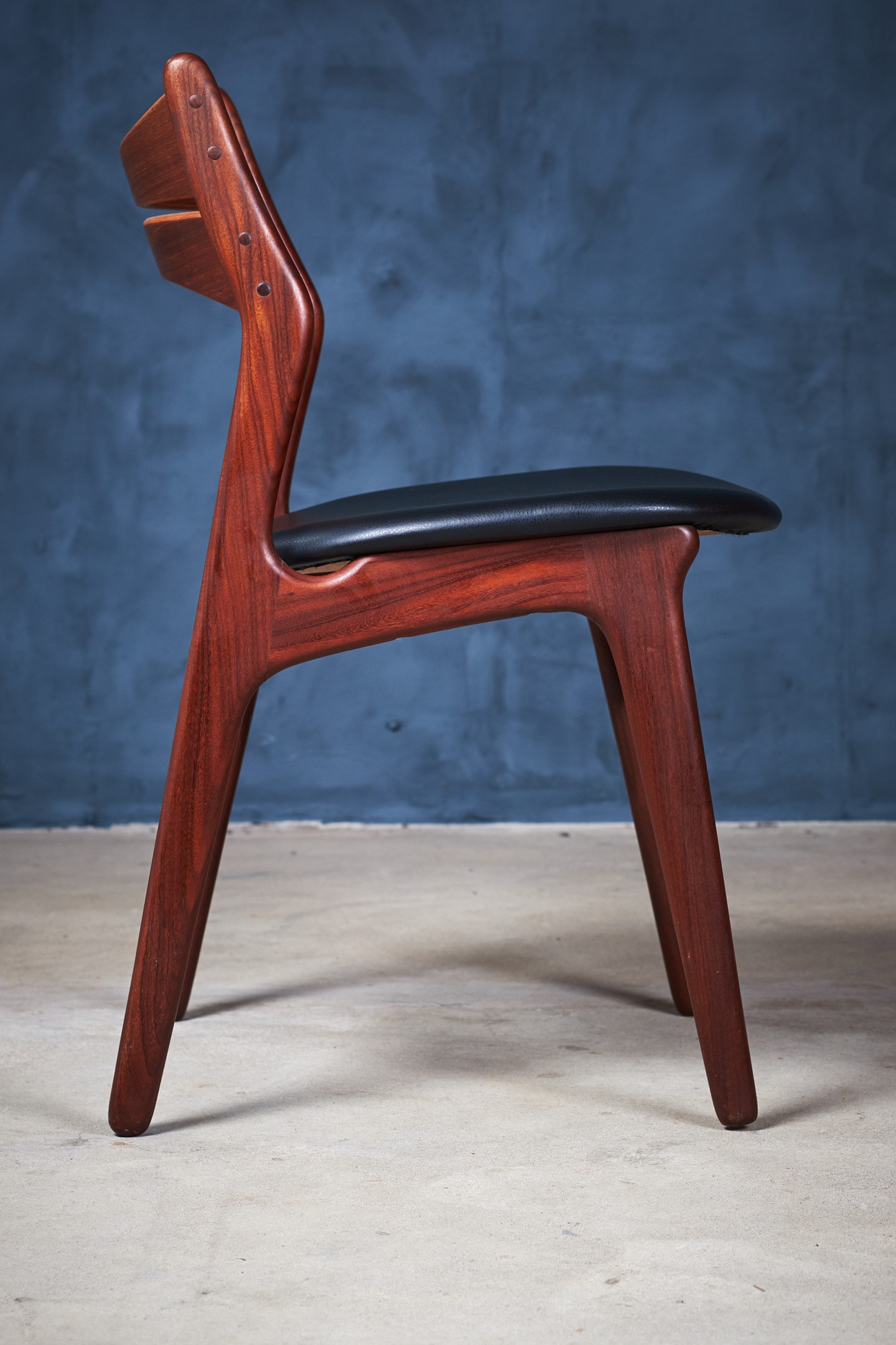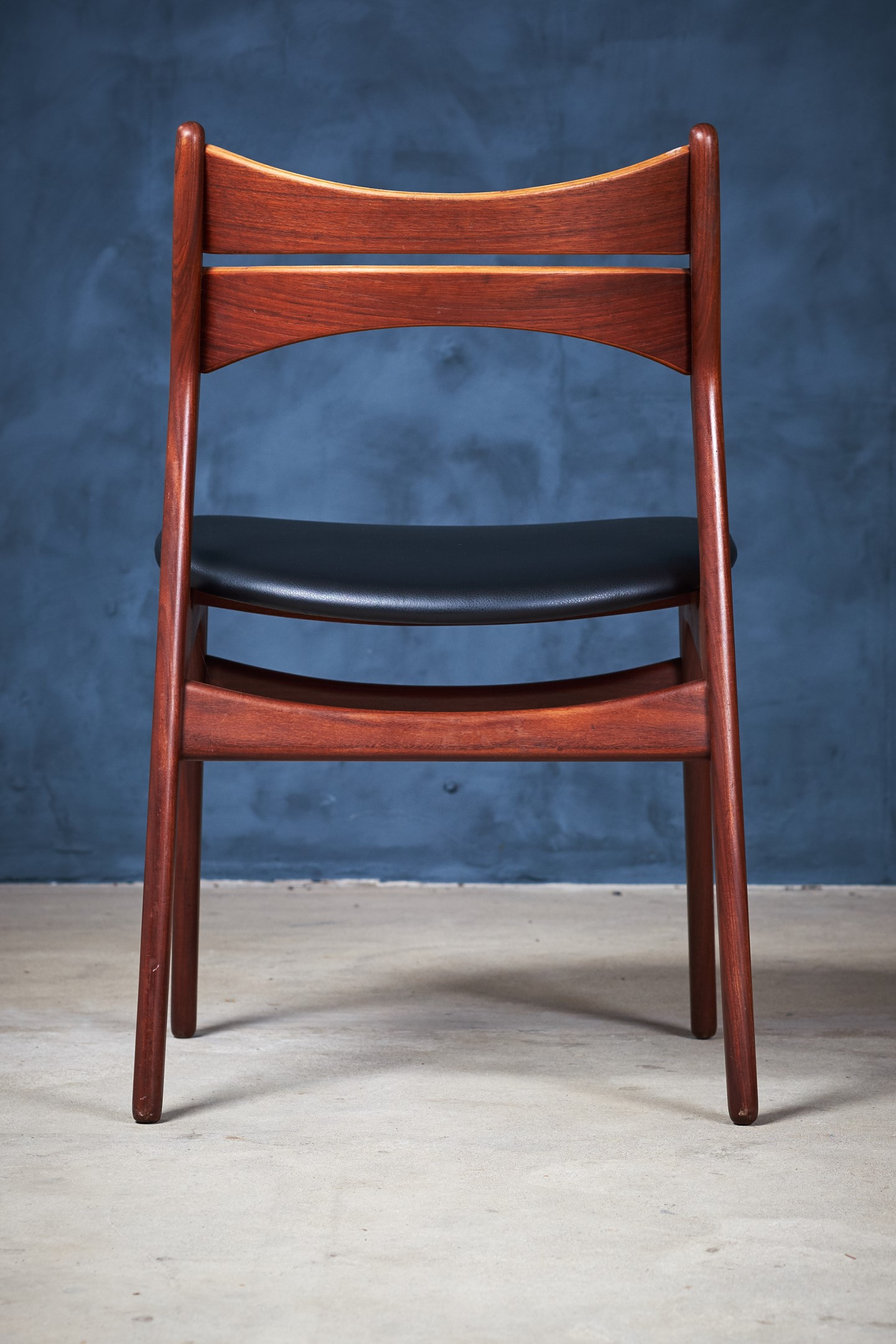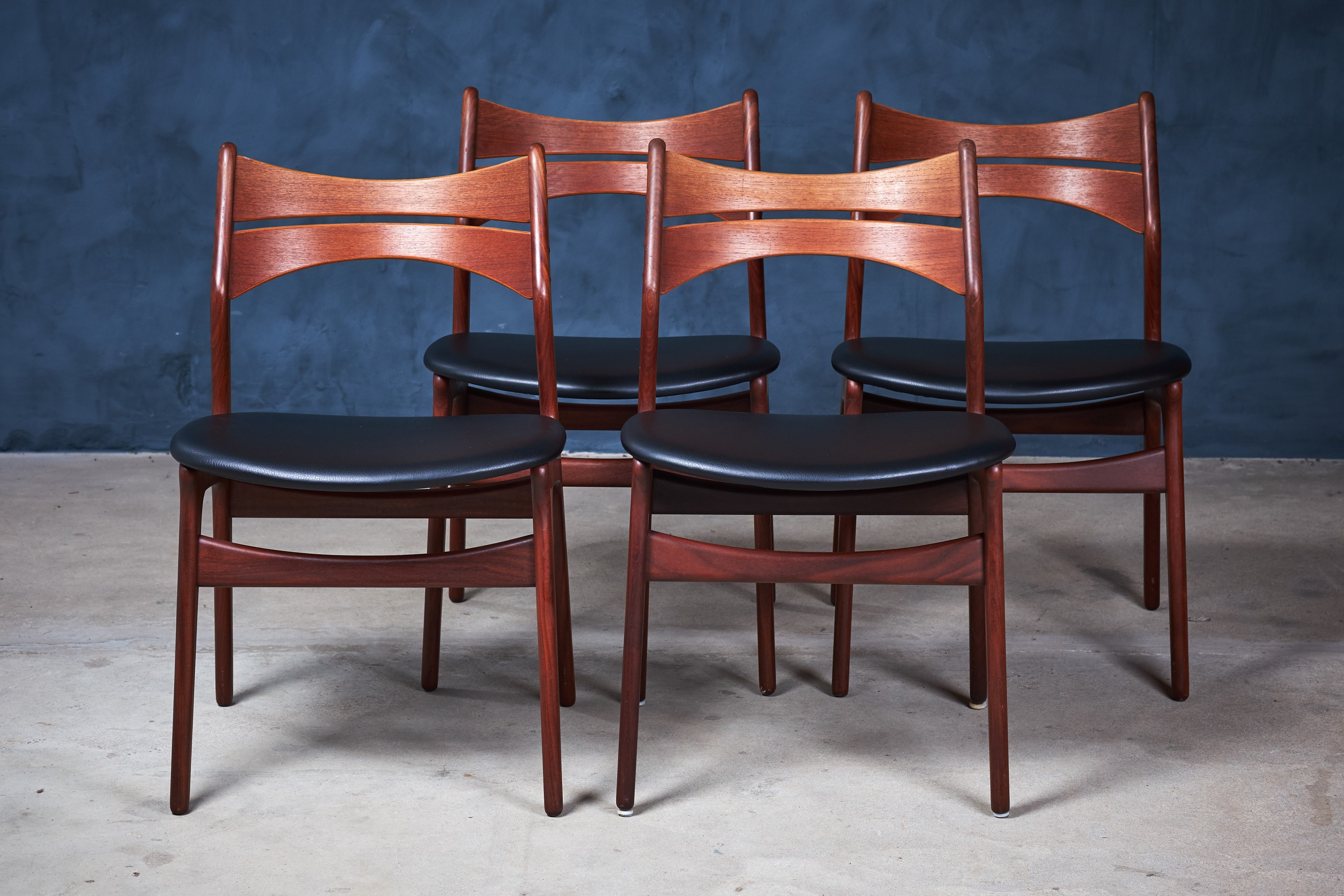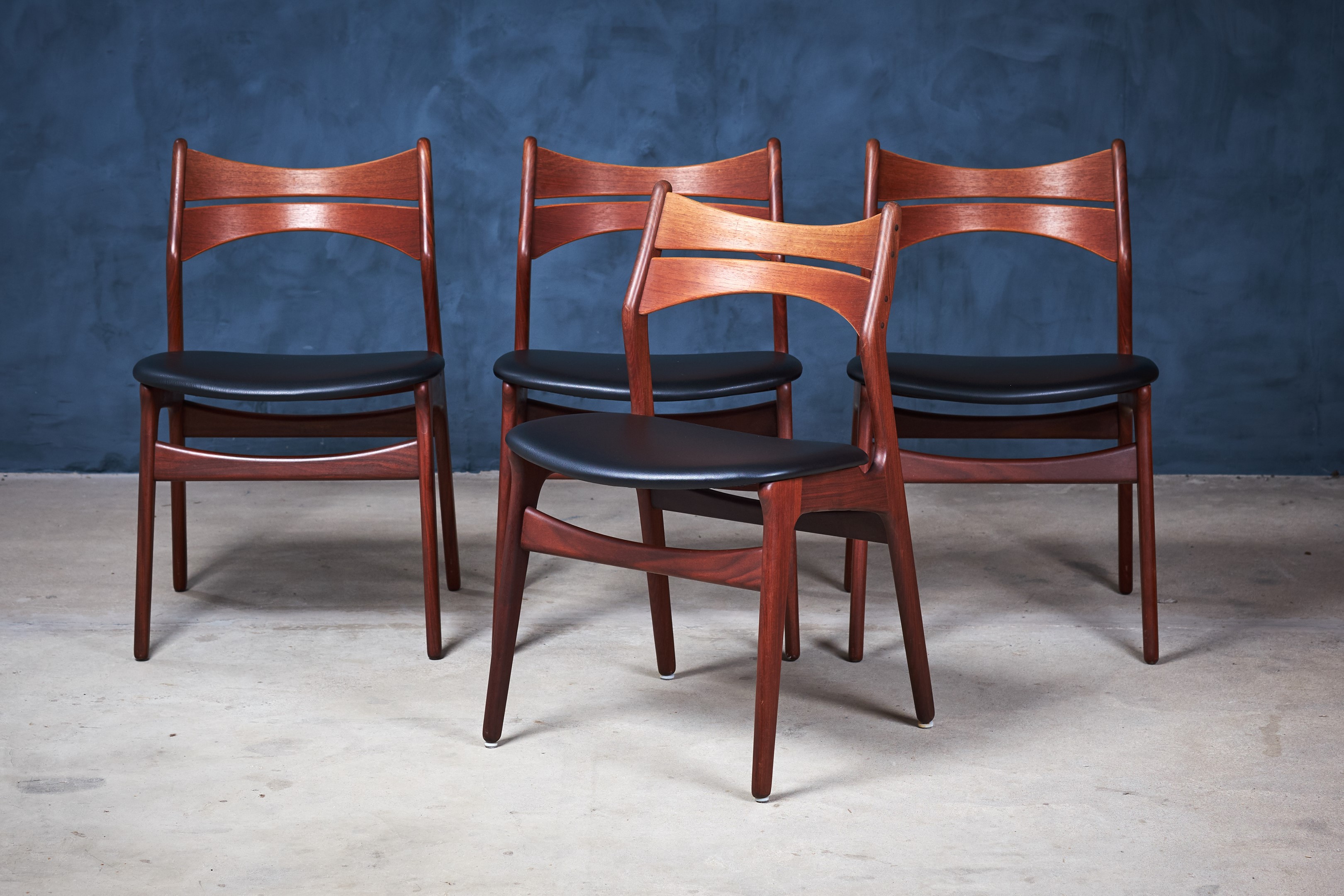 A set of 4 dining chairs in teak #Model 310 by Erik Buch, produced at Christian Christensens Møbelfabrik - gently restored, in really good original vintage condition. Elegant with soft, organic lines and the curvature of the teak backrest and the teak frame supports the human body perfectly, making it an extremely comfortable dining chair. It would add style and class to any dining room. The Model 310 chair is a beautiful example from the Danish modern era, constructed of solid teak frame with curved teak backrest and floating seat. The chairs has been reupholstered with real black leather and new foam.