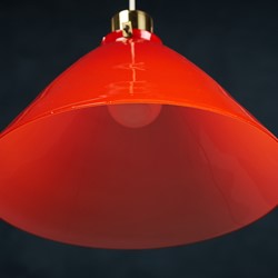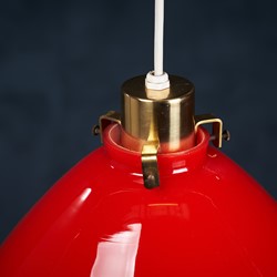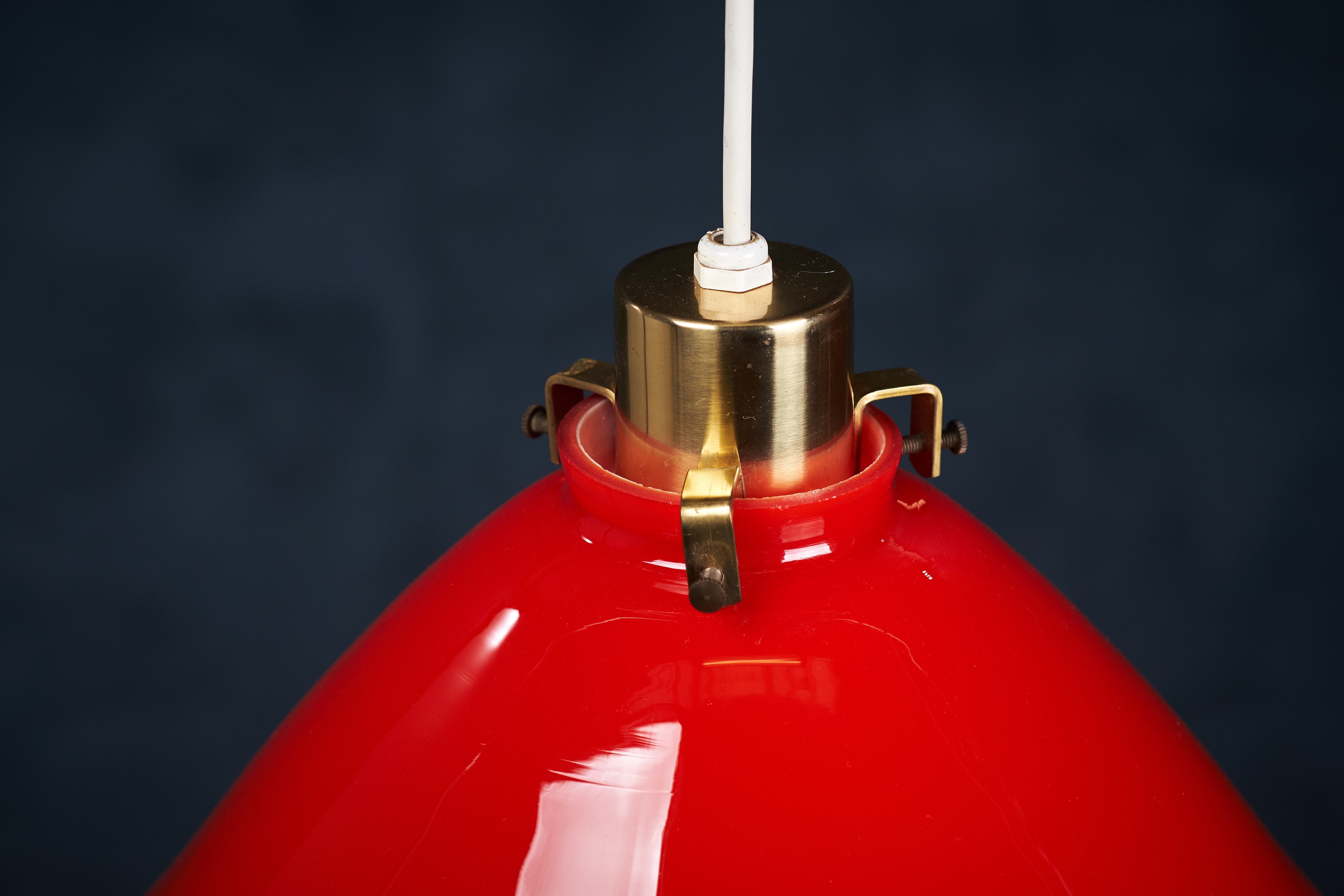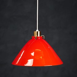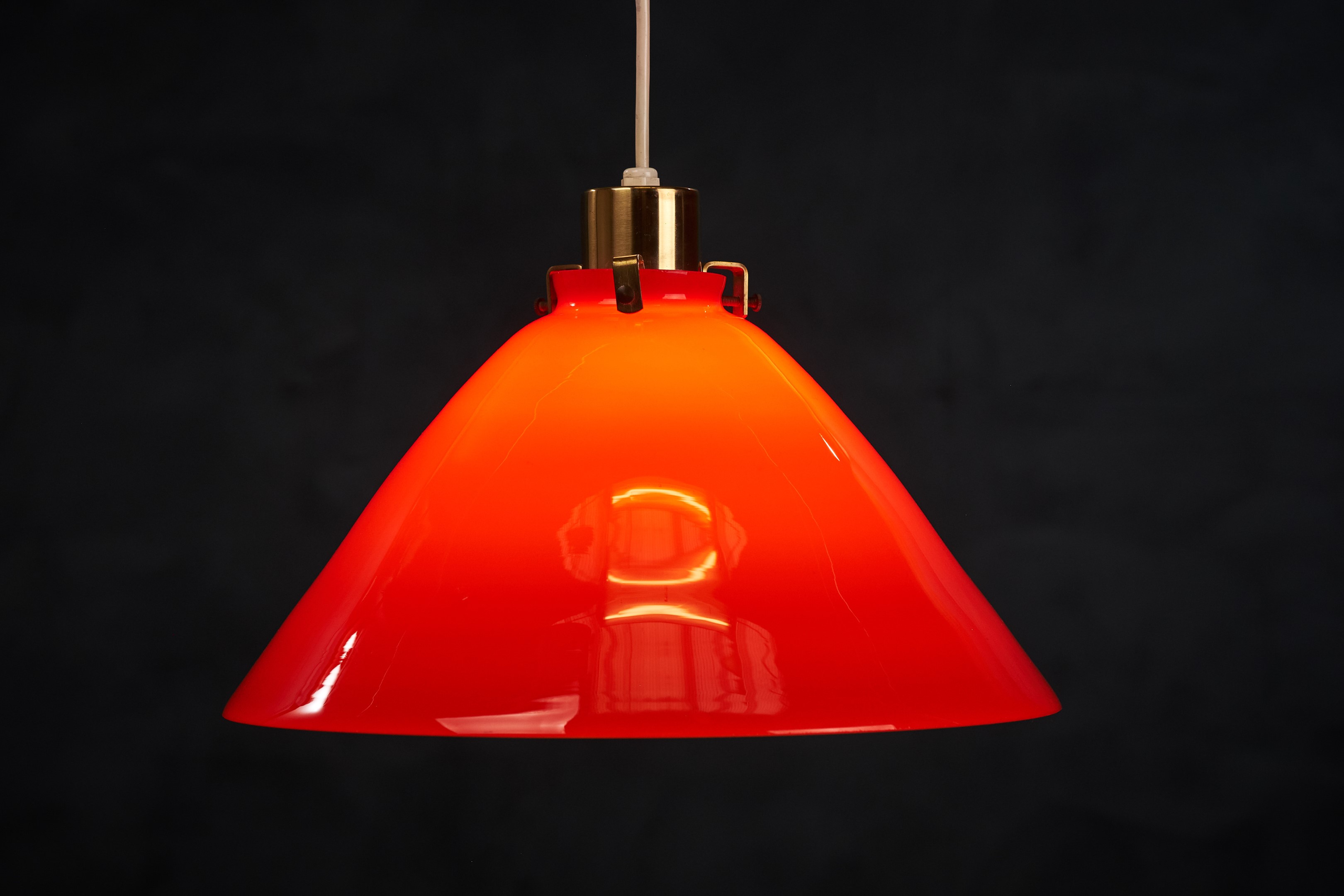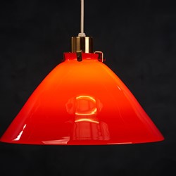 This orange glass pendant lamp was designed in Denmark, circa 1970s. Top in brass. The style is reminiscent of Holmegaard. It would be a beautiful addition to any kitchen or dining table, or perhaps in a living space spreading a warm light. All original, but rewired with 2 m (6′ 6.7″) white plastic cord – for safety and beauty. Tested and fully functional. Cleaned, labeled and packed in protective plastic cover.