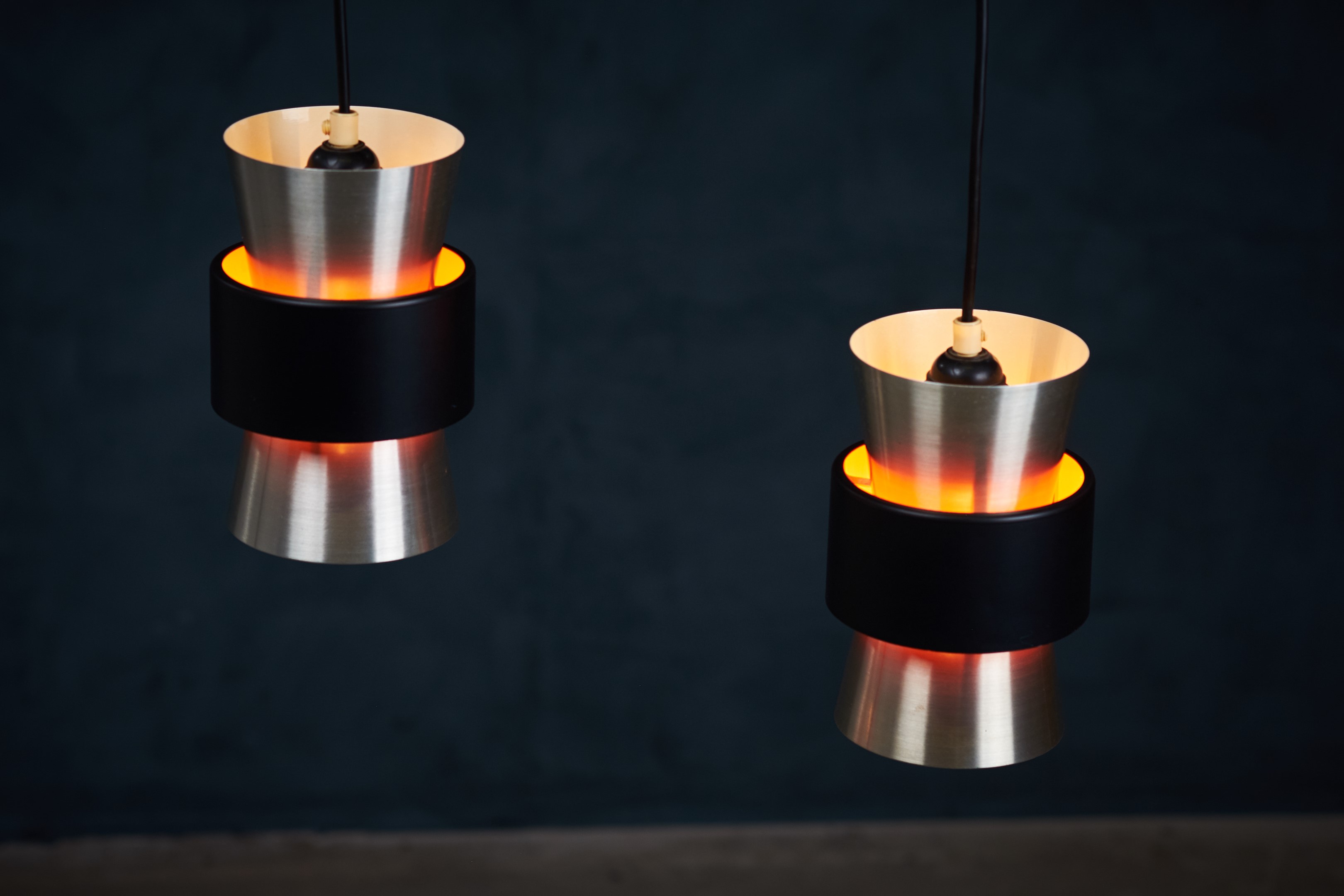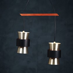 Pair of pendant lamps, Danish design, 1960s. Beautiful lamps in great vintage condition. The outer shade dimmers the light and throws it out in a fantastic way. It would be a beautiful addition to any lonely corner in the house or dining table, or perhaps in a living space spreading a warm light. All original, but rewired with 2 m (6′ 6.7″) black plastic cord – for safety and beauty. Tested and fully functional. Cleaned, labeled and packed in protective plastic cover.