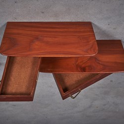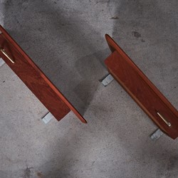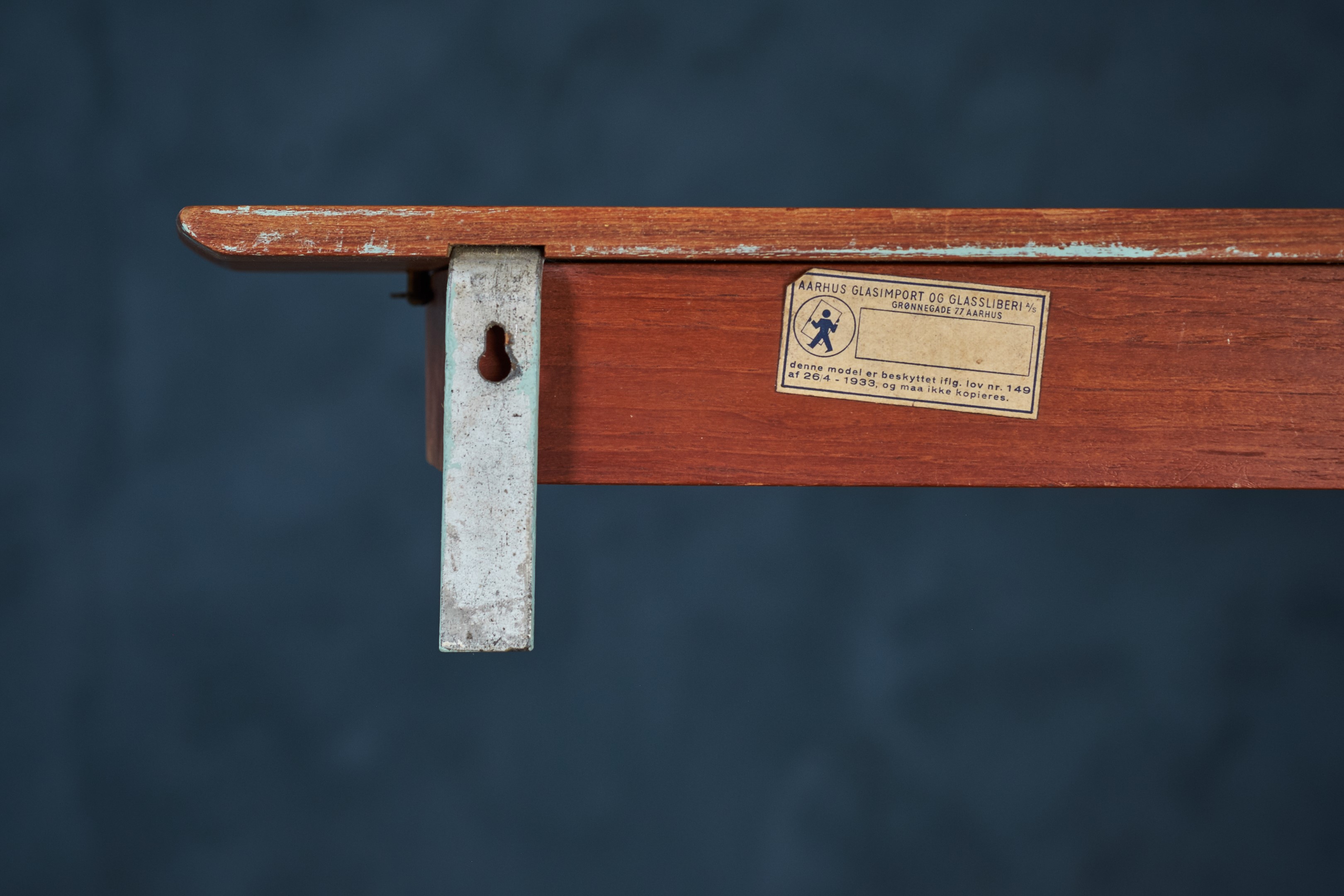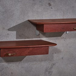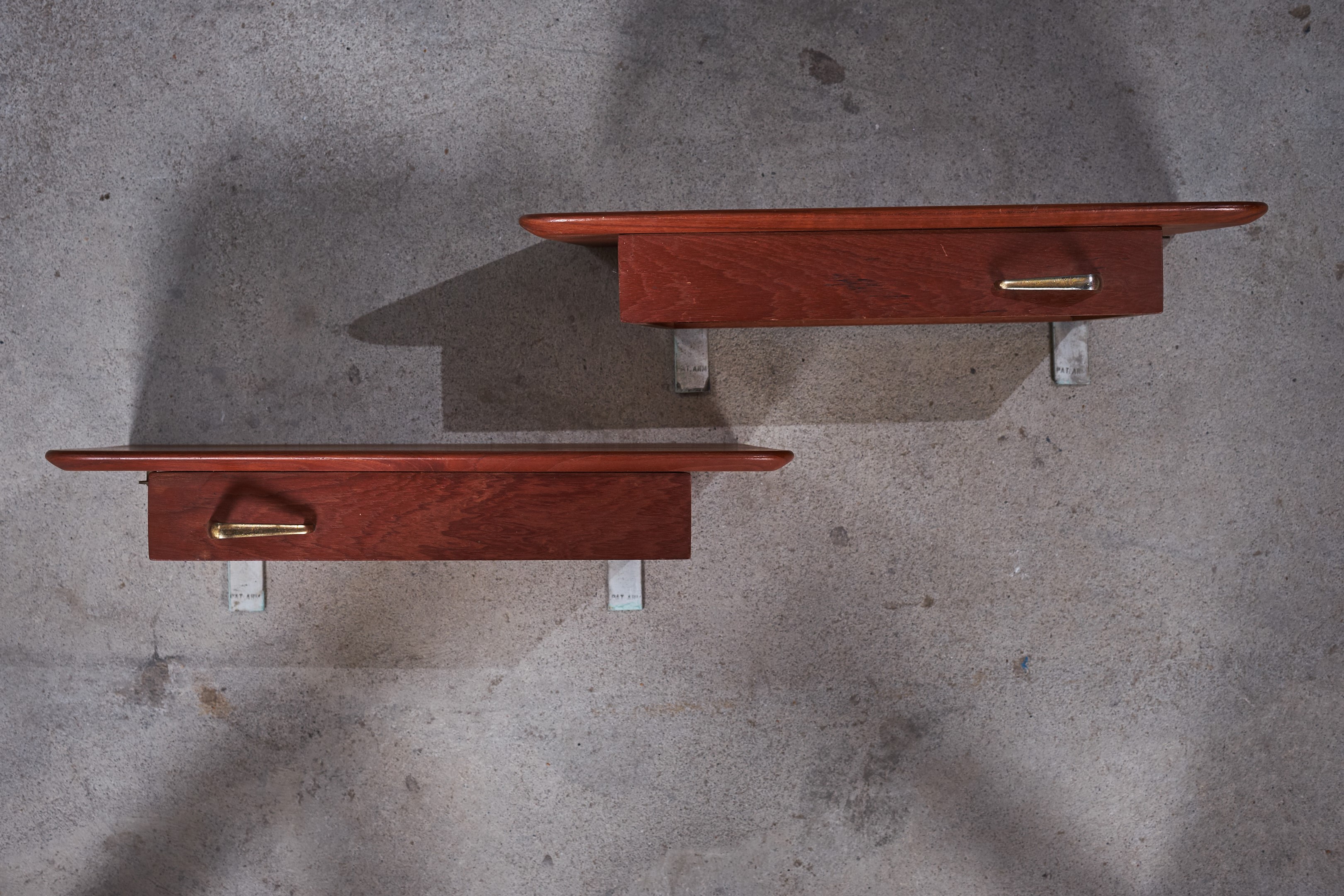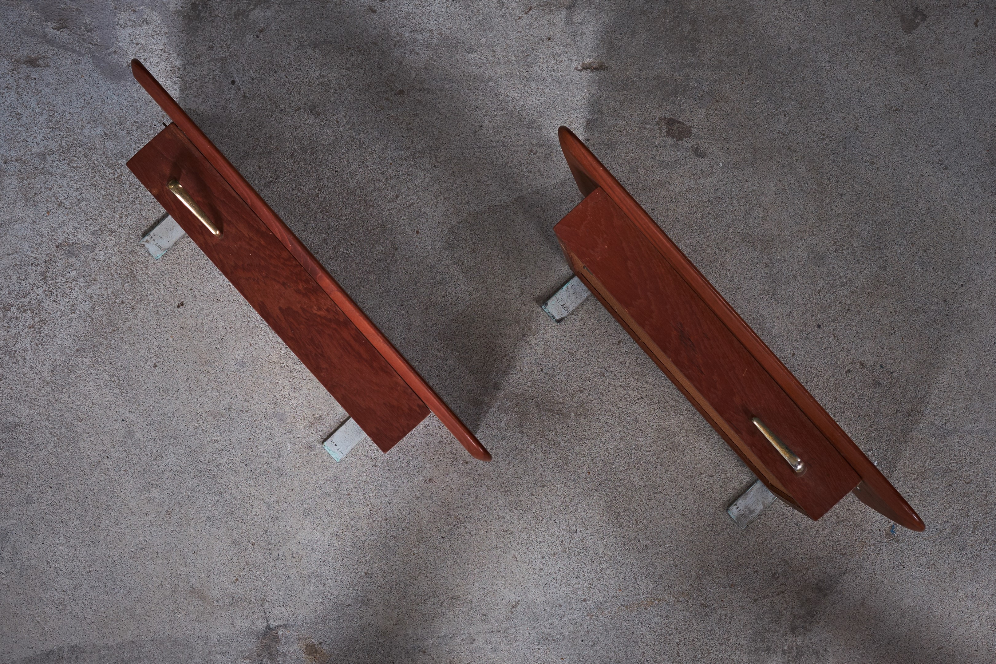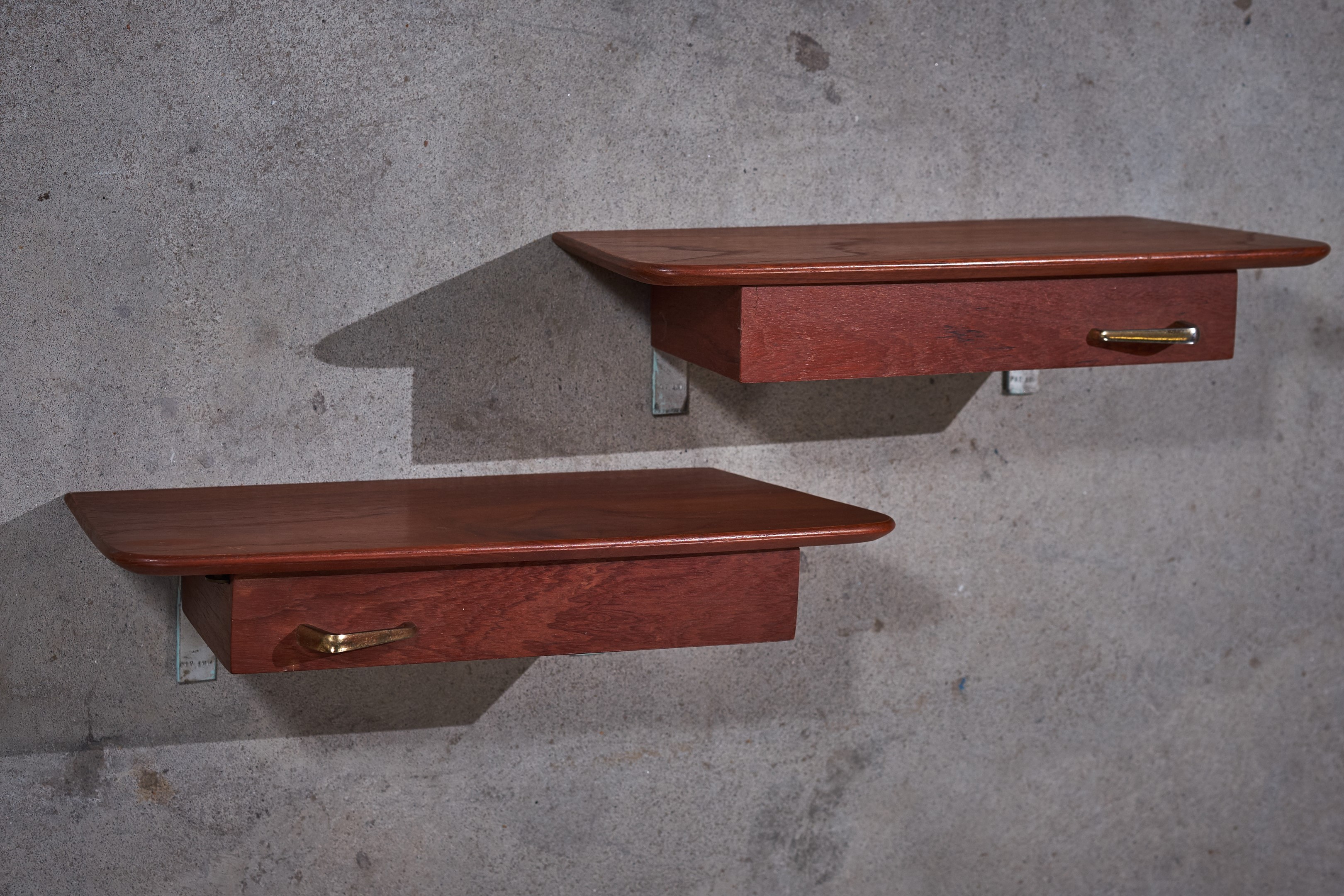 A pair of teak wall mountable floating nightstands. Made in Denmark, circa 1960. Unusual design and in great vintage condition. Very light and elegant design. If you prefer the item will polished and shined before shipping.