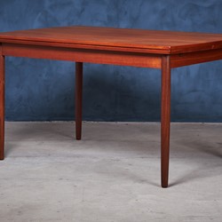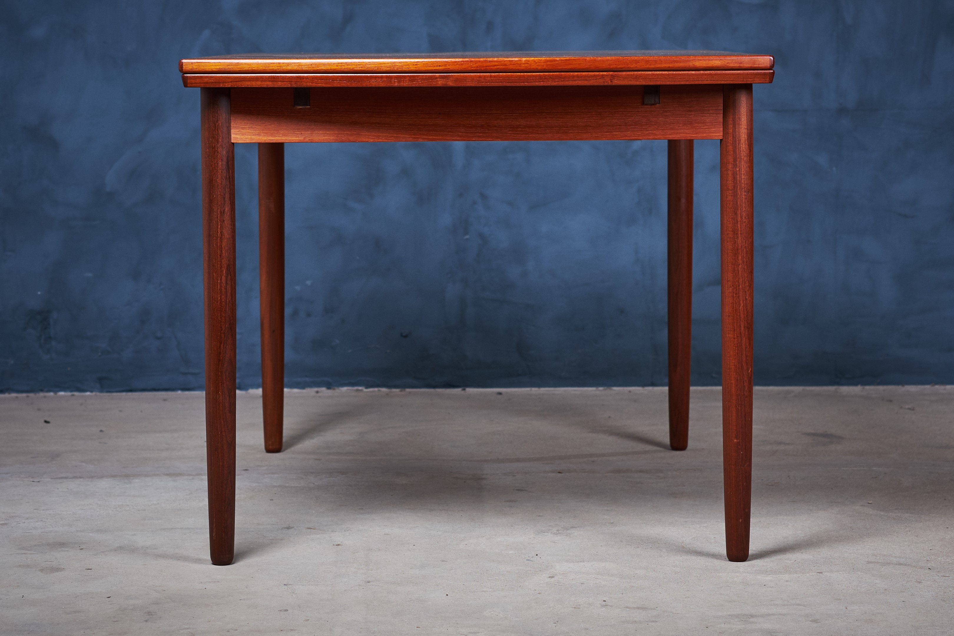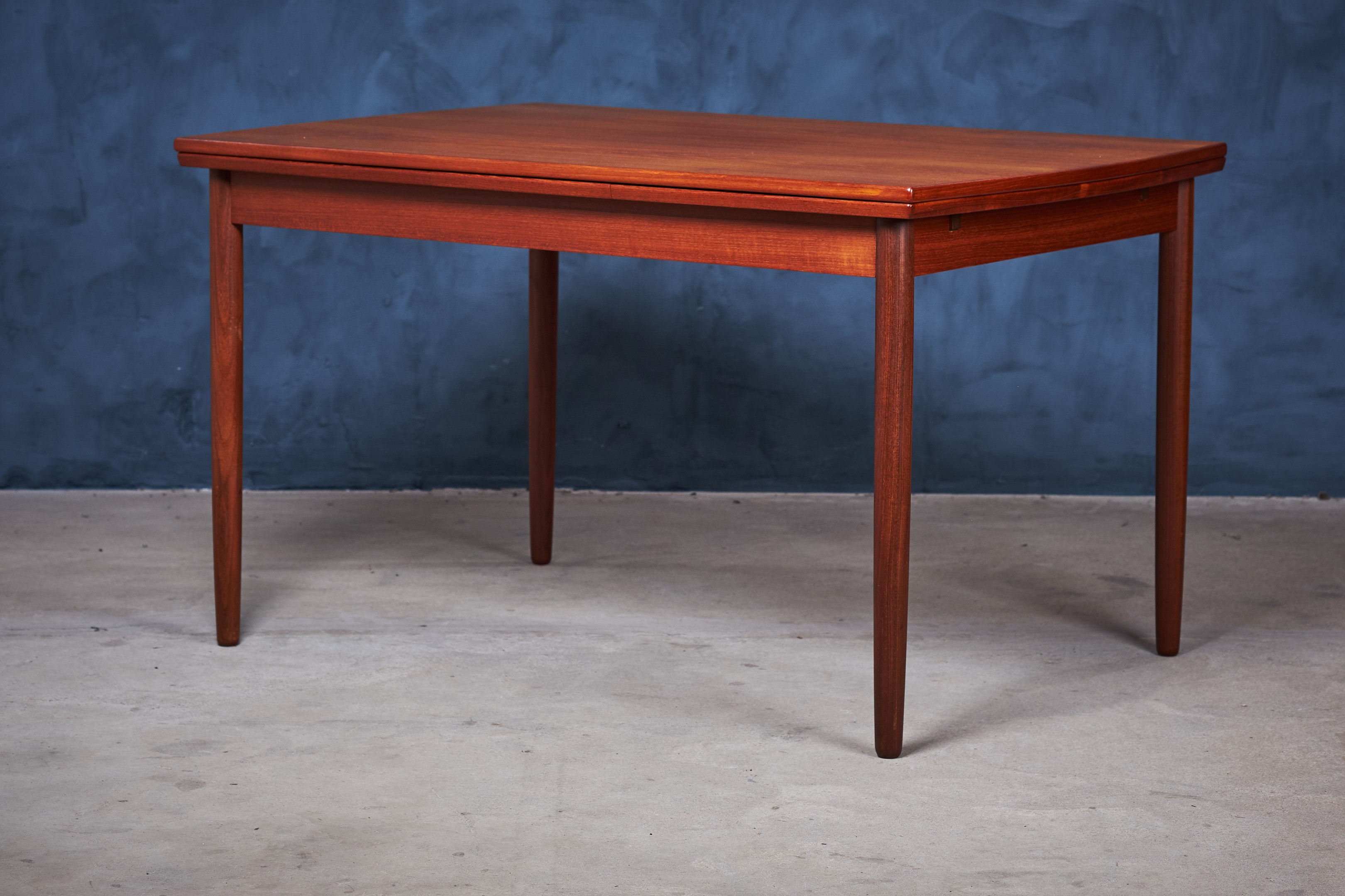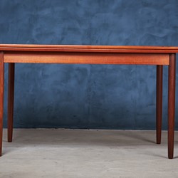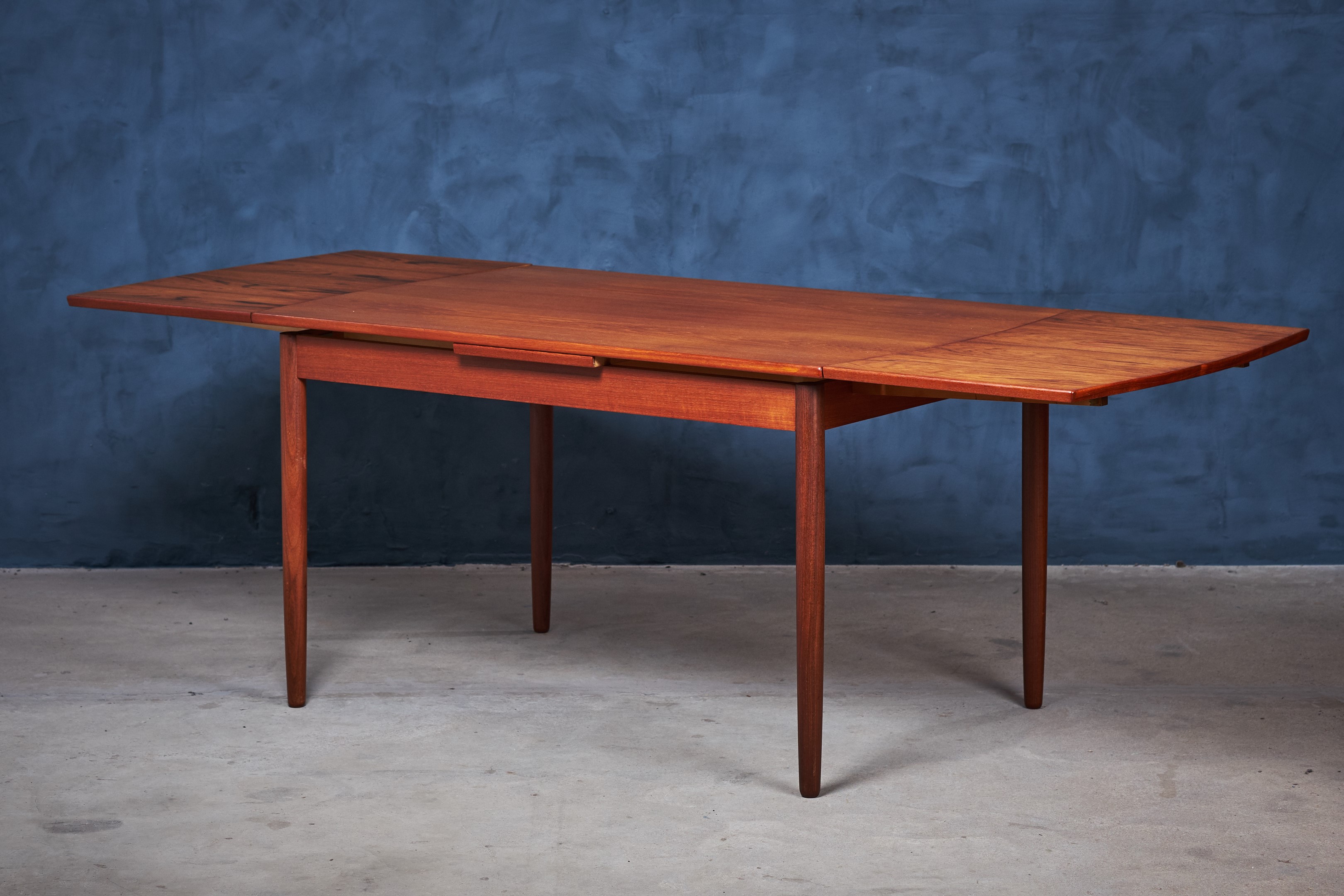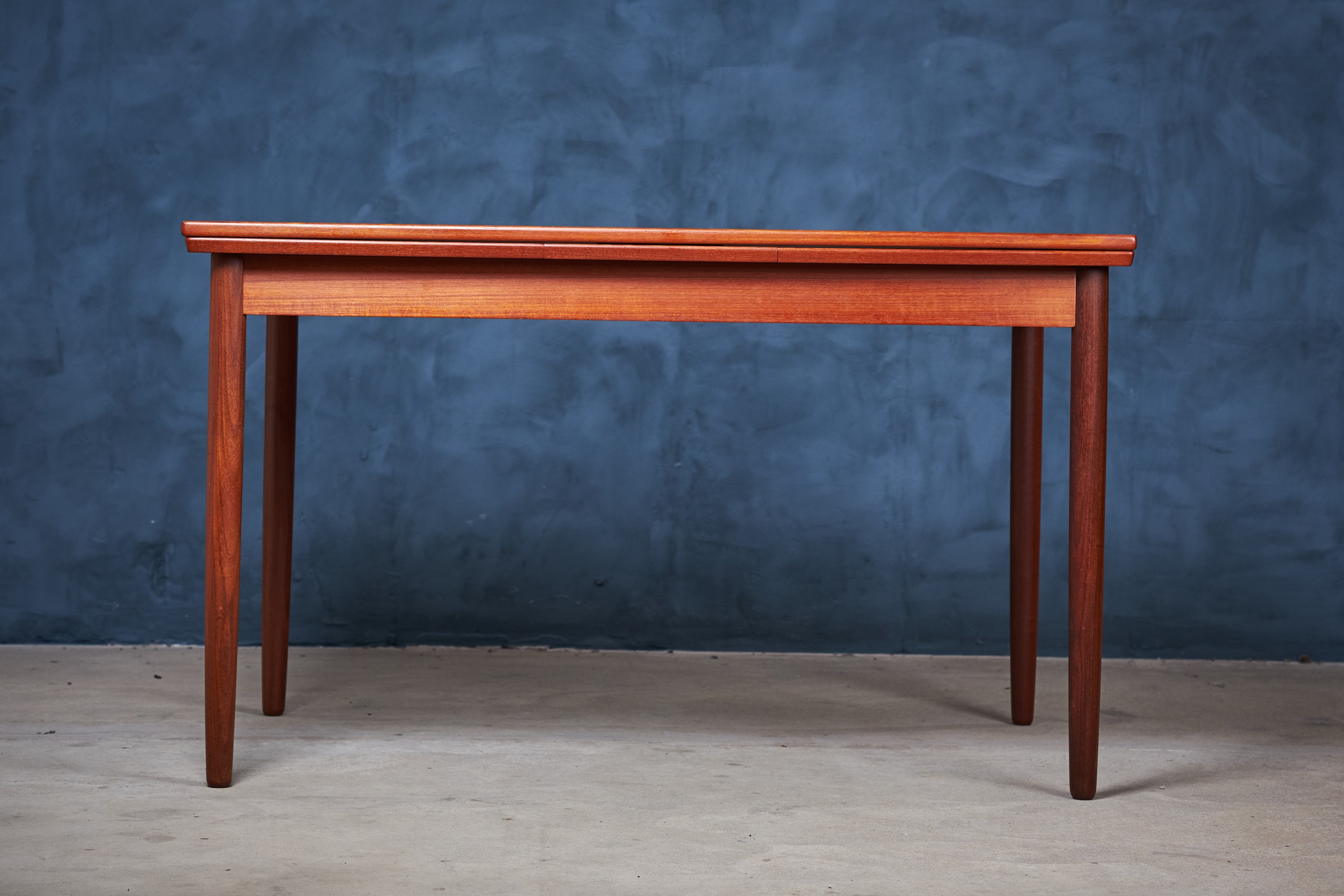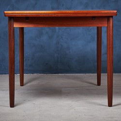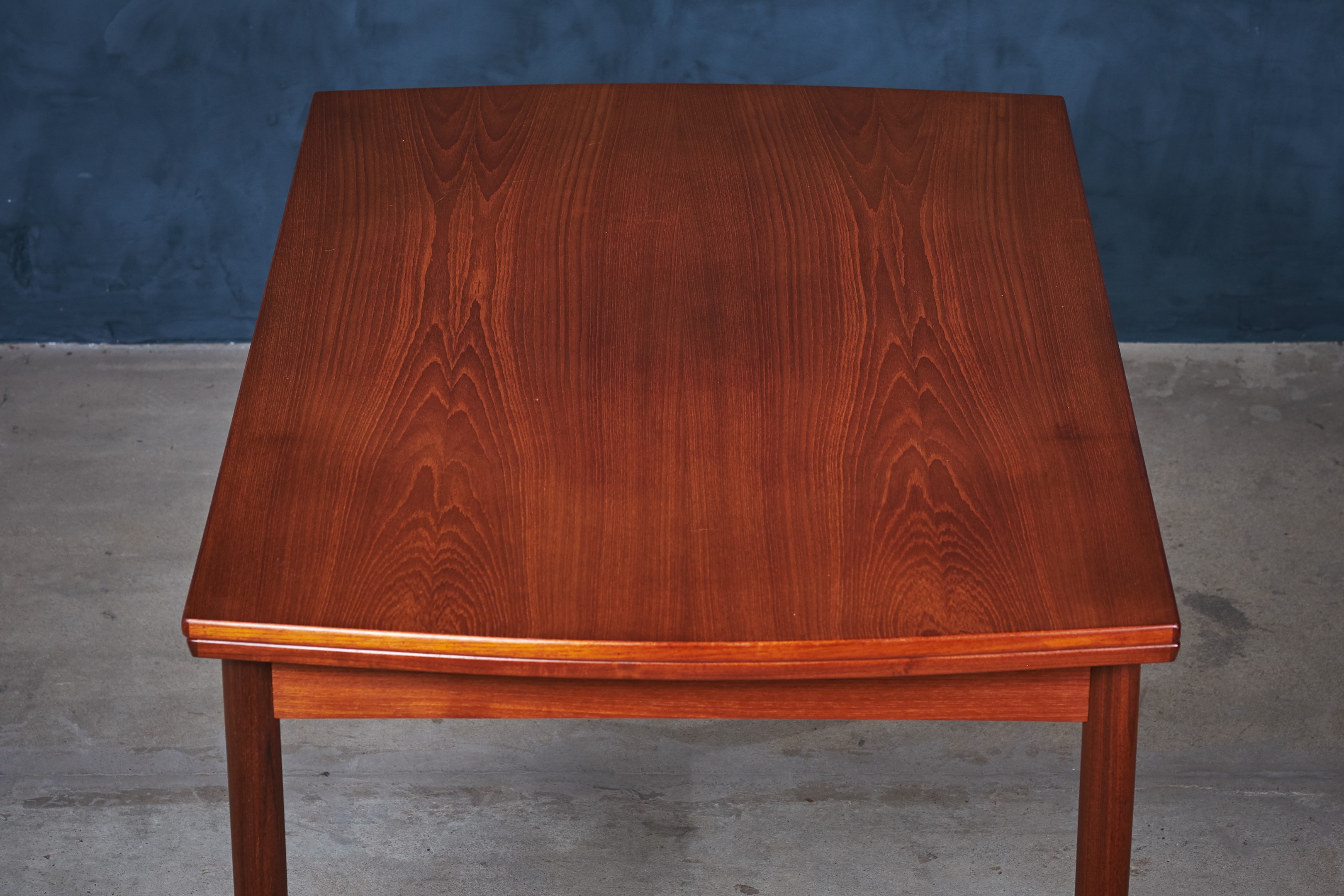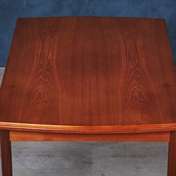 Teak dining table with 2 hidden extensions leafs and rounded edges. Seats 6 to 10 people. This beautiful vintage dining table is perfect for typical use and for those special occasions where you have guests over. It is made out of teak and features a curved edge. This table comfortably seats up to 10-12 when fully extended. The draw-leaves pull straight out from under the main table top and operate independent of each other. The leaves raise up to the same level as the main top and remains stable when pulled out. The main top does not move at all when the leaves are in or out. Total length when extended is around: 222cm