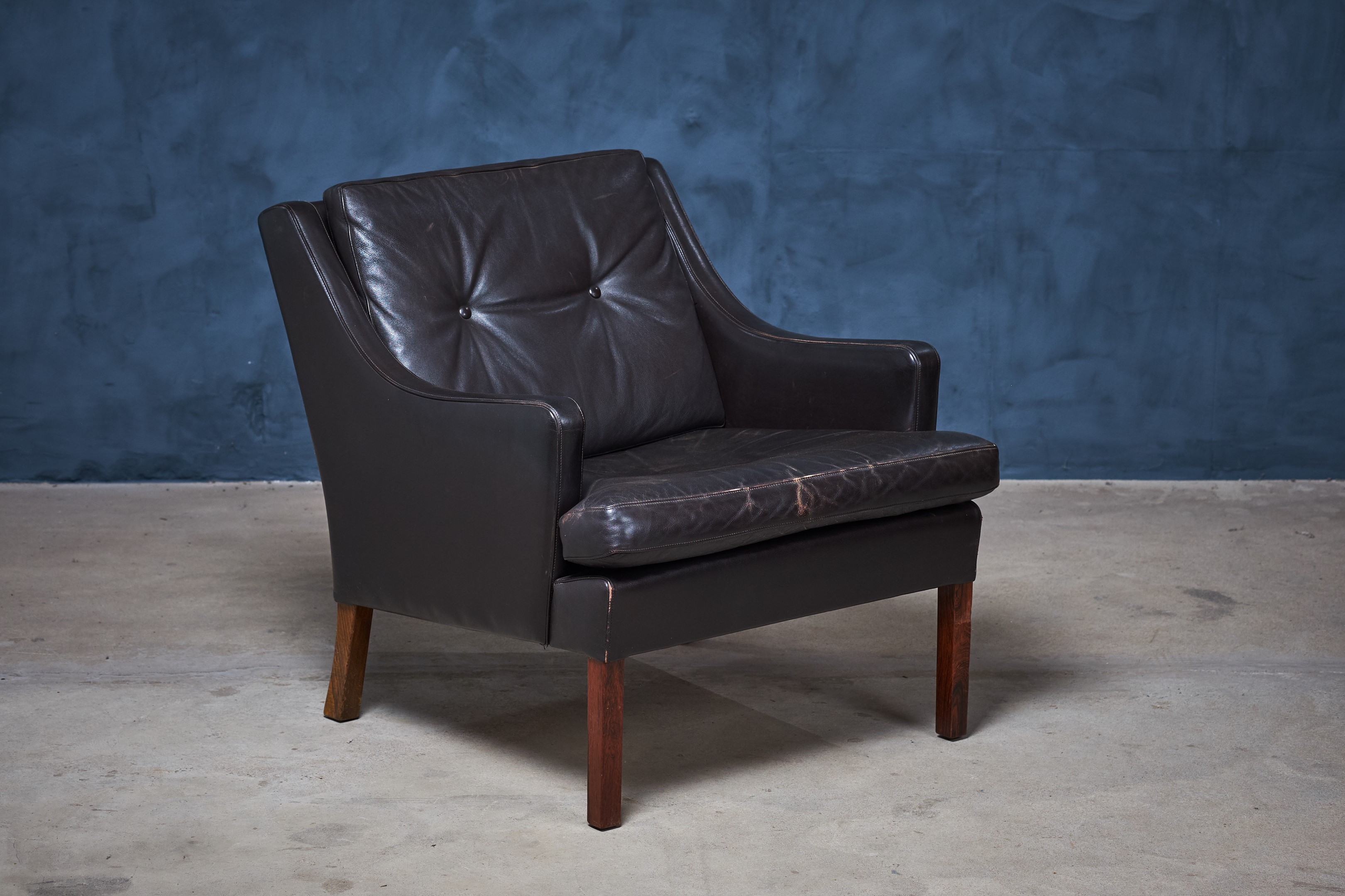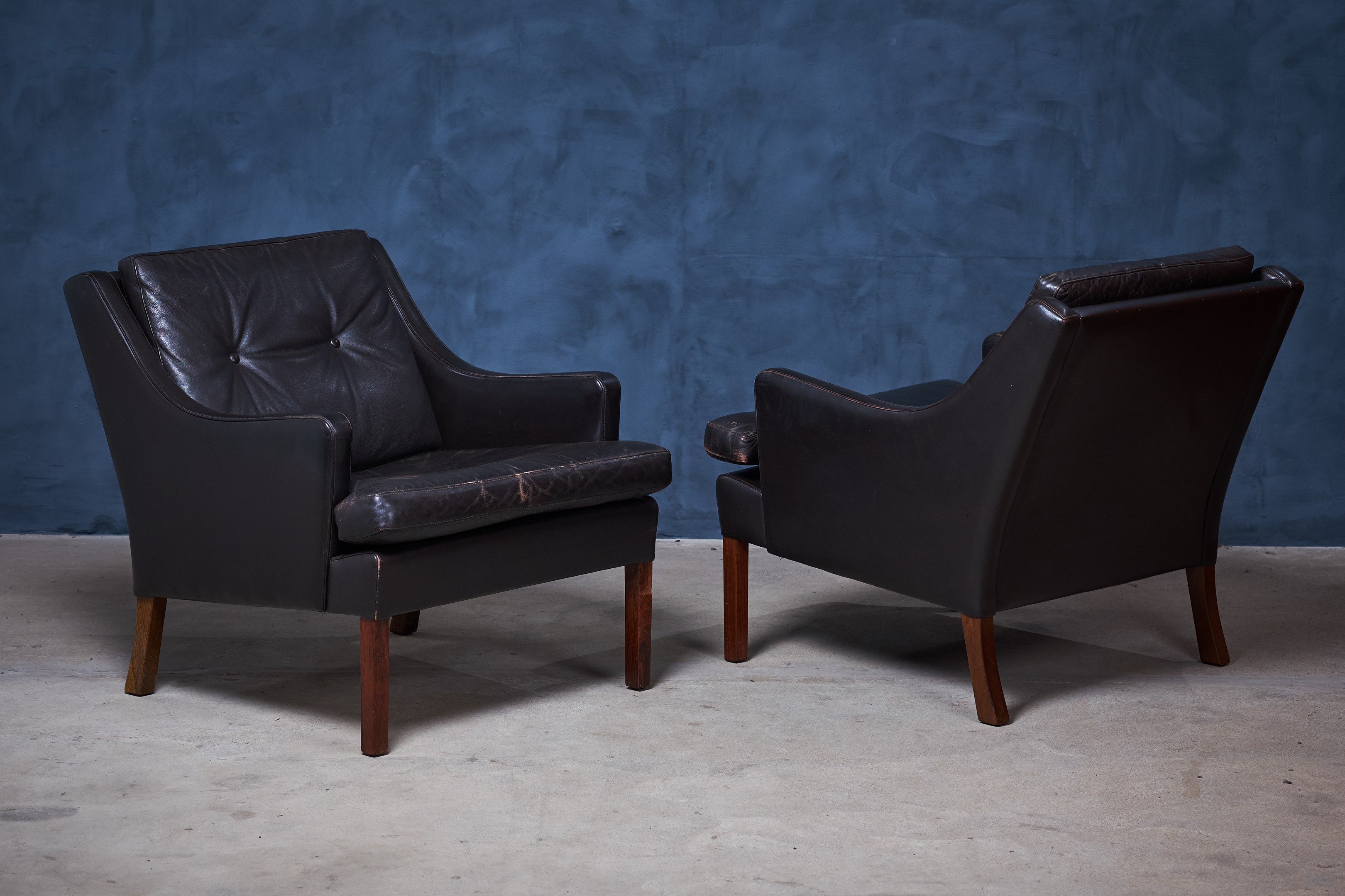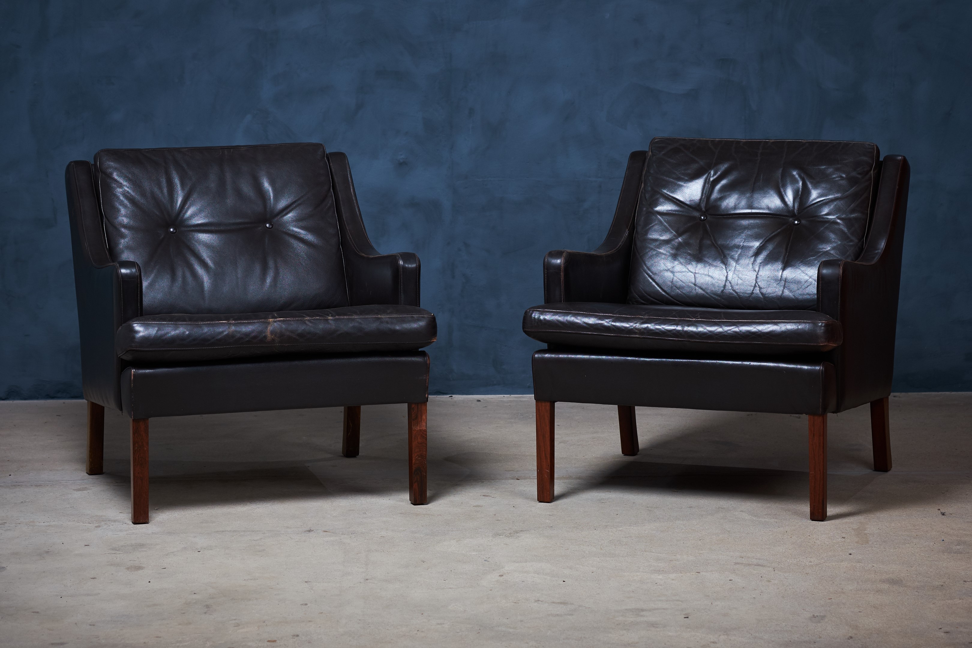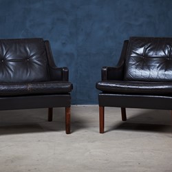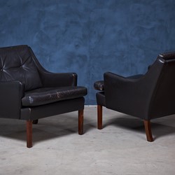 Beautiful pair of Danish lounge chairs with black/brown leather and legs in rosewood. Great seating comfort and a beautiful set for the modern home. Both of the chairs are in good vintage condition, with no holes or deep scratches in the leather. If you like we can polish it with leather wax before to make them look more shiny. That is up to the customer. This set would make a great addition to most modern environments.